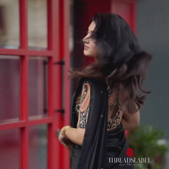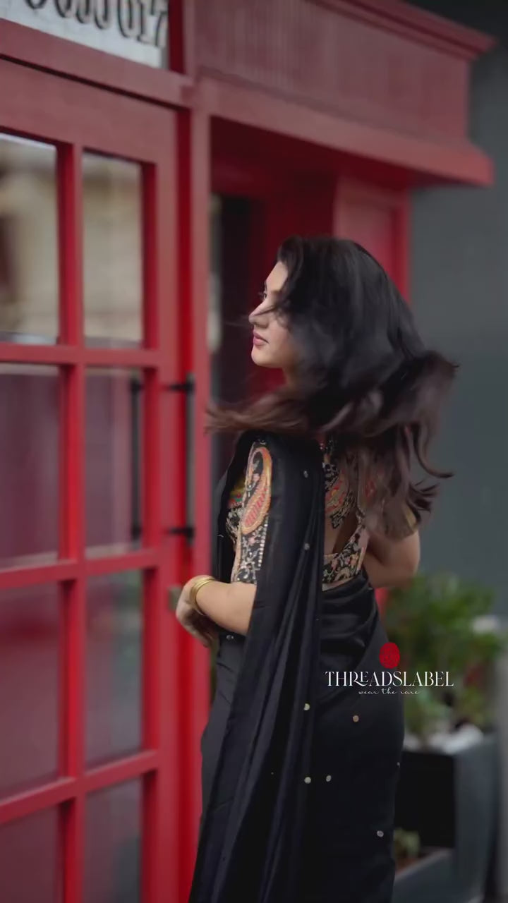 Black pure malai chanderi cotton saree comes with embroidery works all over saree is paired up with black silk blouse having floral kalamkari embroidery works all over blouse