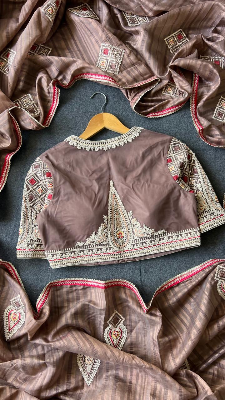 Caramel pure muslin silk designer saree with heavy paisely embroidery works all over saree & triangle scalloped border works is paired up with matching heavy intricate embroidery worked blouse.