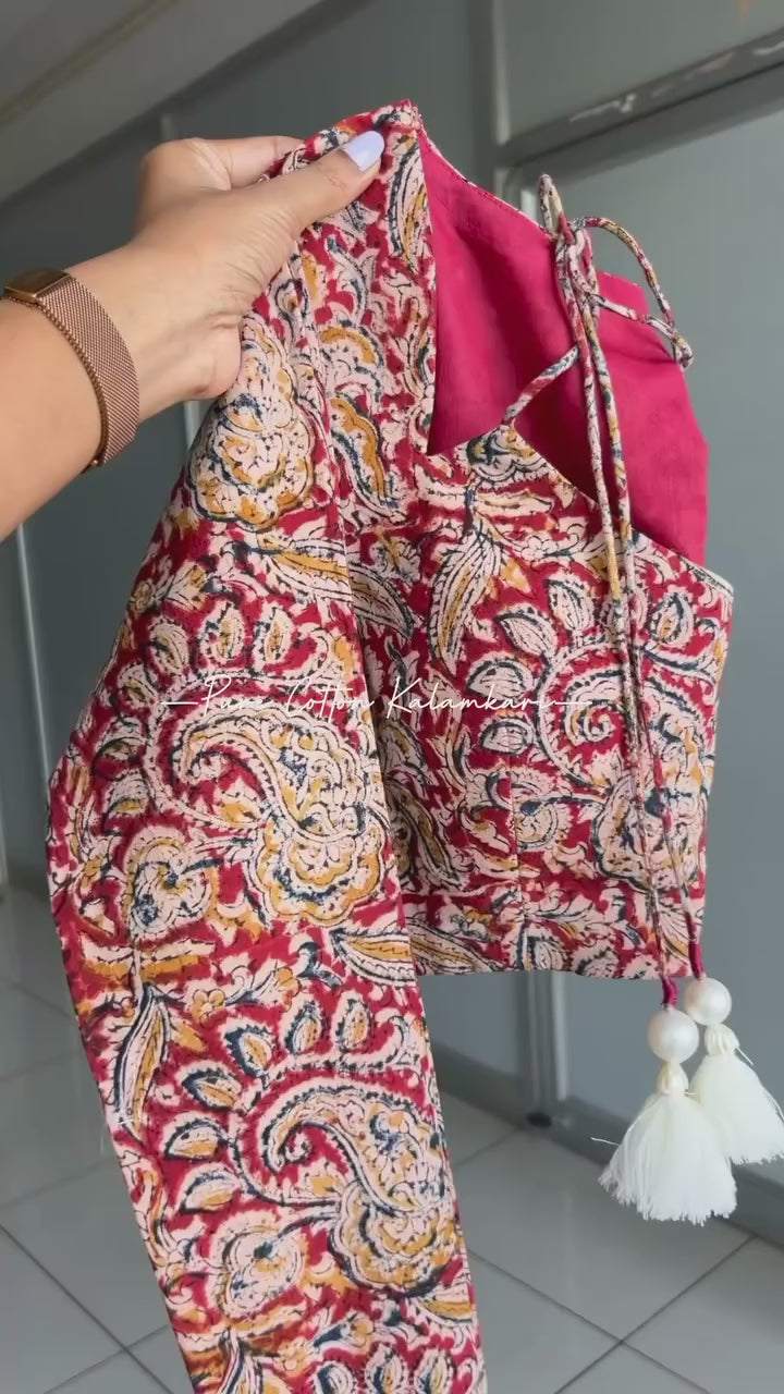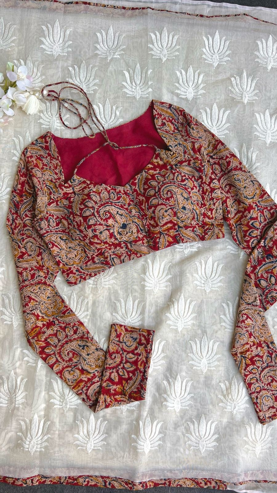 * Works : Highlighted floral embroidery kalamkari hand block print works all over blouse as shown