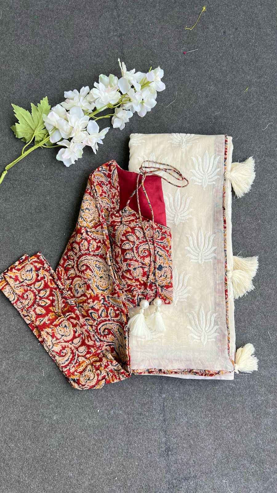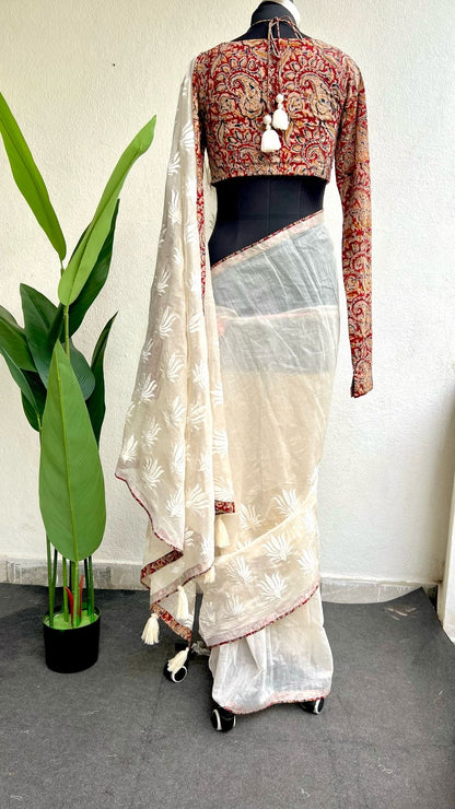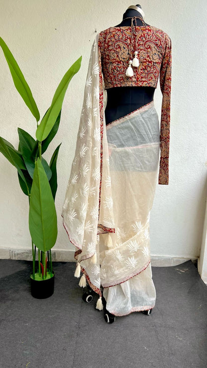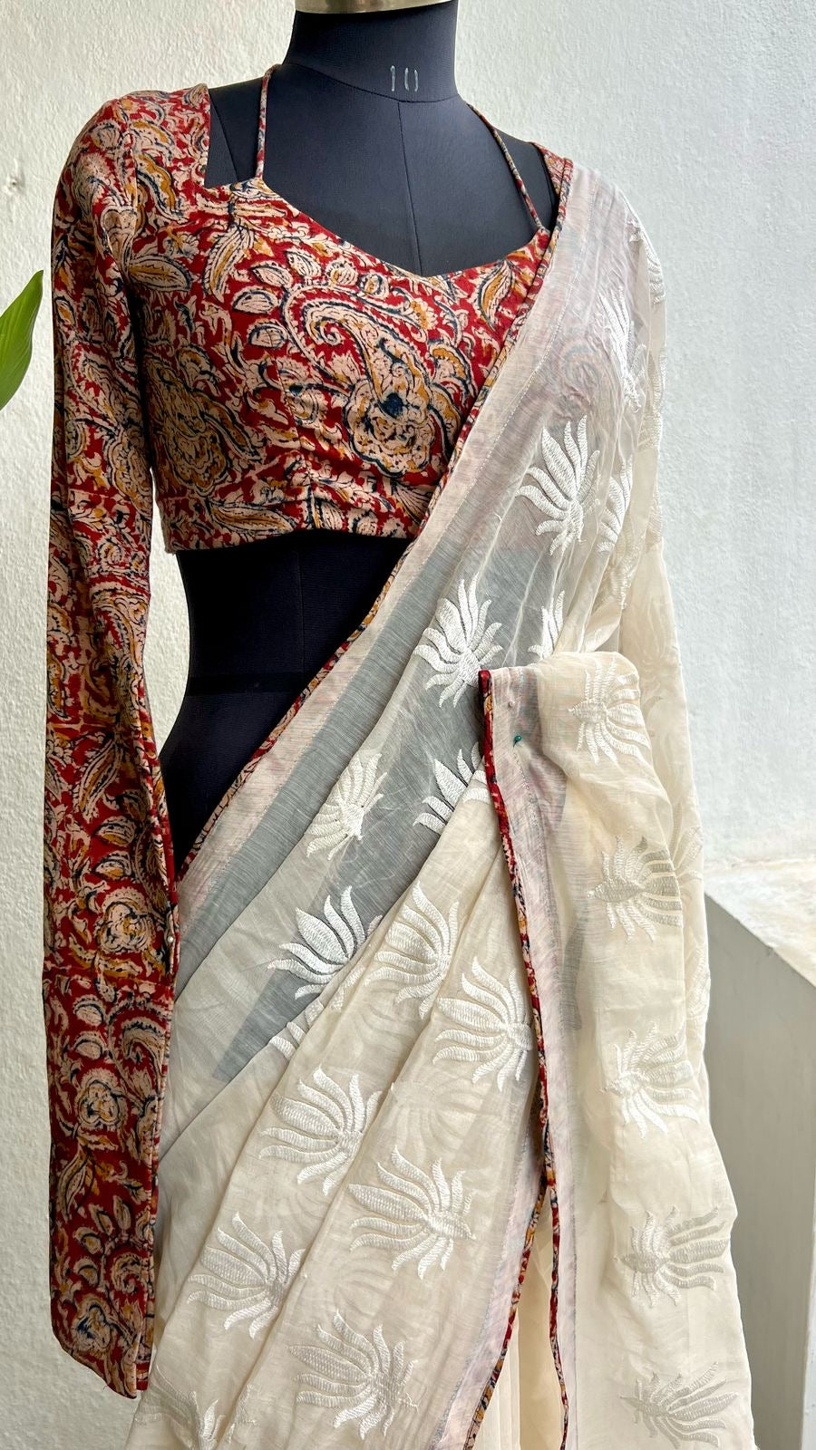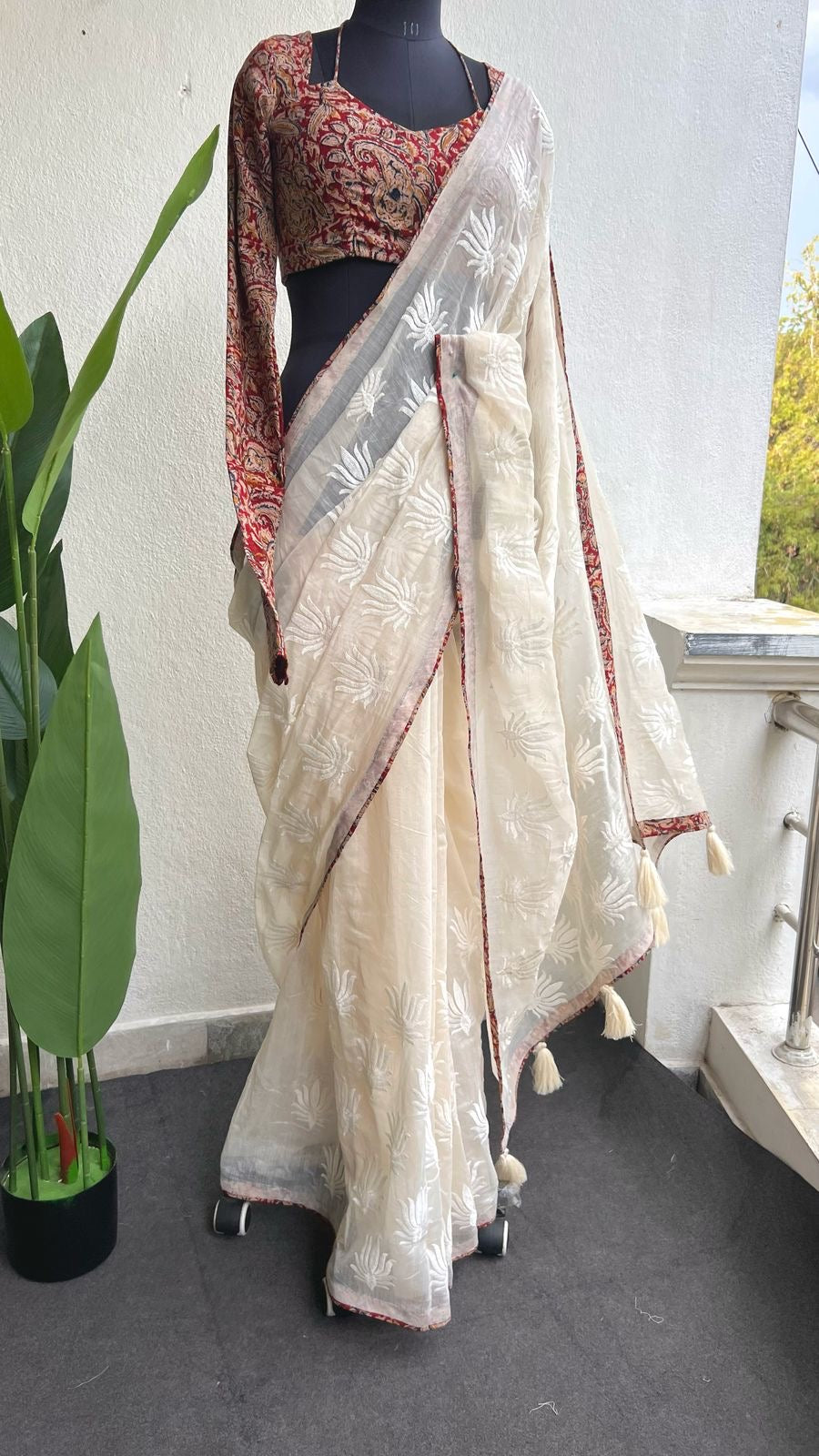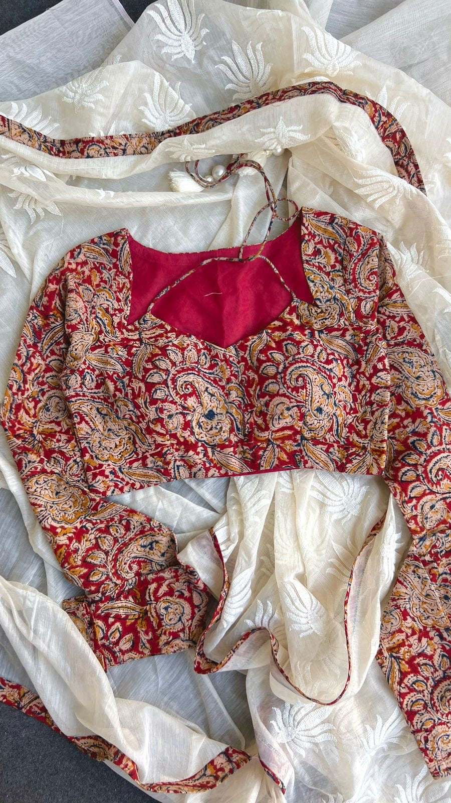 Cream soft chanderi cotton saree with floral embroidery works all over and blouse matching liquid patti border works is paired up with maroon red cotton kalamkari hand block printed & patterned blouse as shown.