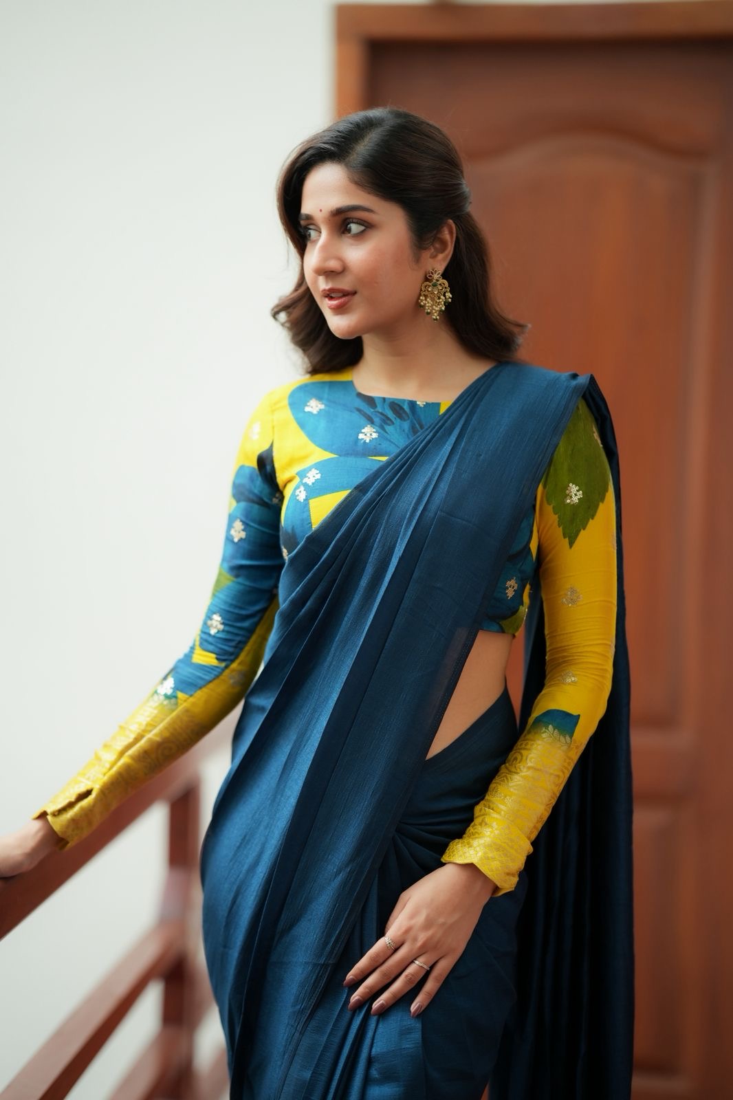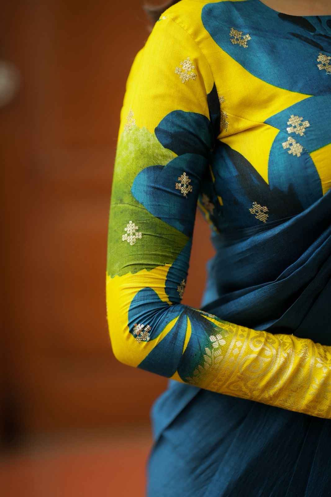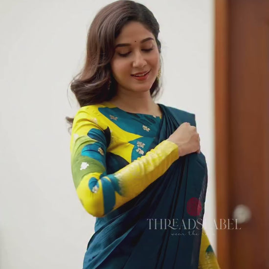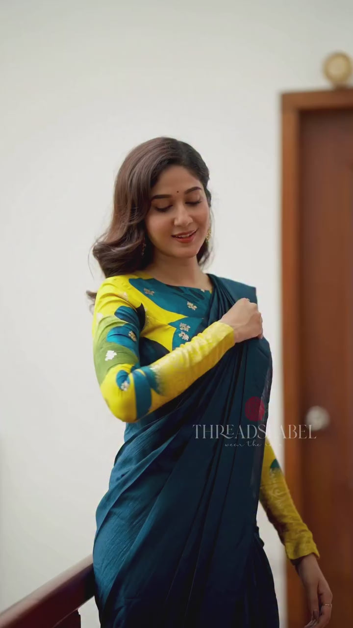 Deep blue marble silk designer saree comes with floral embroidery pallu work is paired up with lime yellow gajji silk patterned & intricate sequins embroidery worked blouse.