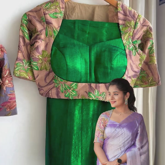 Lavender soft tissue saree with liquid zari border and pallu works is paired up with matching silk floral embroidery worked blouse as shown.