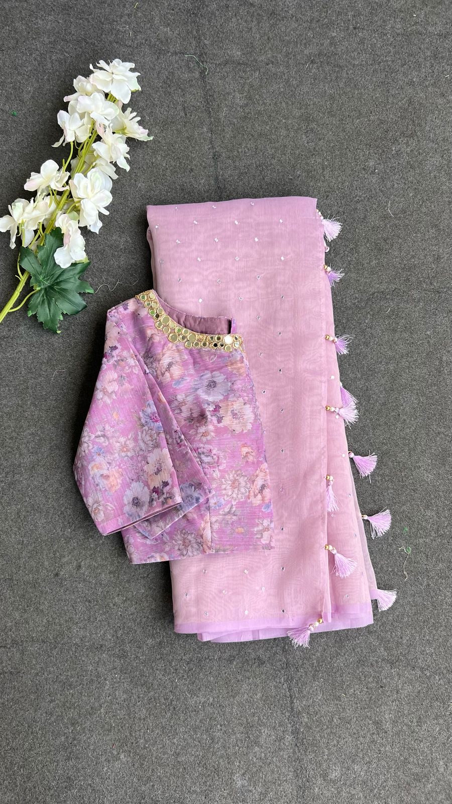 Lavender tissue saree with mirror floral blouse