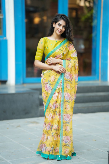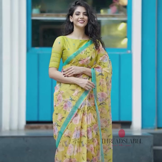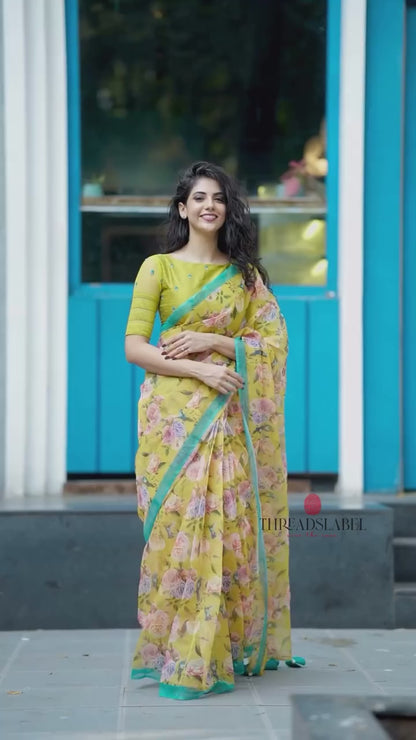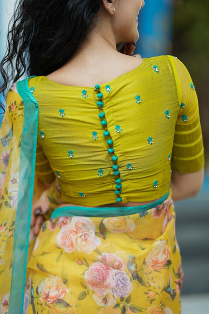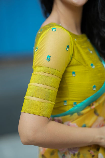 Lime green silk patterned blouse comes with floral hand works all over blouse & highlighted patterned works for sleeves as shown.