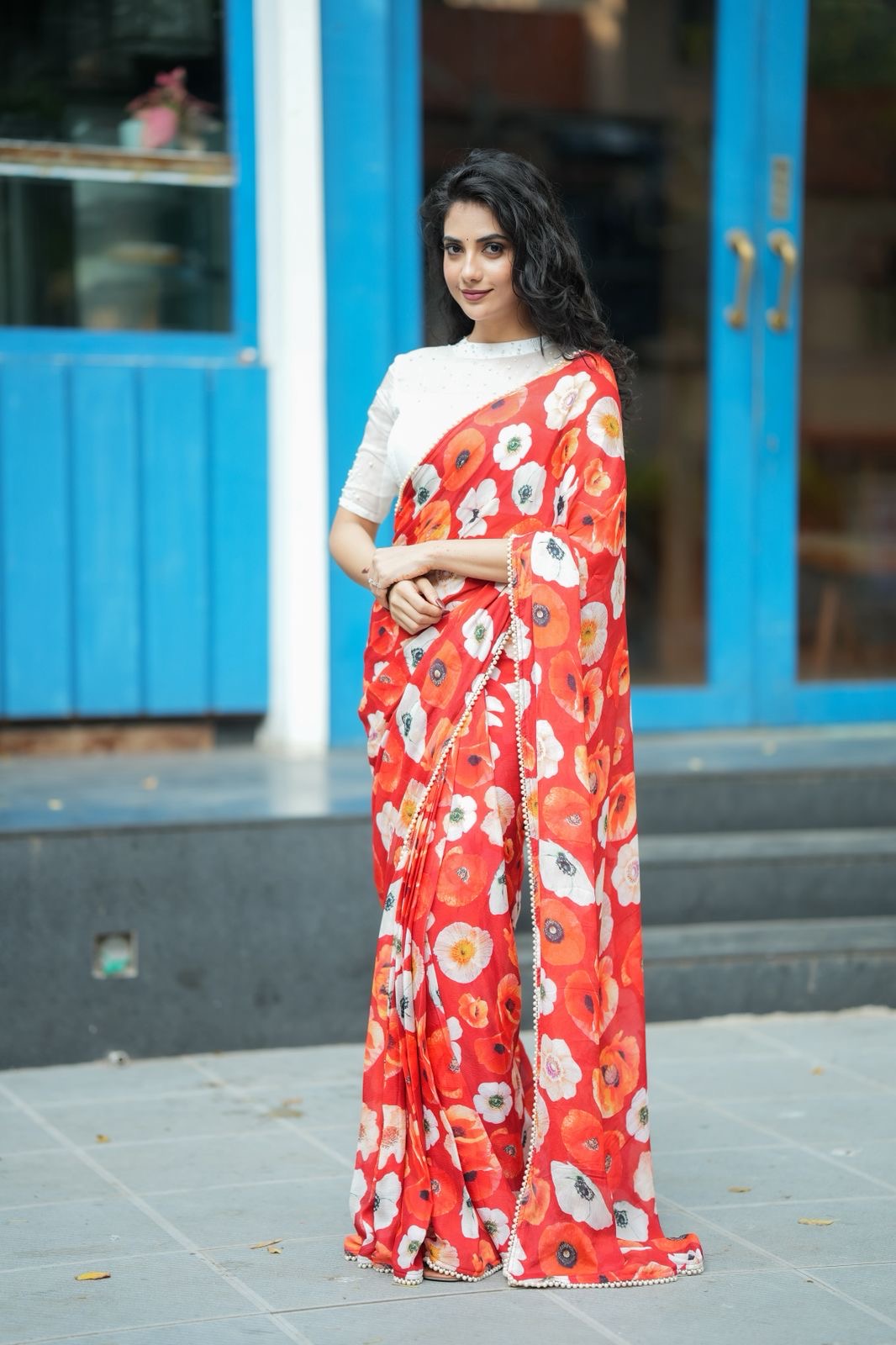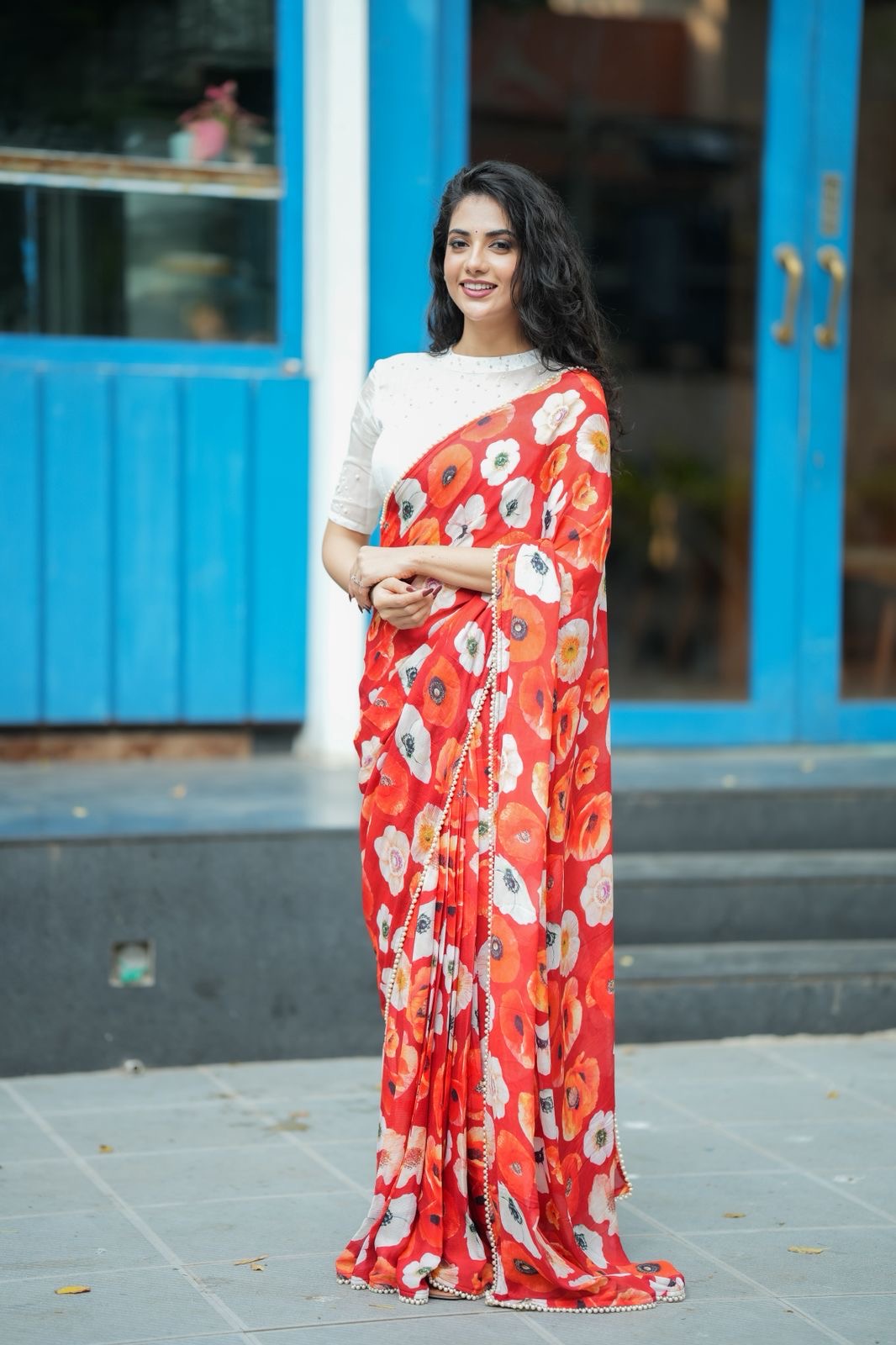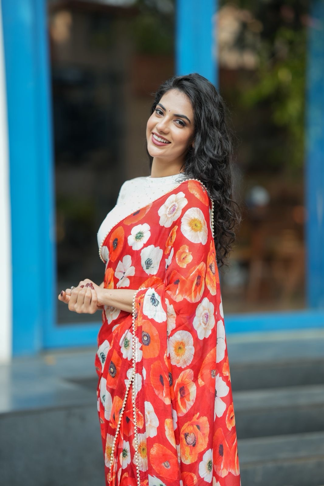 Orange red pure chinnon soft silk floral printed designer saree with pearl embroidery borders works is paired up with white organza patterned blouse having highlighted pearl workks for neck , front & sleeves as shown.