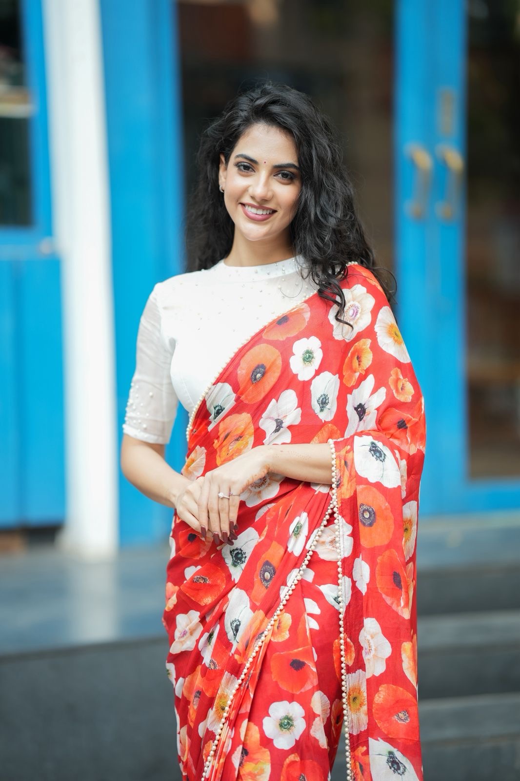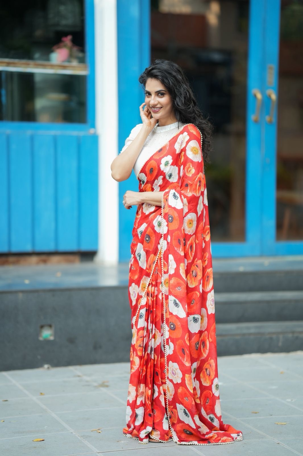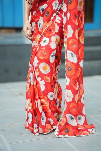 Orange red pure chinnon soft silk floral printed designer saree with pearl embroidery borders works is paired up with white organza patterned blouse having highlighted pearl workks for neck , front & sleeves as shown.