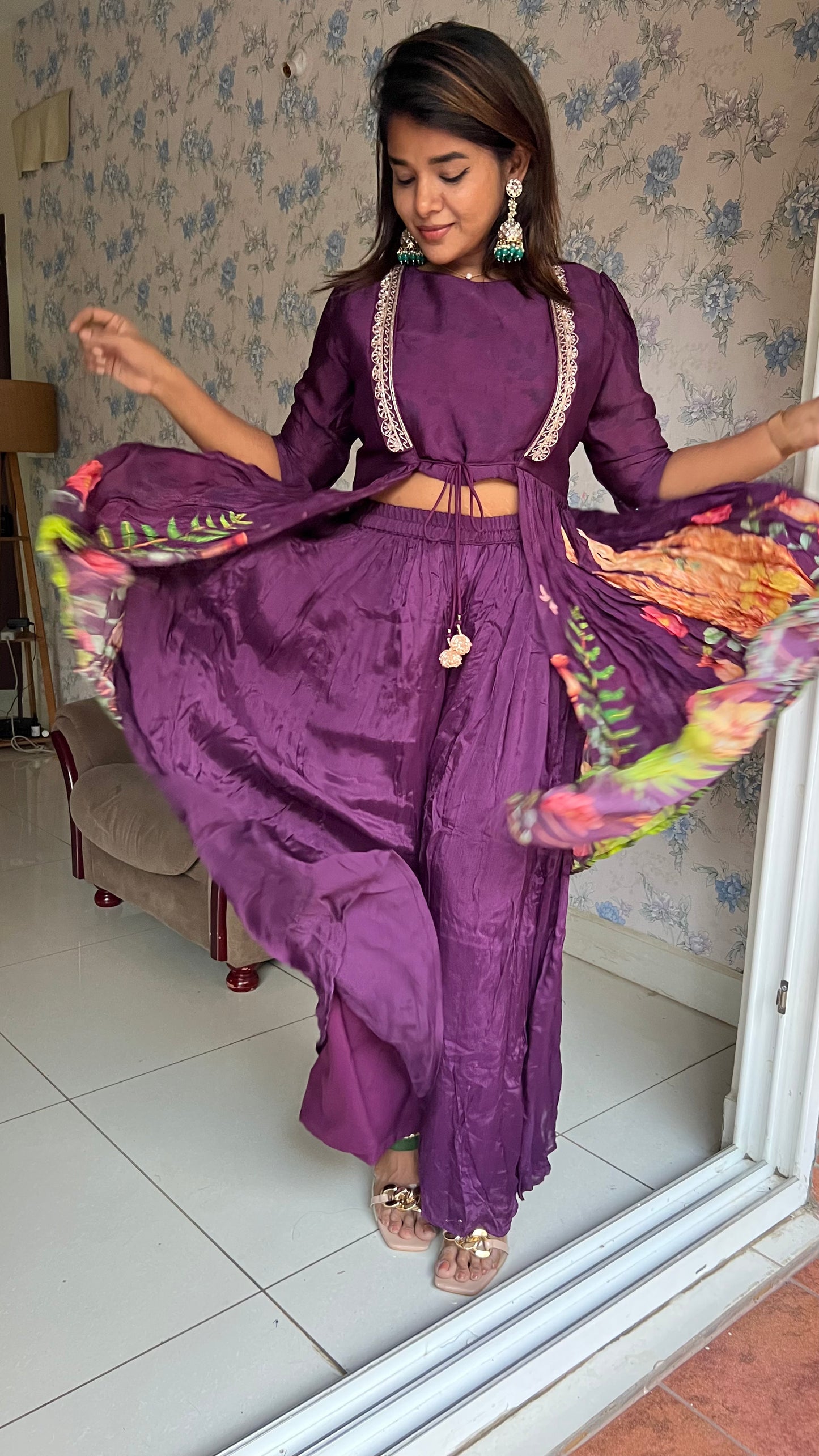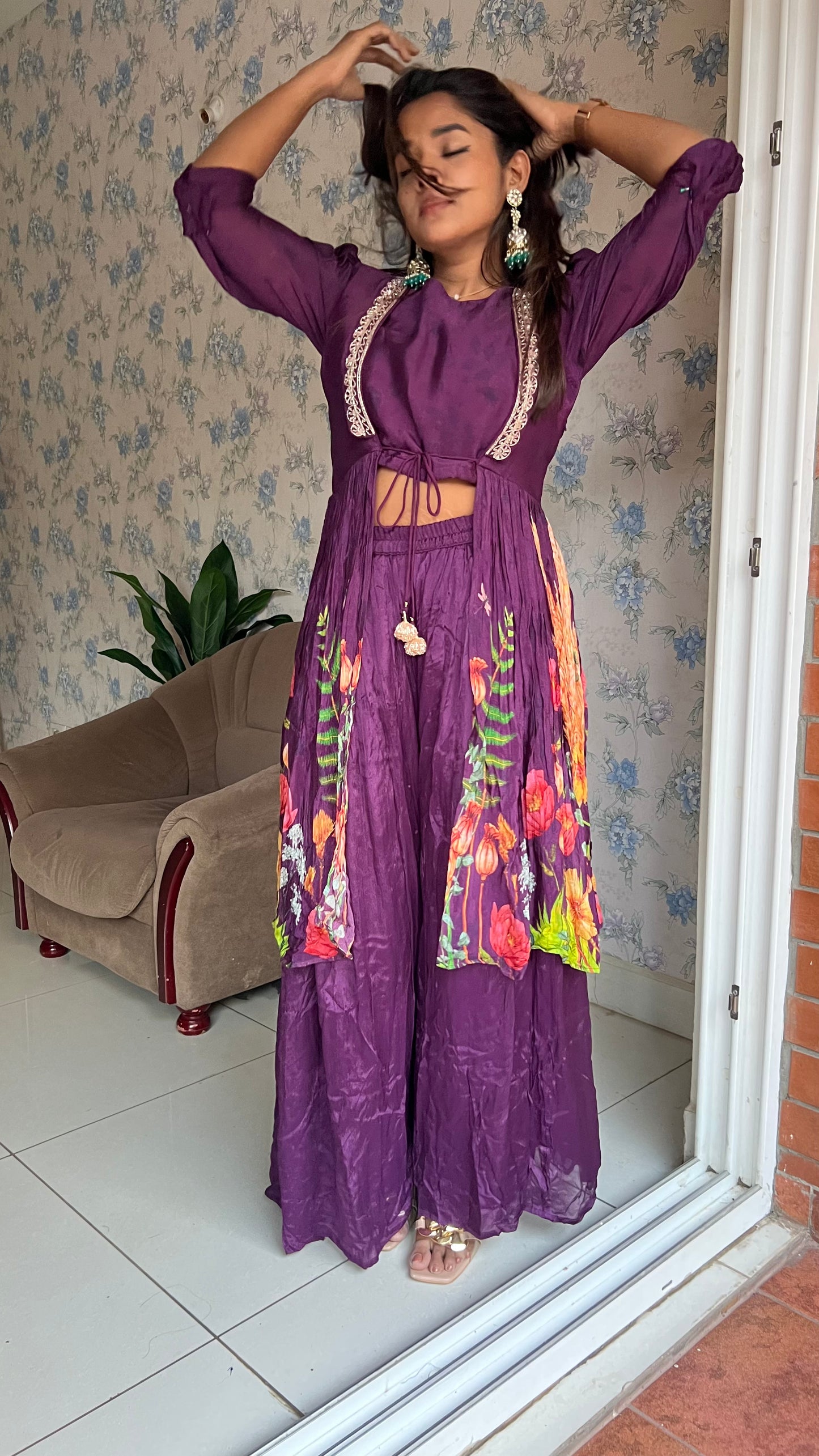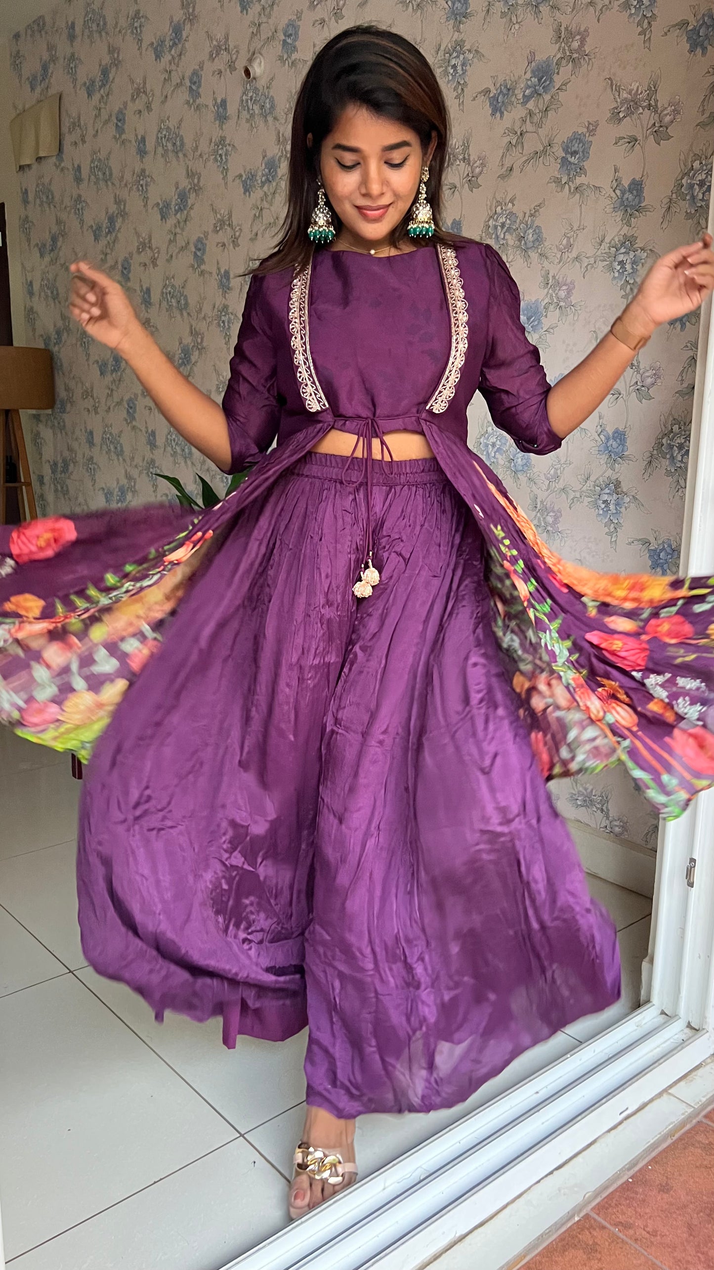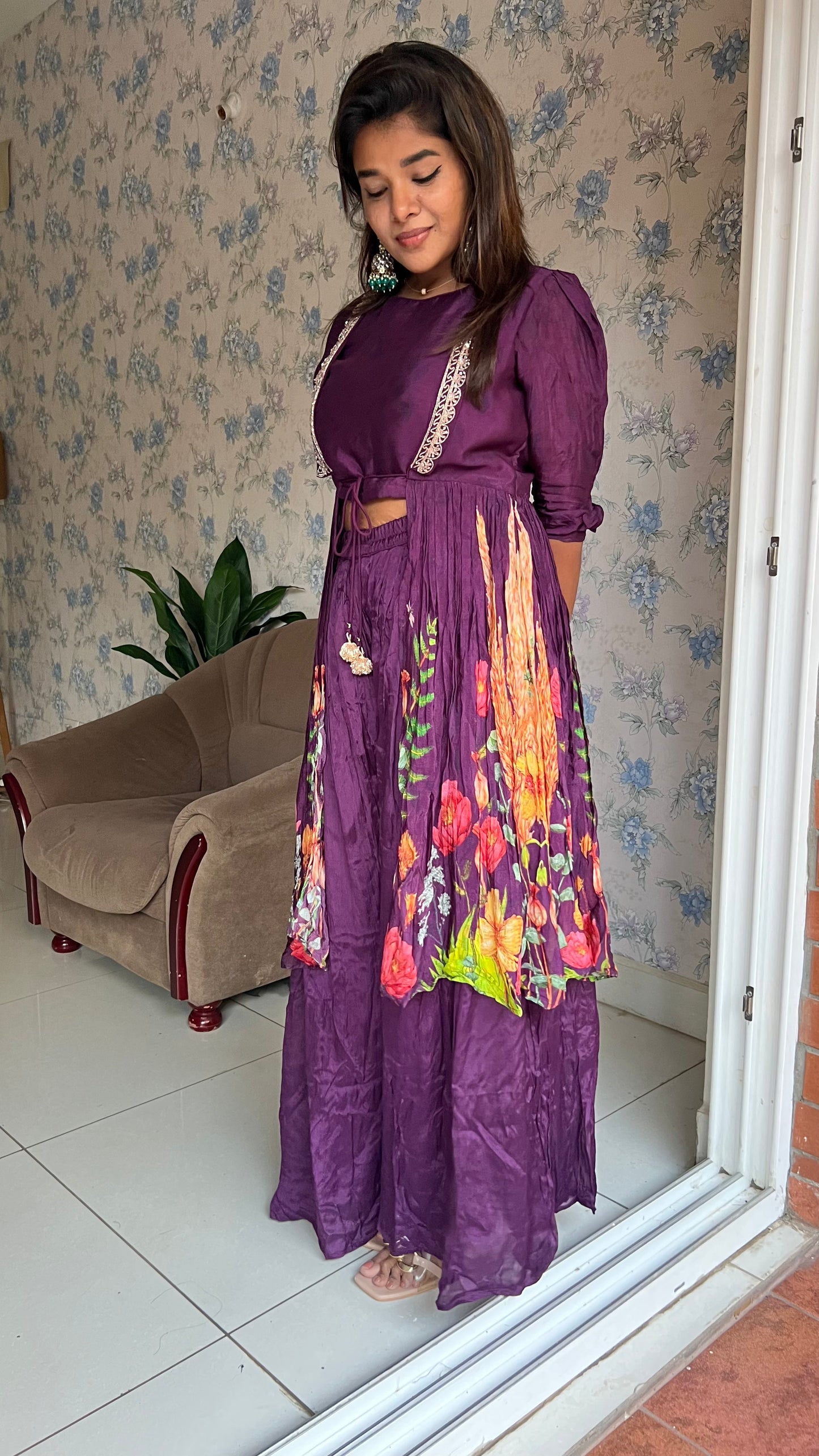 Purple chinnon floral embroidered 2 piece coord suit