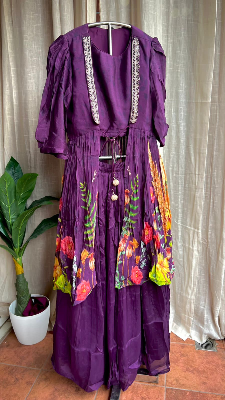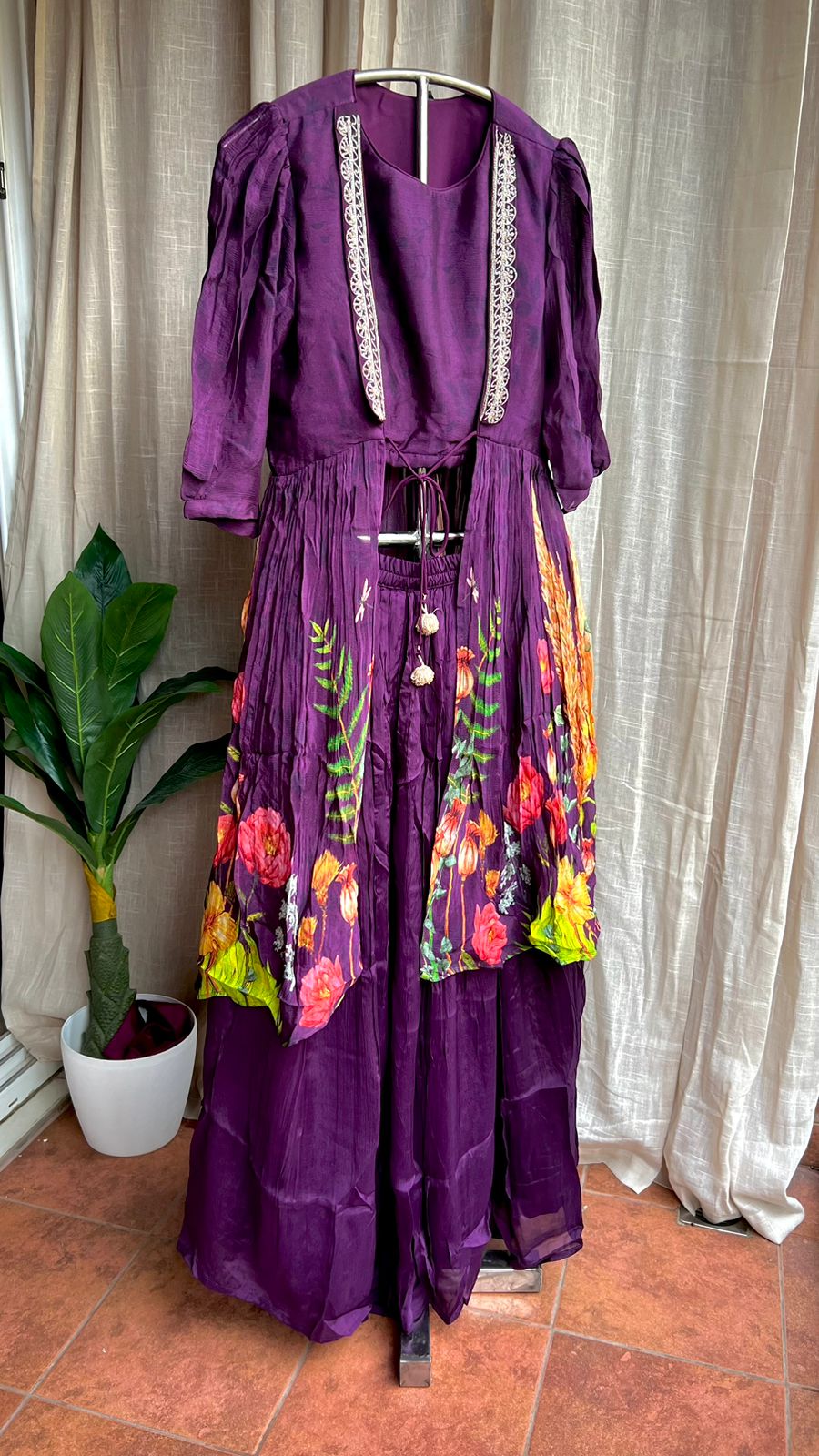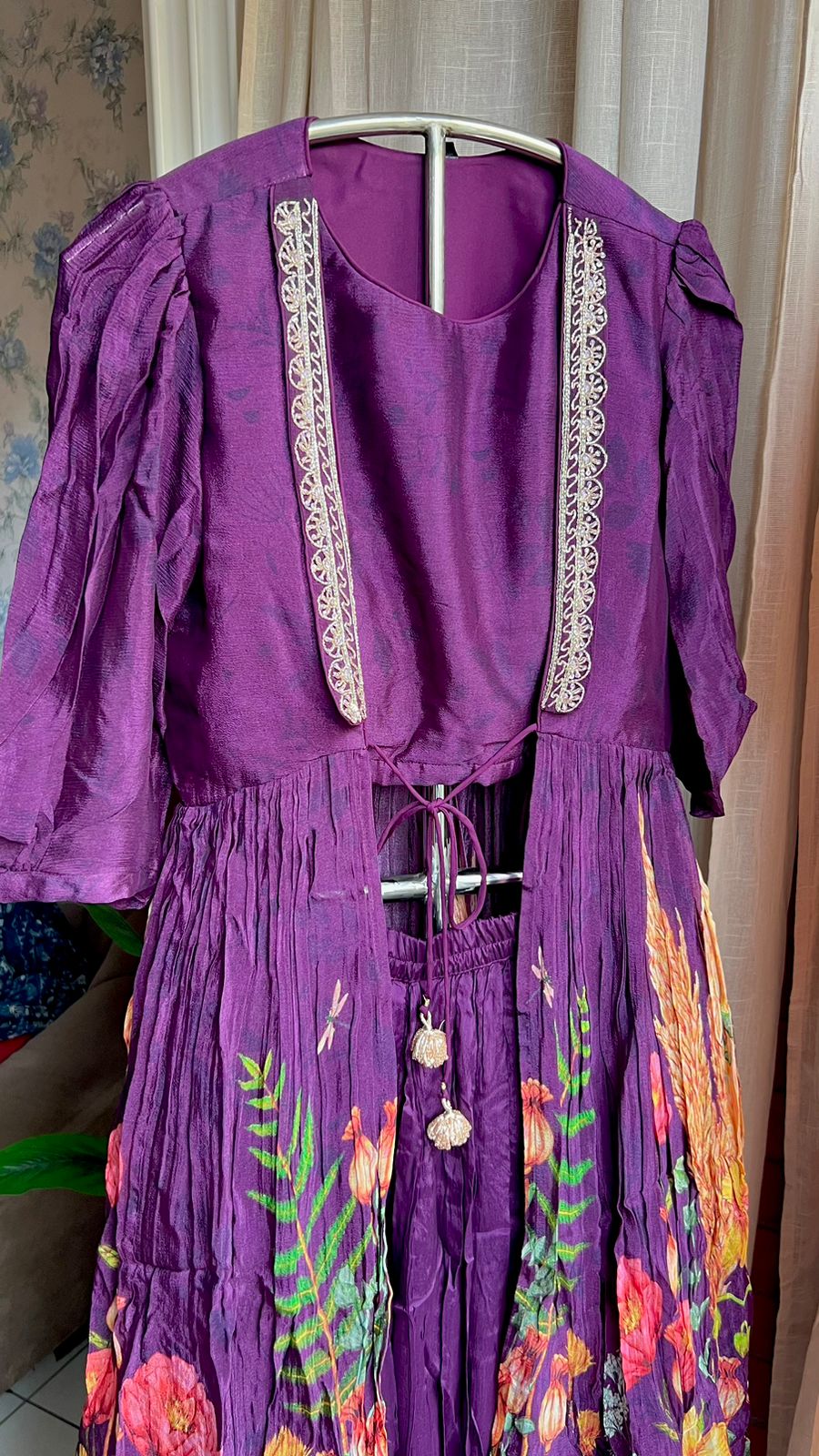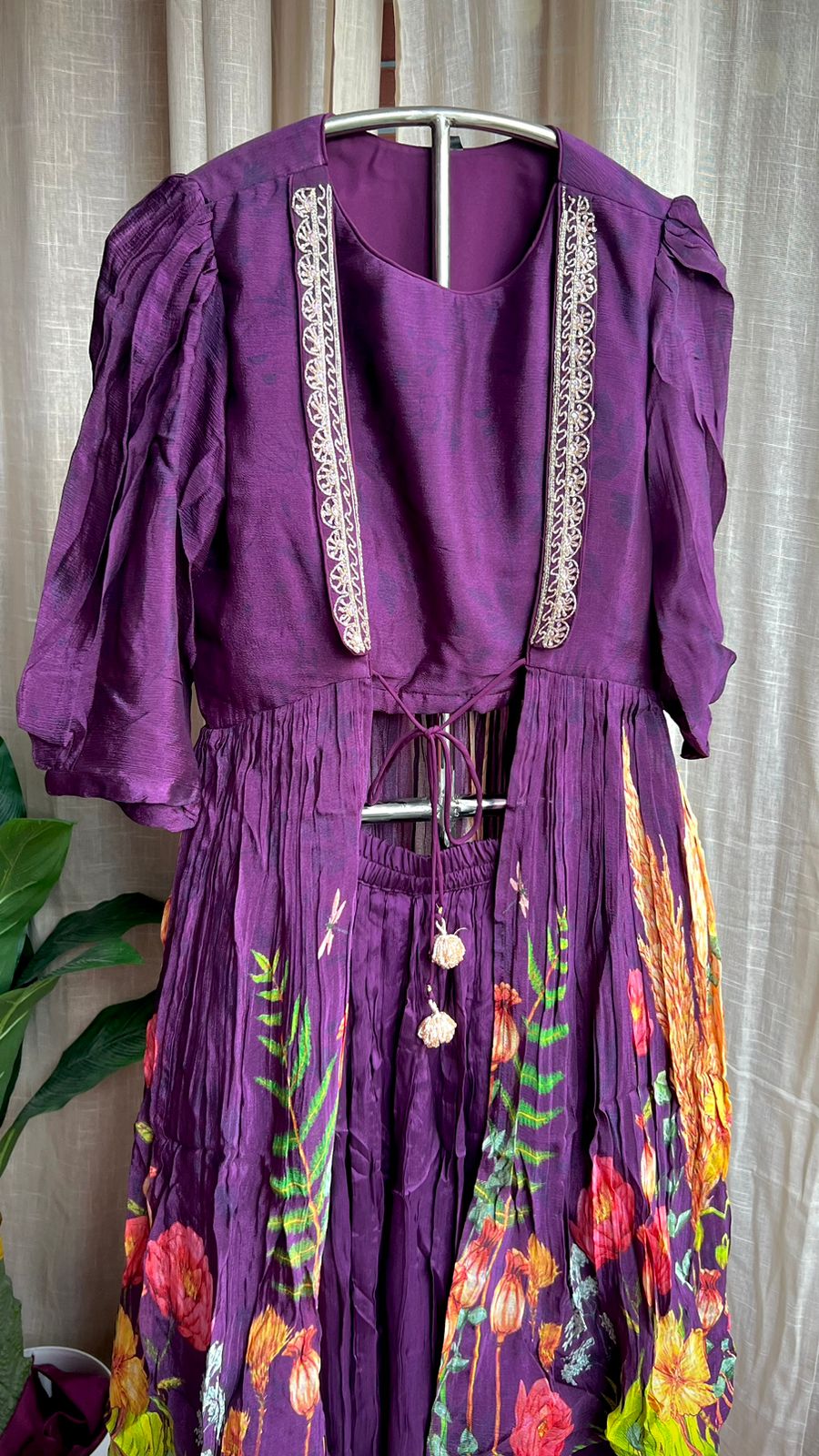Purple chinnon floral embroidered 2 piece coord suit