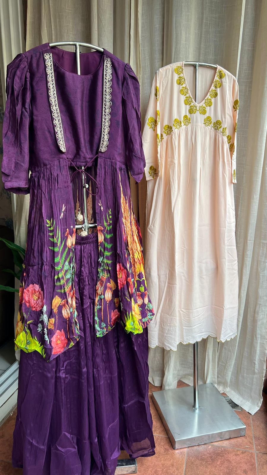 Purple chinnon floral embroidered 2 piece coord suit top ( 2 other coord) comes with embroidery worked for front and matching skirt and plain chiffon embroidery bordered duppata.