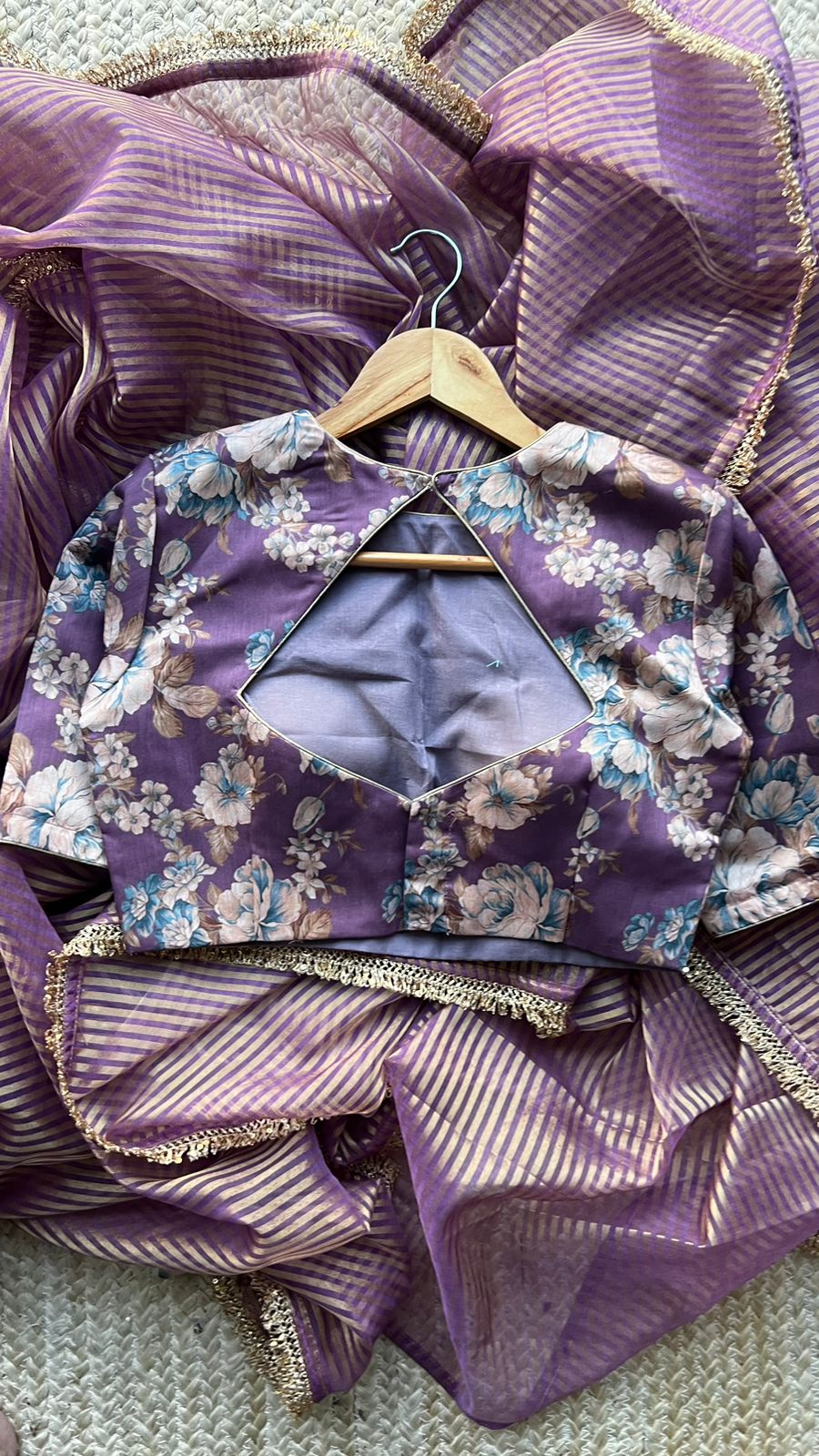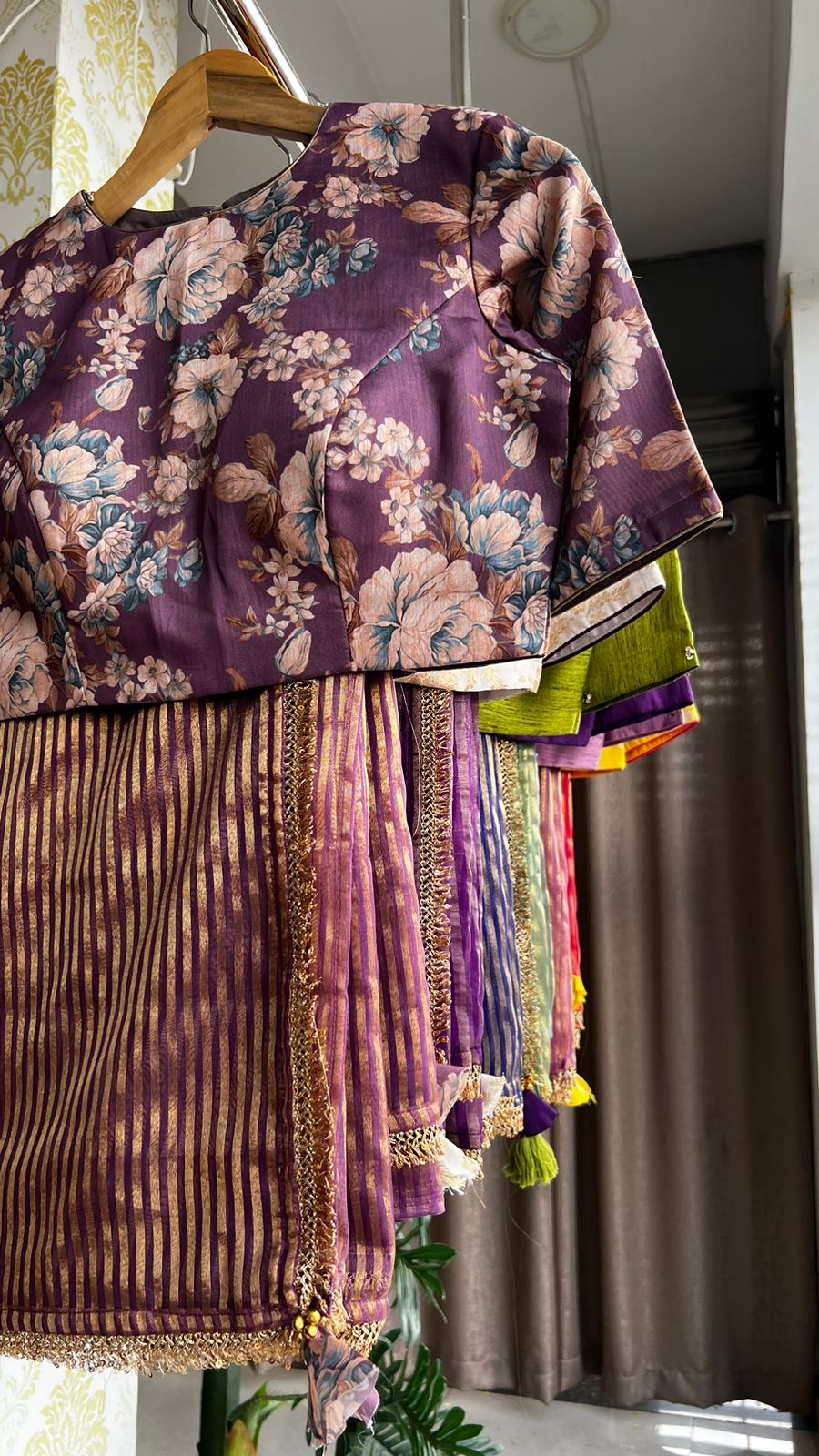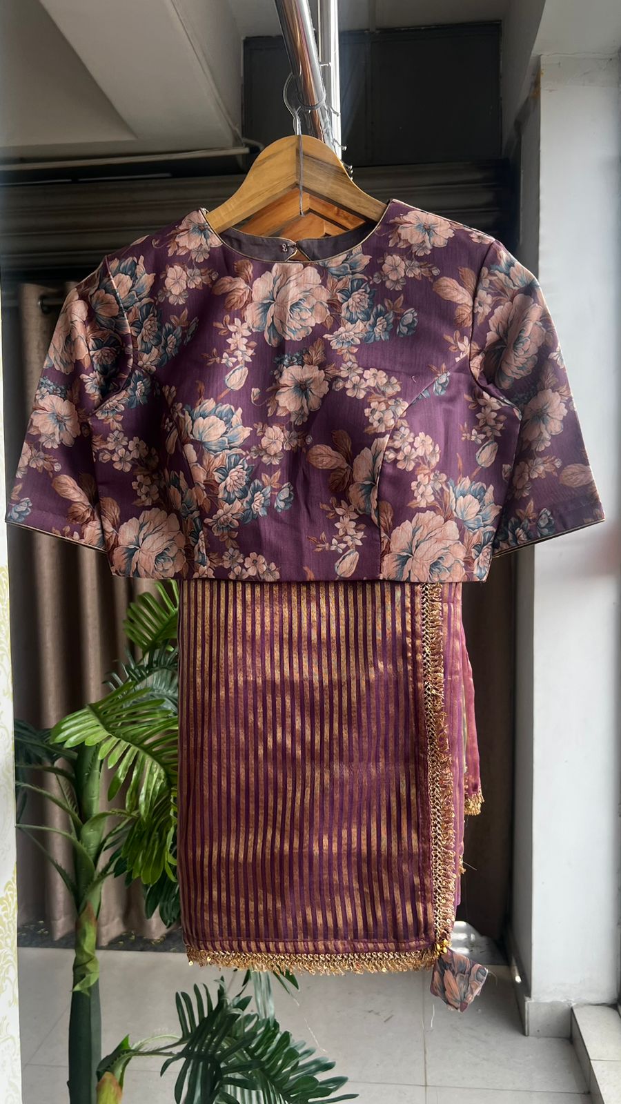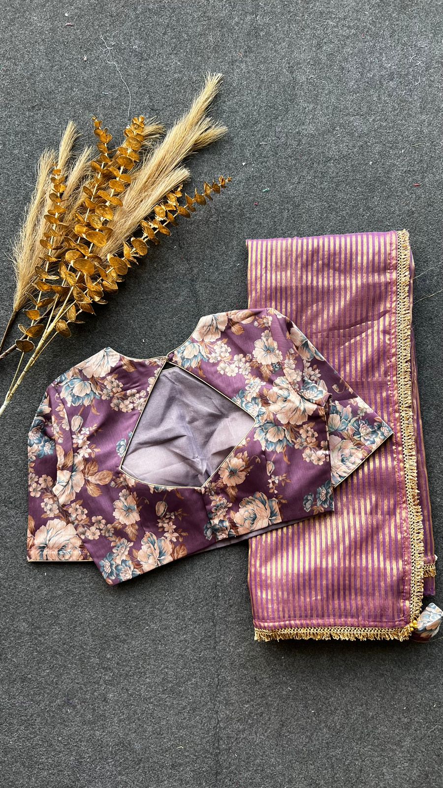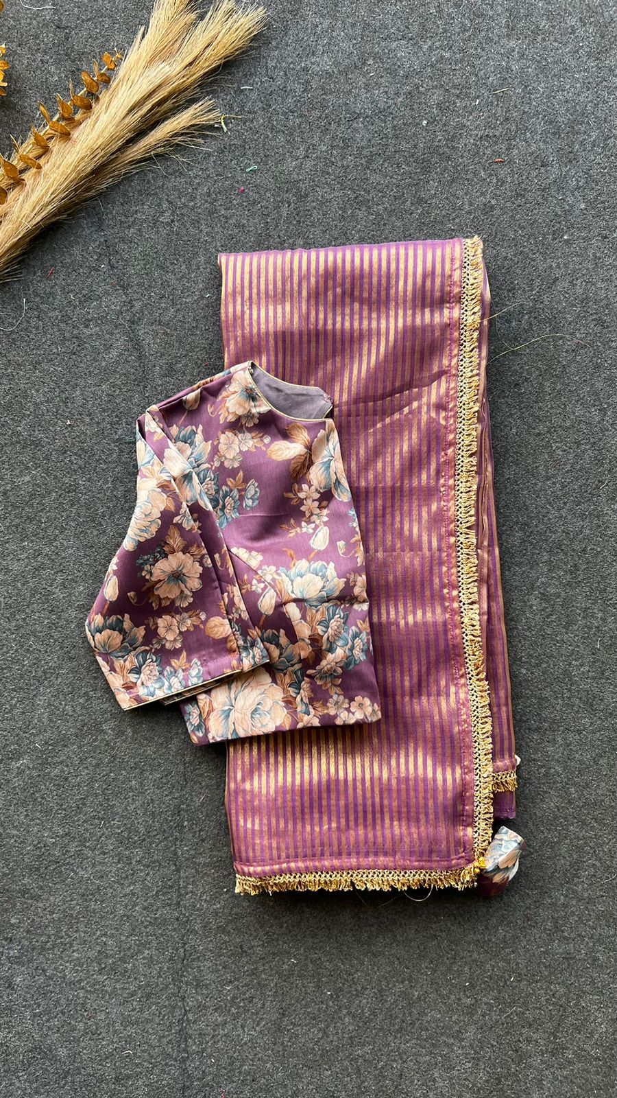 wine stripped soft tissue saree with embroidery patti border works is paired up with wine silk blouse having floral print works all over the blouse