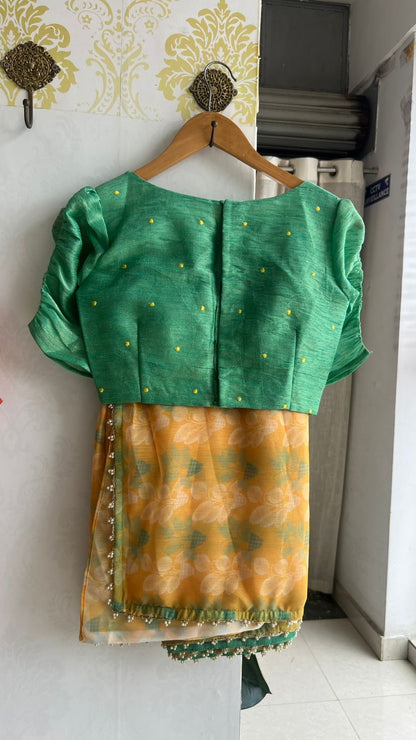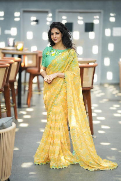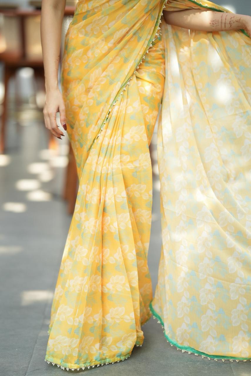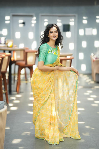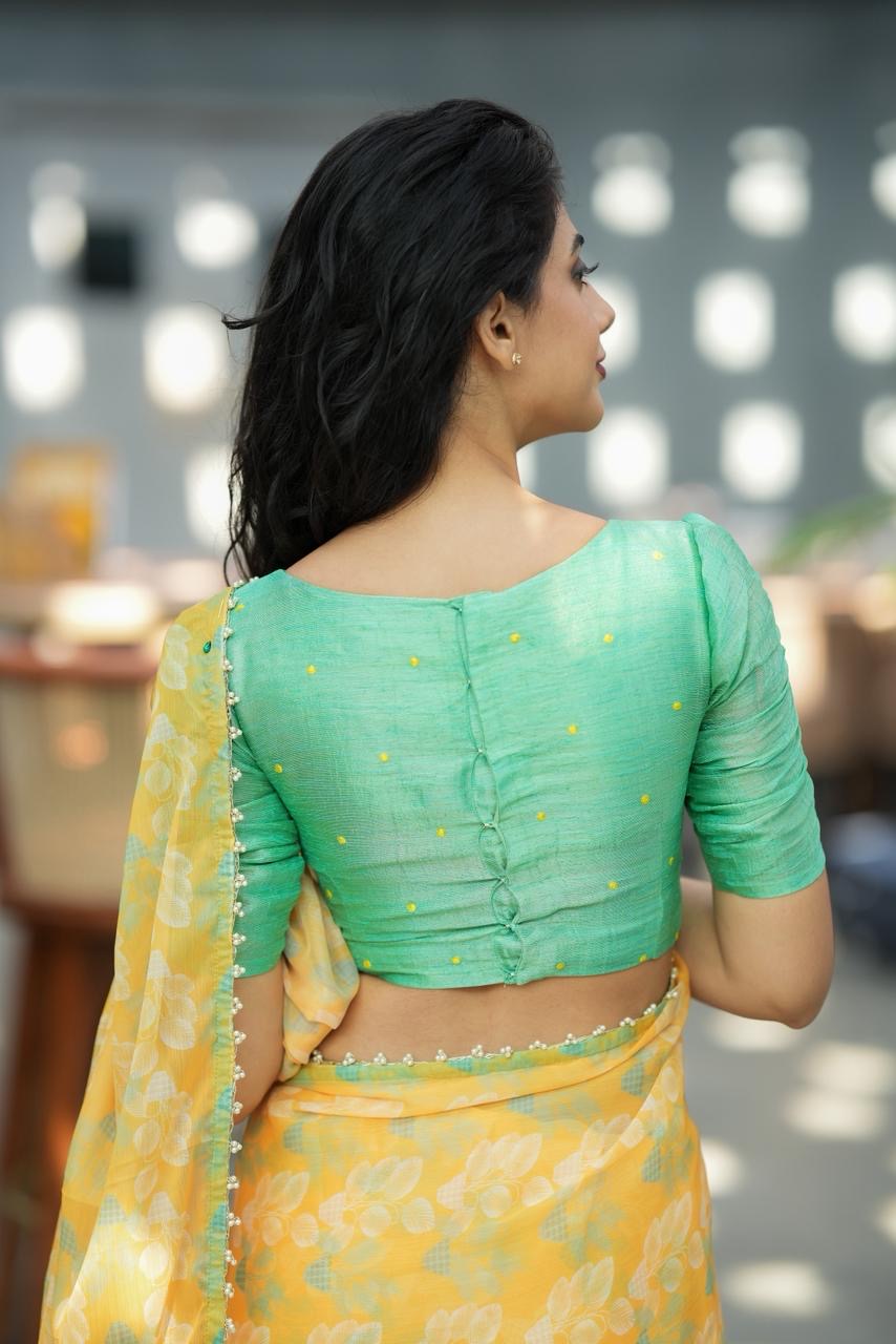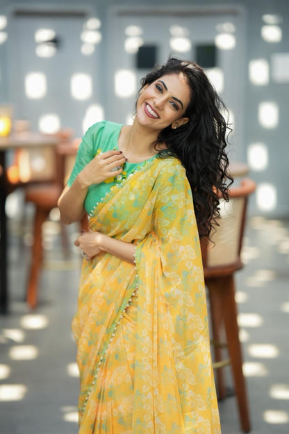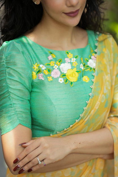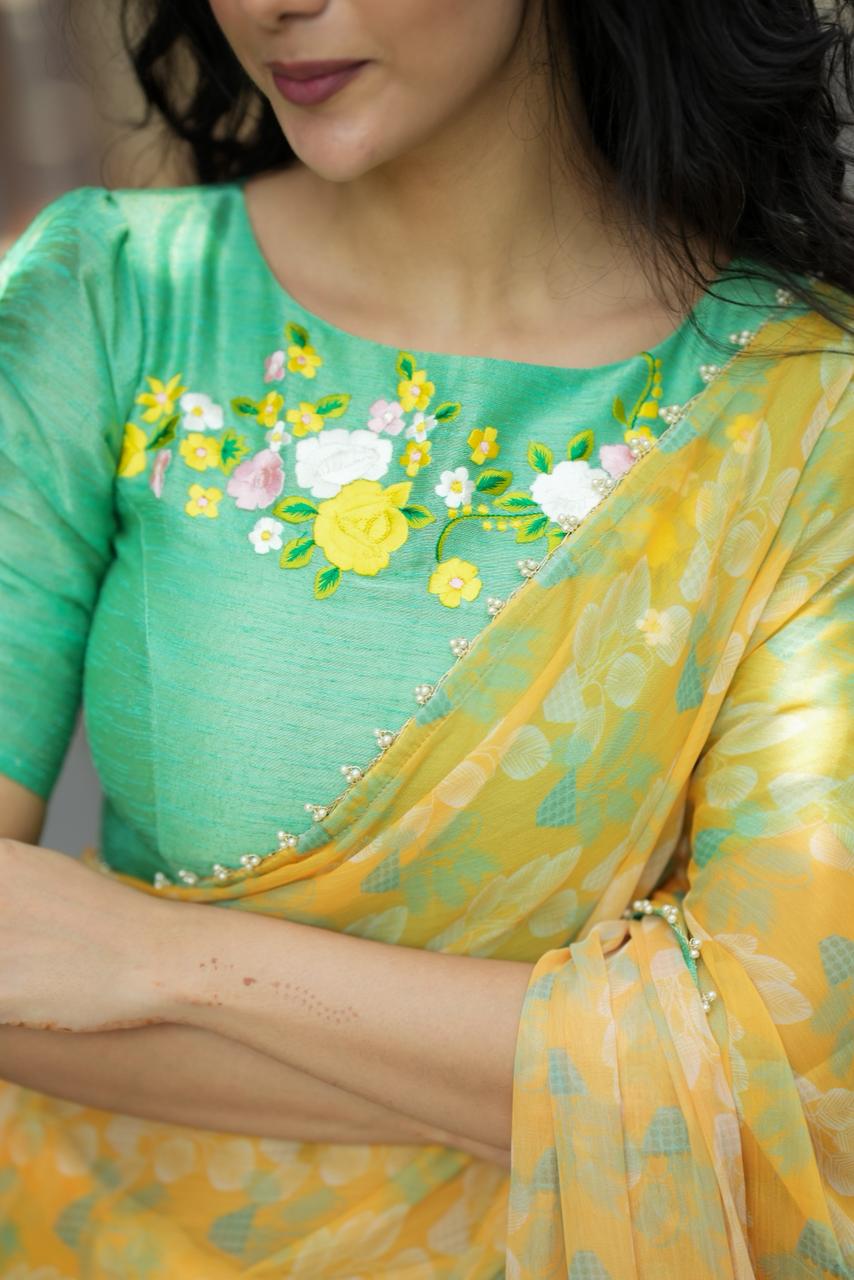 Lemon yellow floral printed chiffon saree with pearl embroidery border works comes with light green tissue floral hand worked blouse having highlighted hand works for front & back as shown.