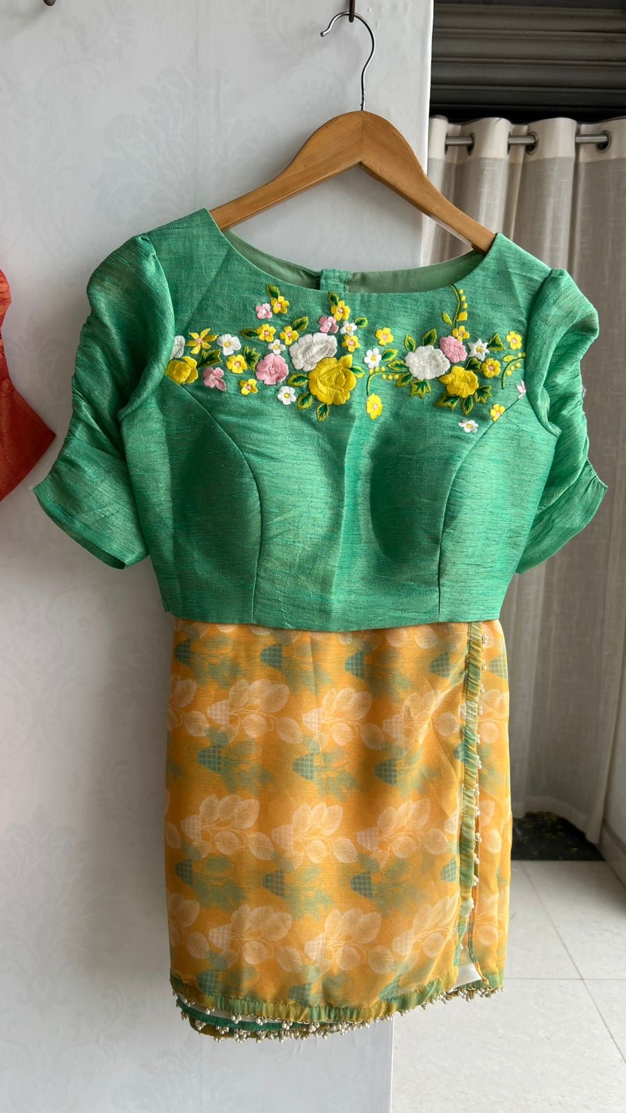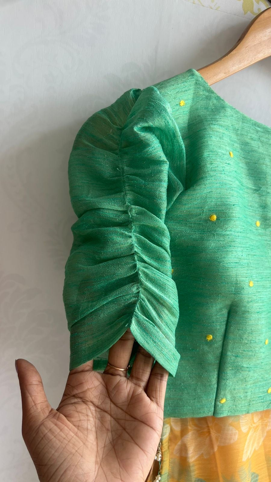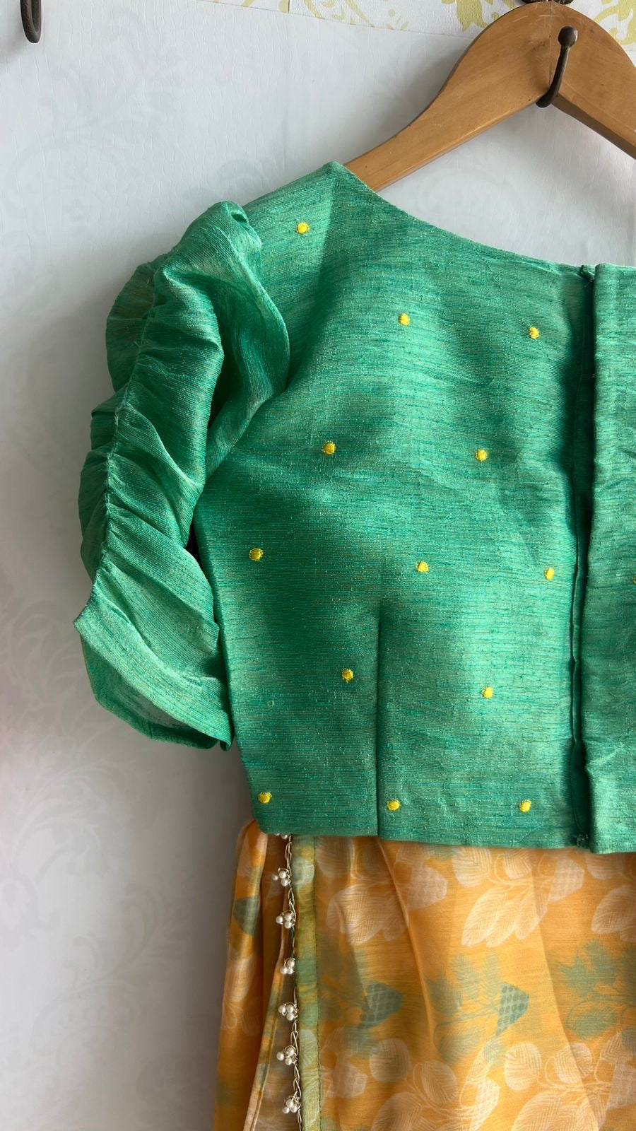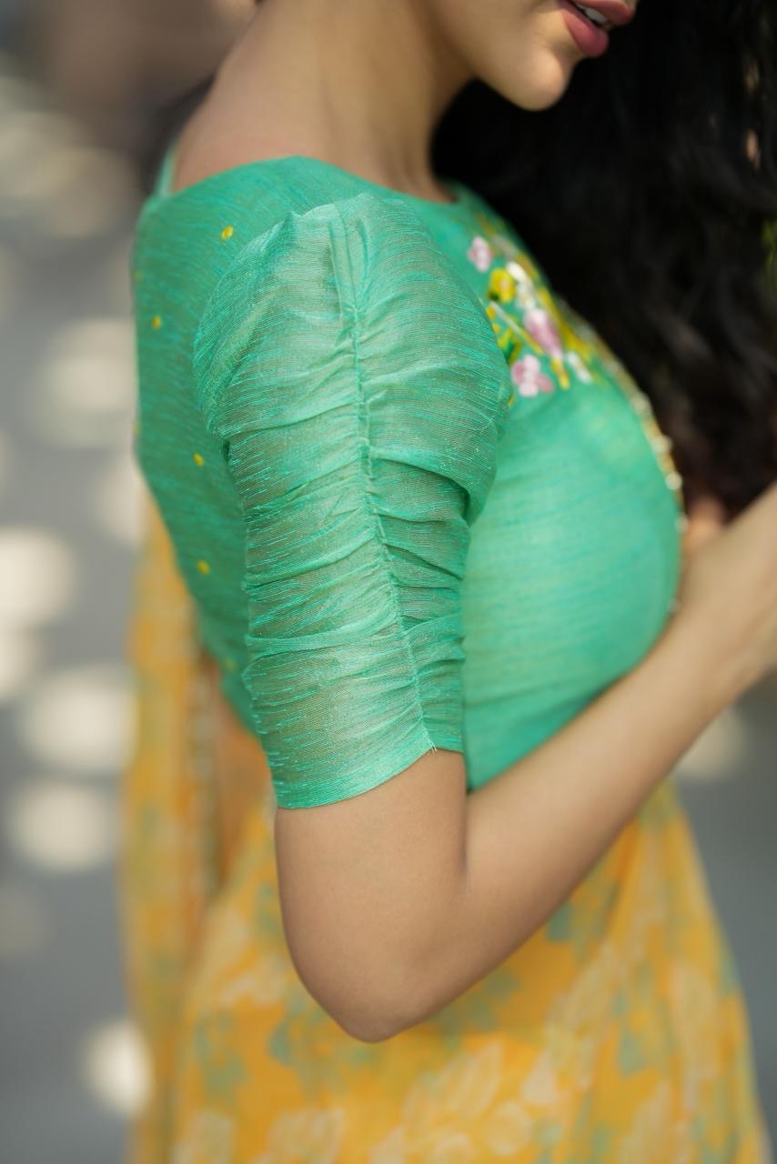 Lemon yellow floral printed chiffon saree with pearl embroidery border works comes with light green tissue floral hand worked blouse having highlighted hand works for front & back as shown.