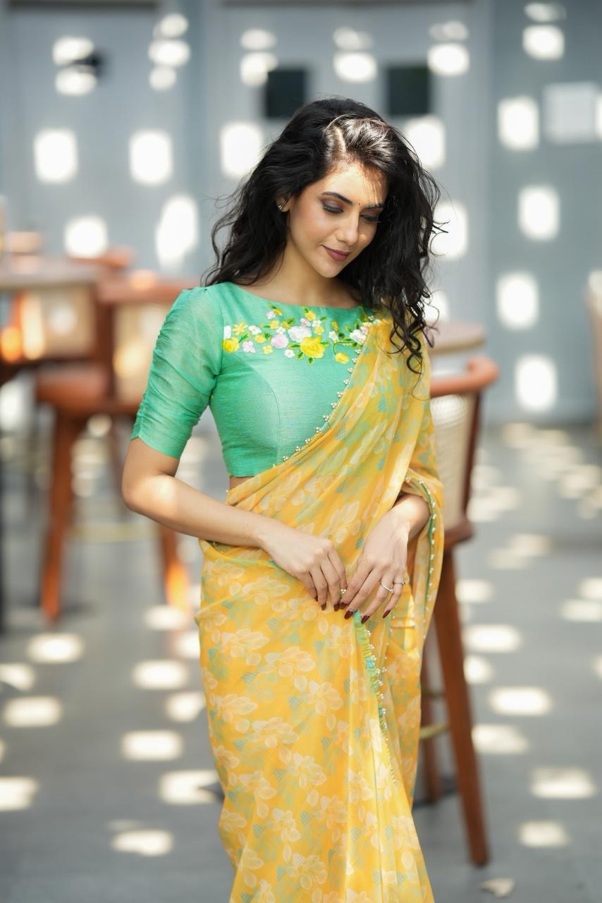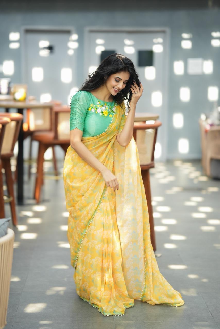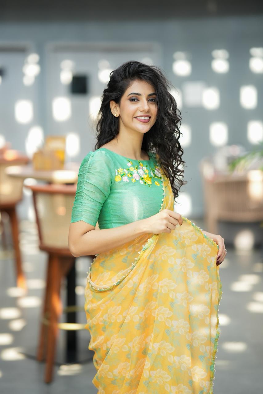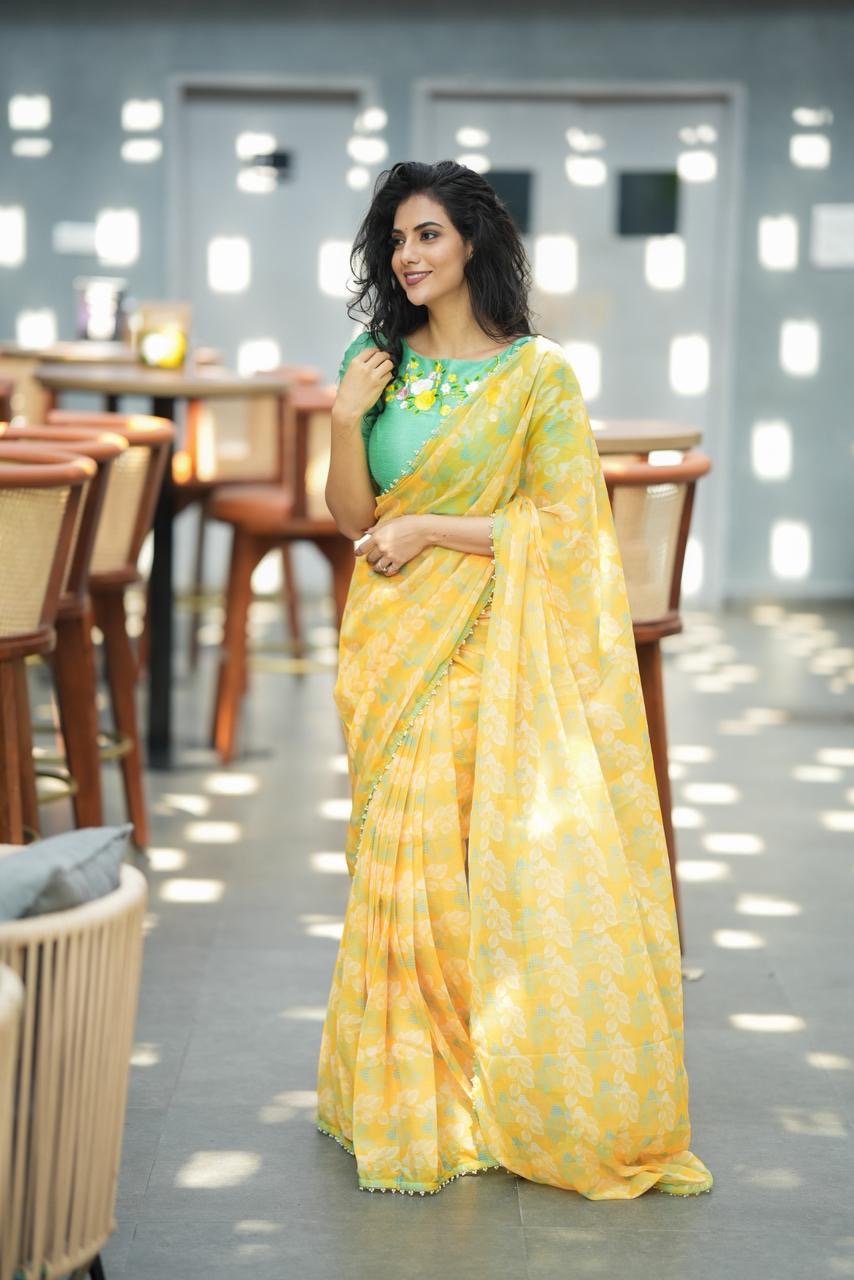Lemon yellow floral printed chiffon saree with pearl embroidery border works comes with light green tissue floral hand worked blouse having highlighted hand works for front & back as shown.