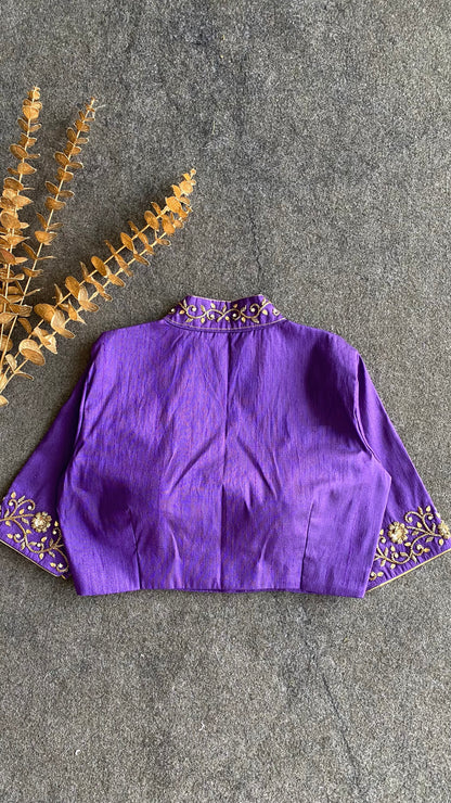 Purple silk patterned blouse having heavy intricate floral hand works for collar & sleeves  as shown.