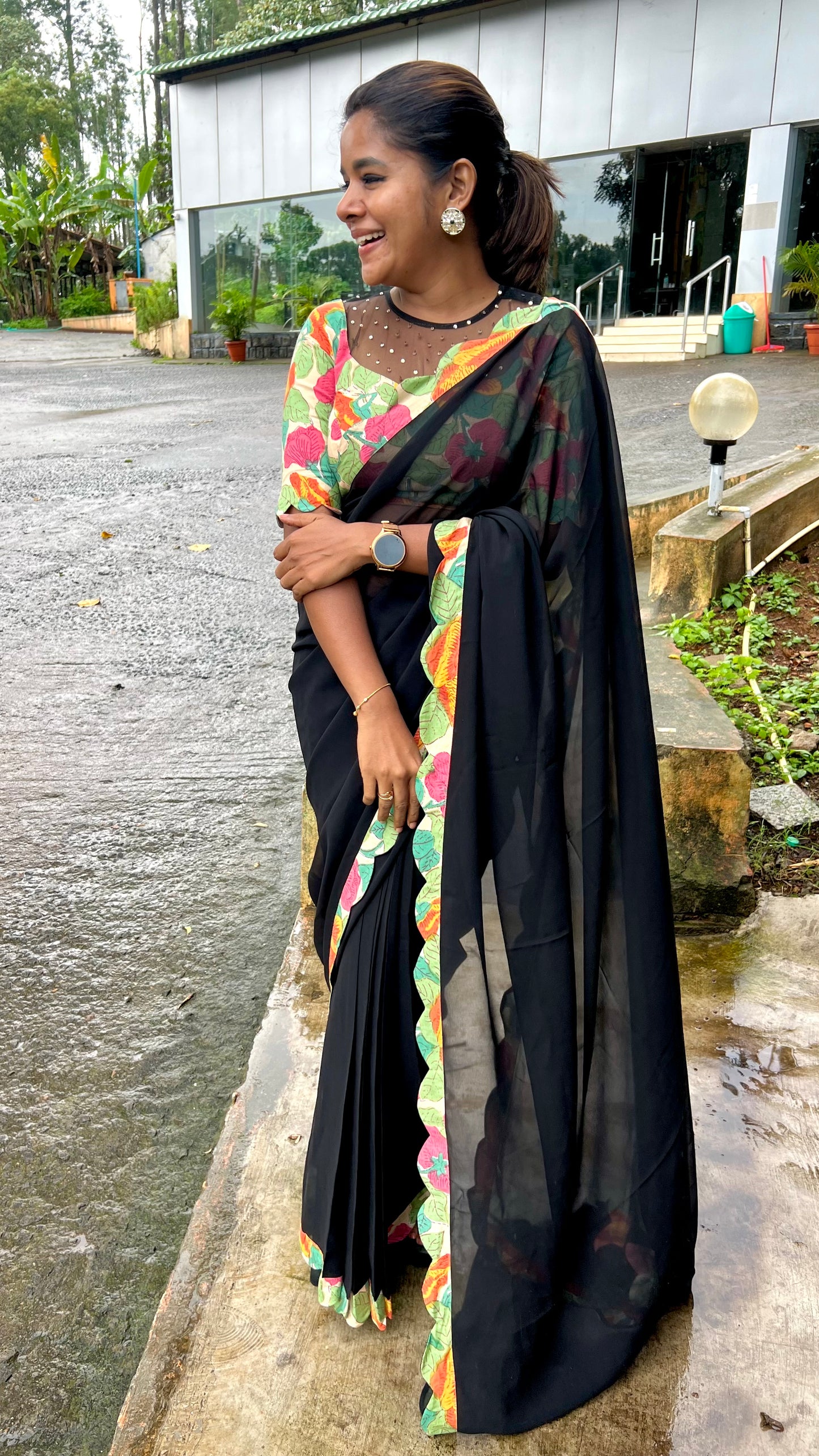 Black georgette saree with blouse matching scalloped patti border works is paired up with cotton green floral printed & netted work blouse as shown