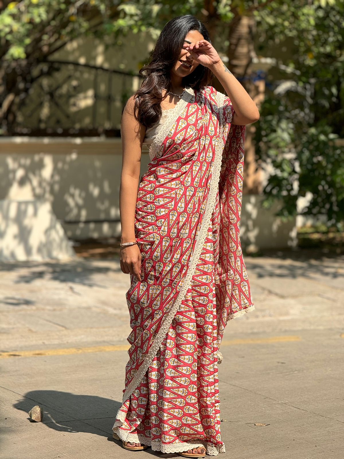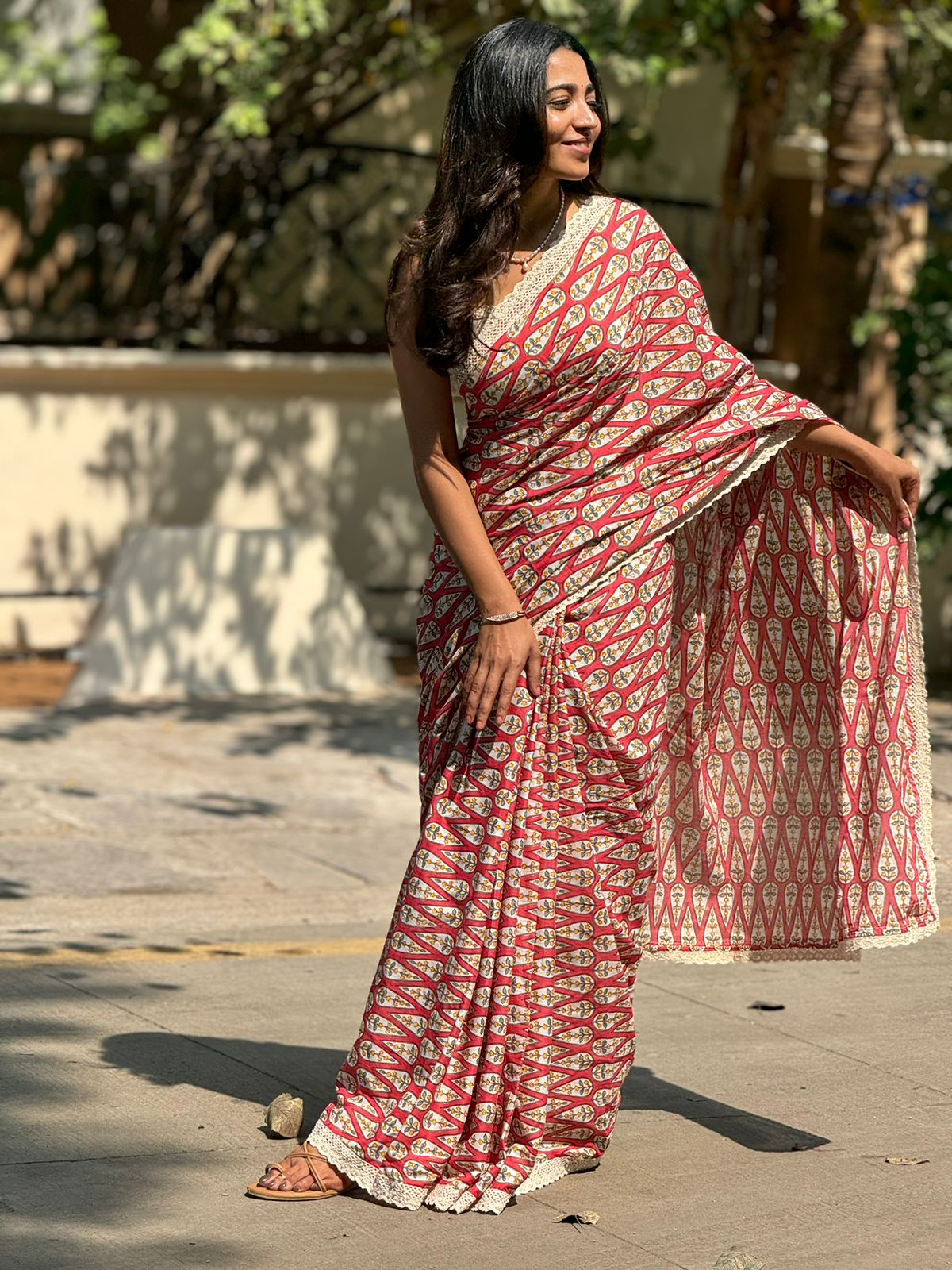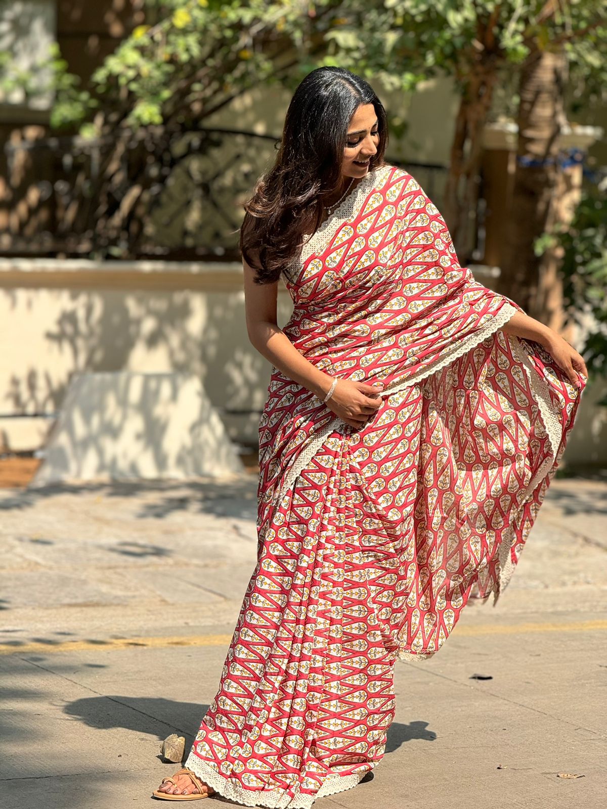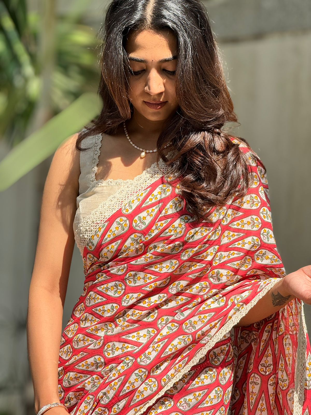 Pink pure mul mul cotton printed designer saree having crochet embroidery border works is paired up with half white cotton crochet embroidery worked sleeveless blouse