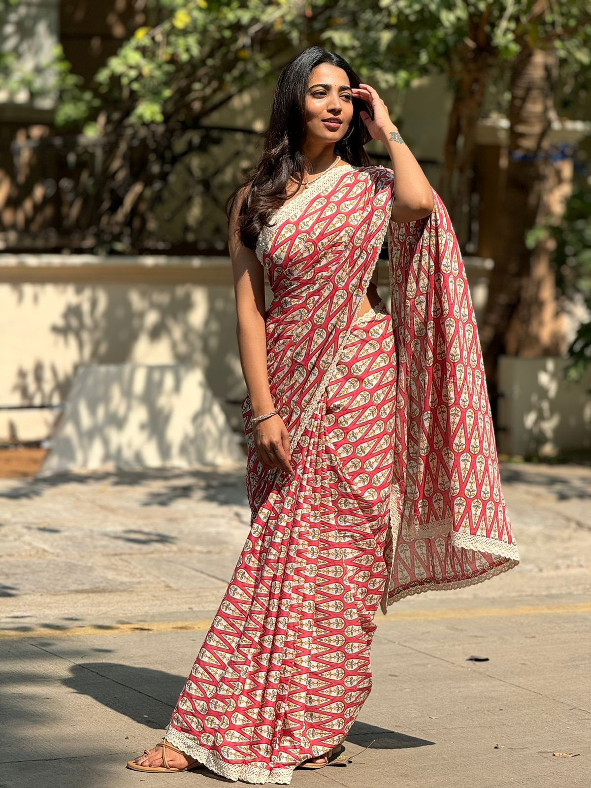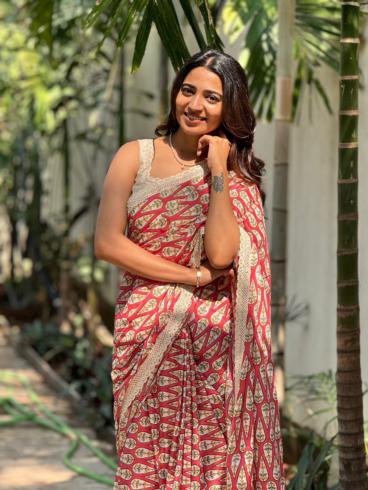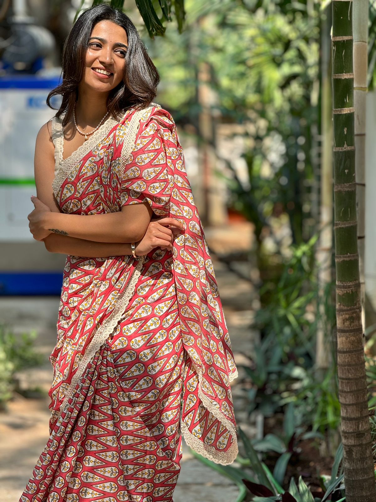 Pink pure mul mul cotton printed designer saree having crochet embroidery border works is paired up with half white cotton crochet embroidery worked sleeveless blouse