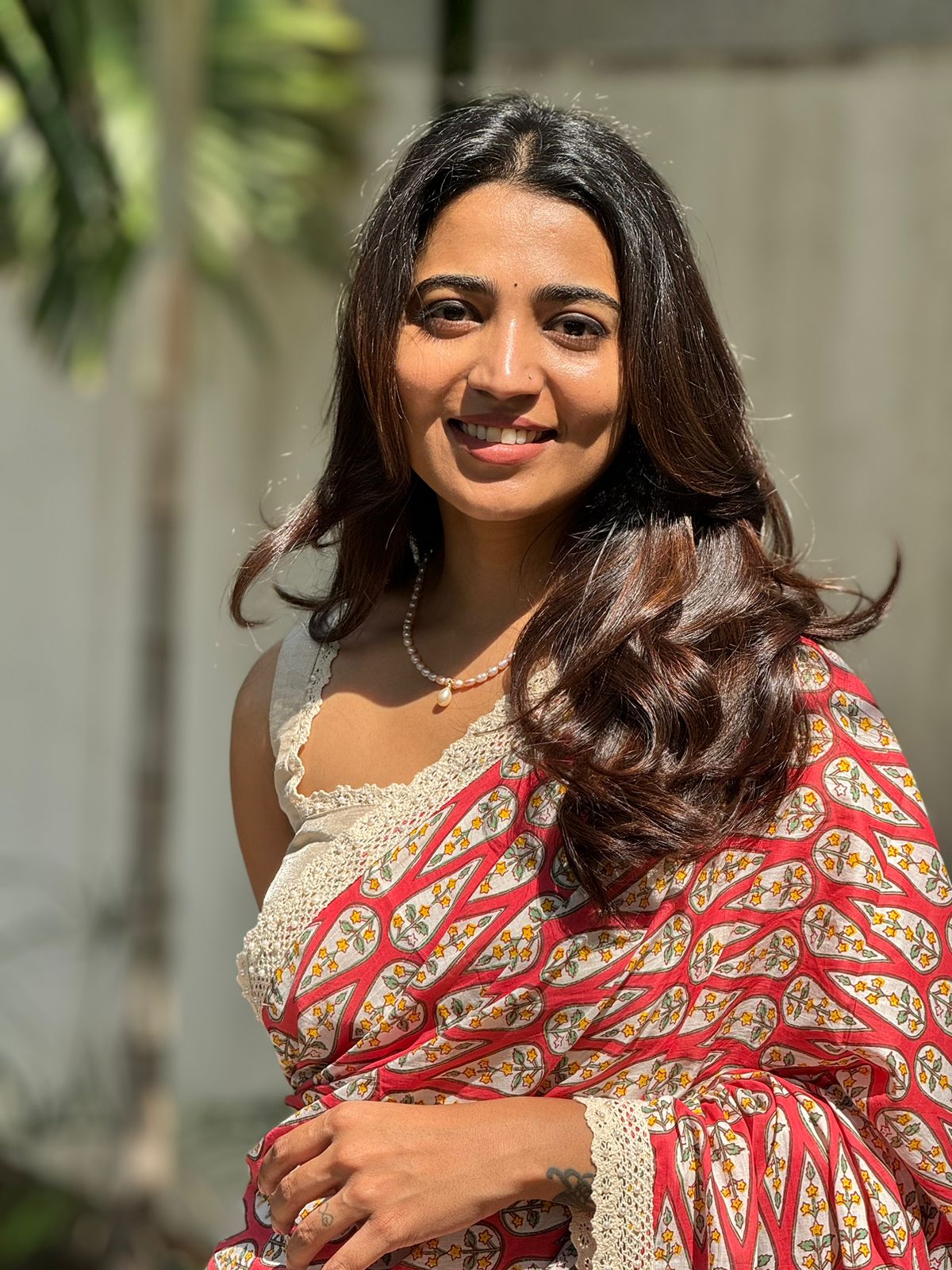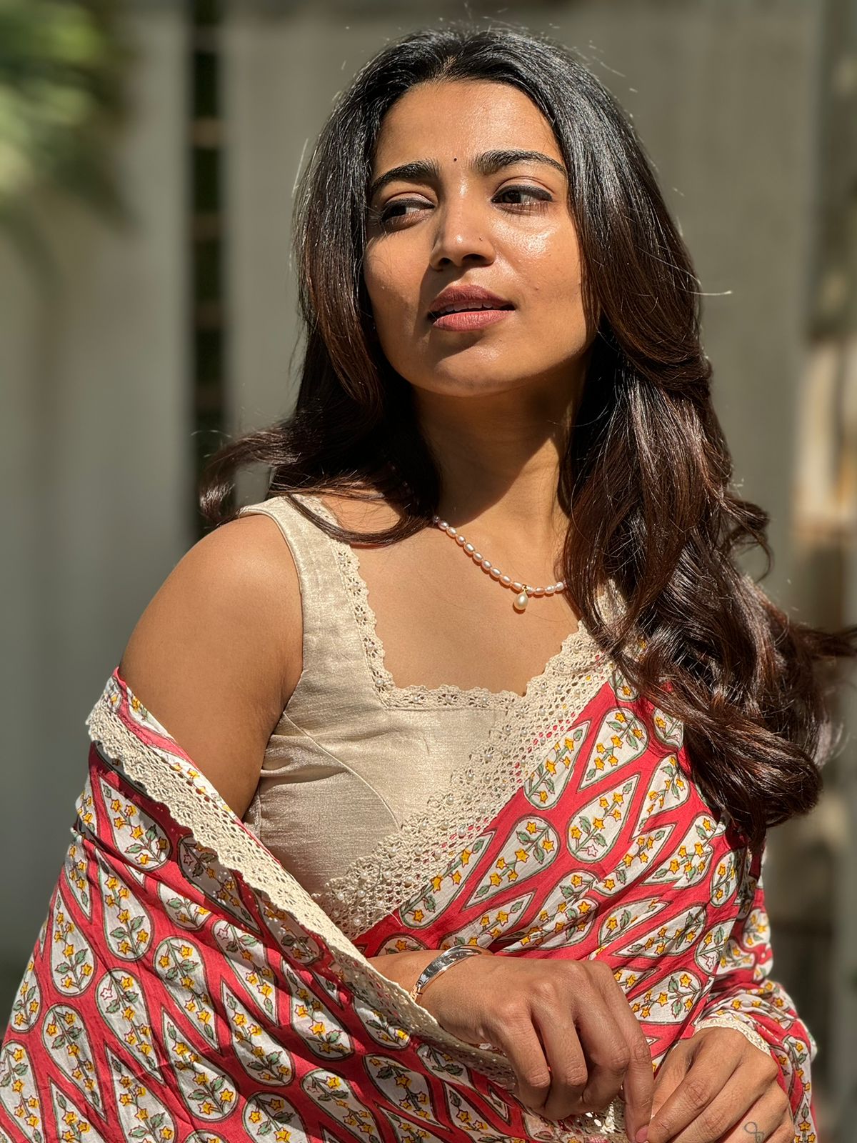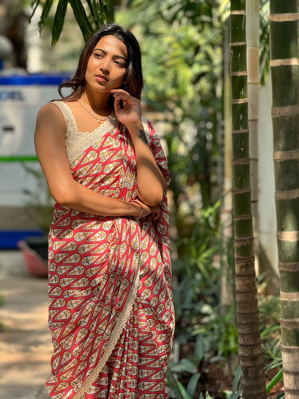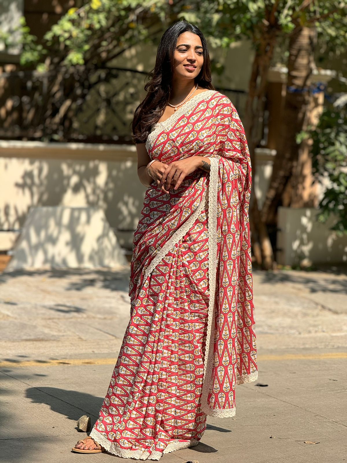 Pink pure mul mul cotton printed designer saree having crochet embroidery border works is paired up with half white cotton crochet embroidery worked sleeveless blouse