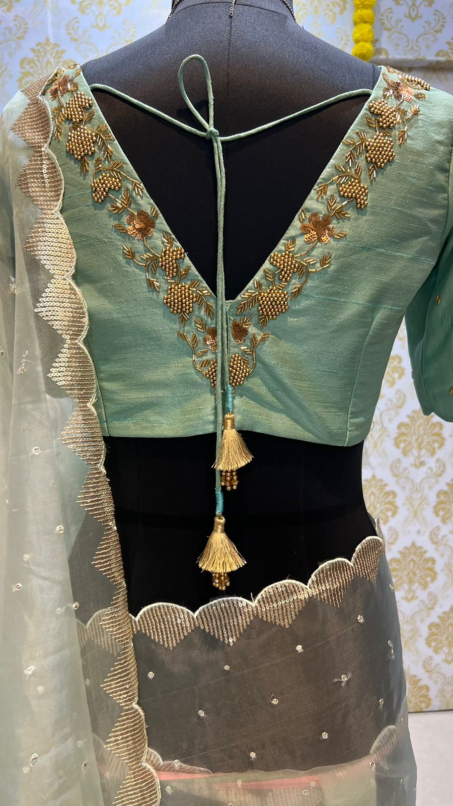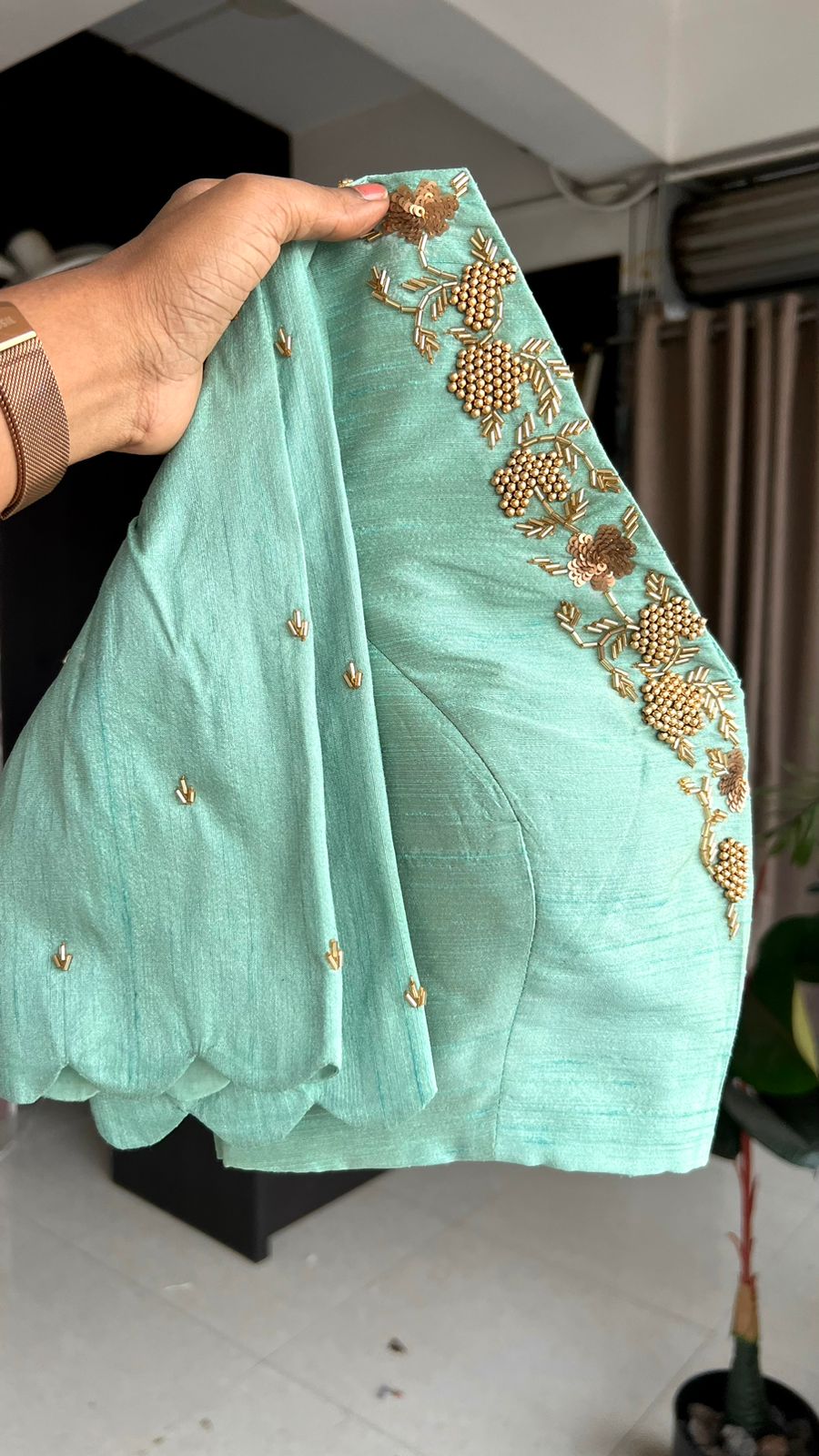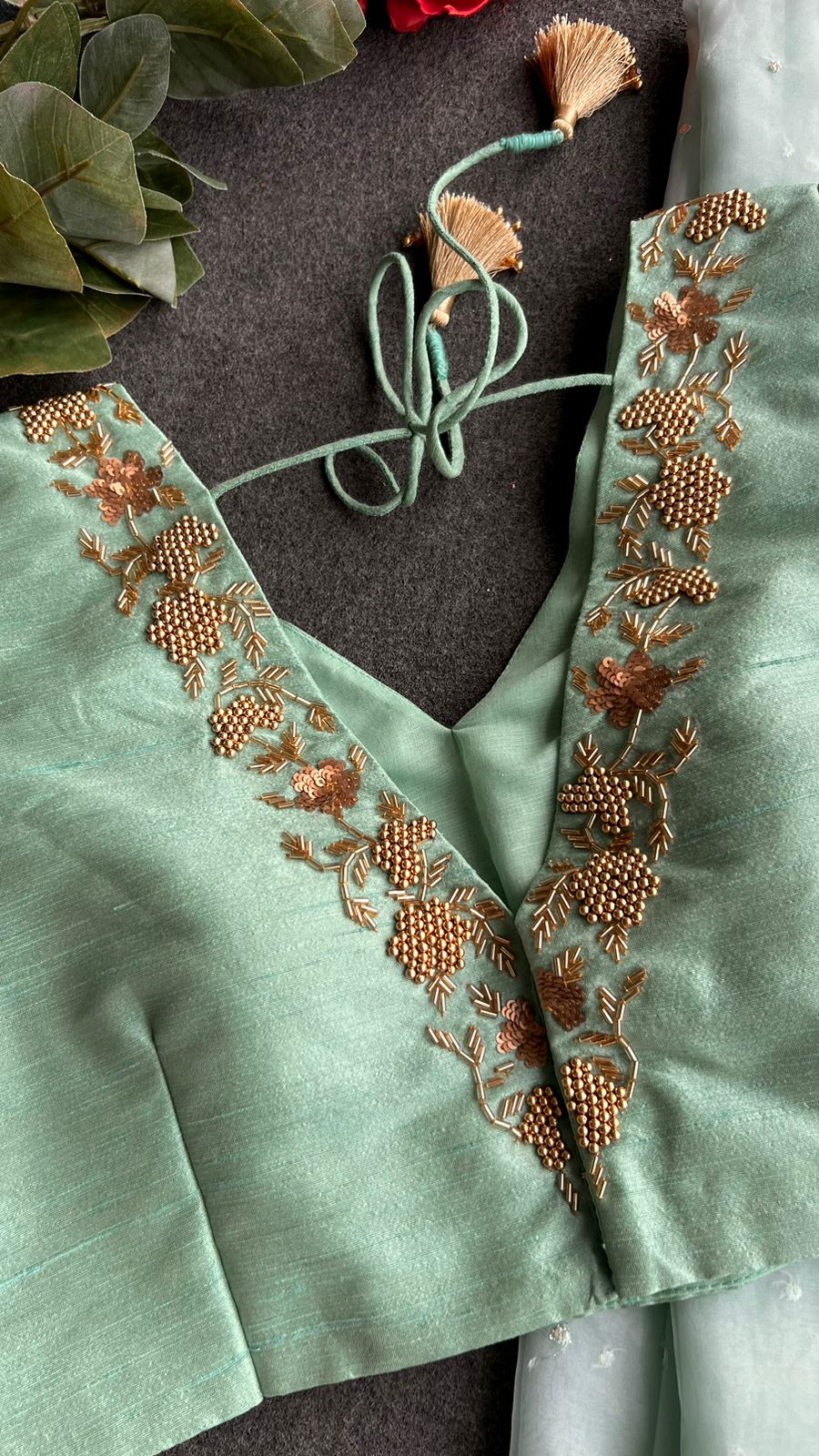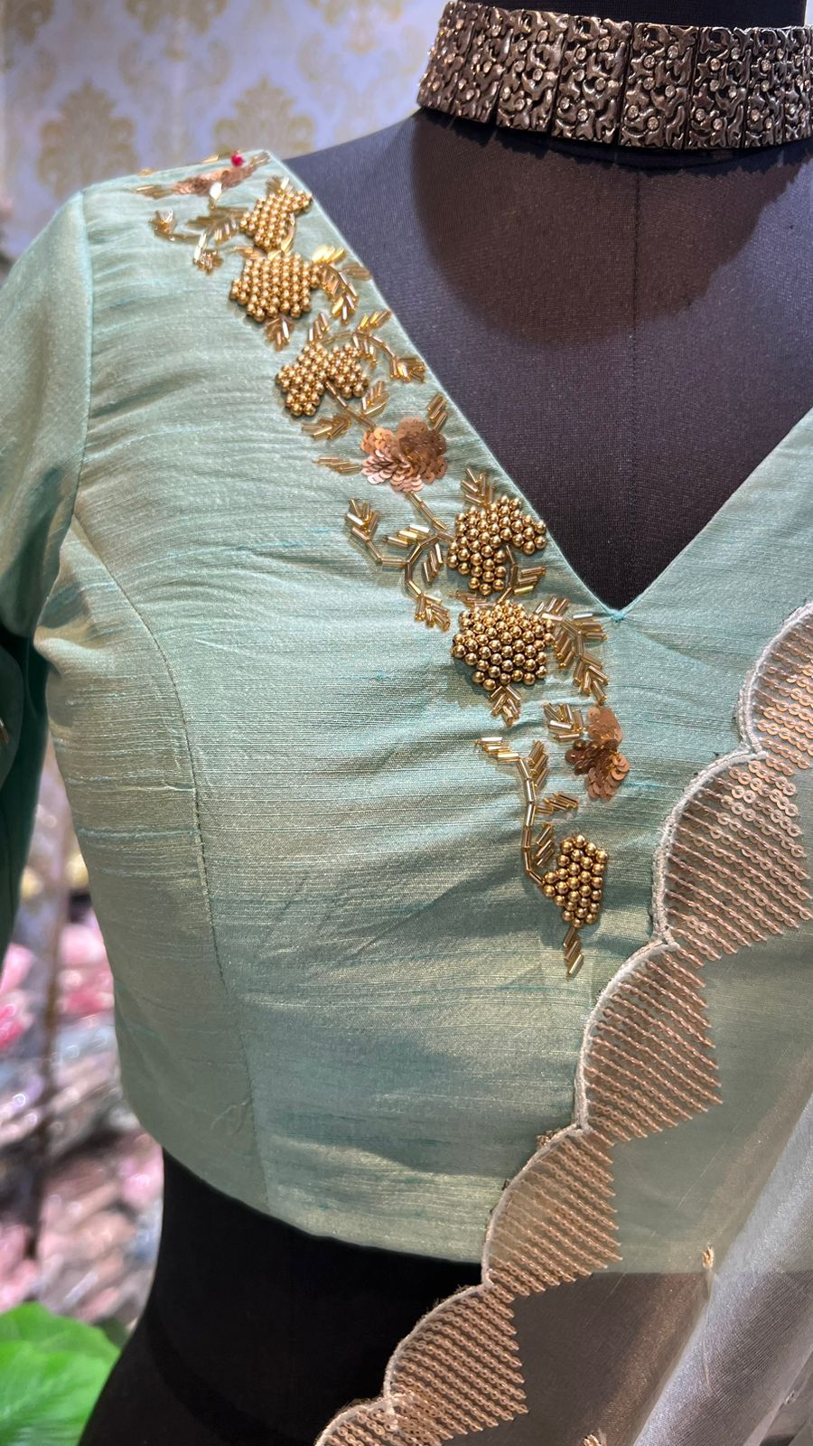 stunning sea green silk V neck handmade blouse having highlighted works for neck as shown.