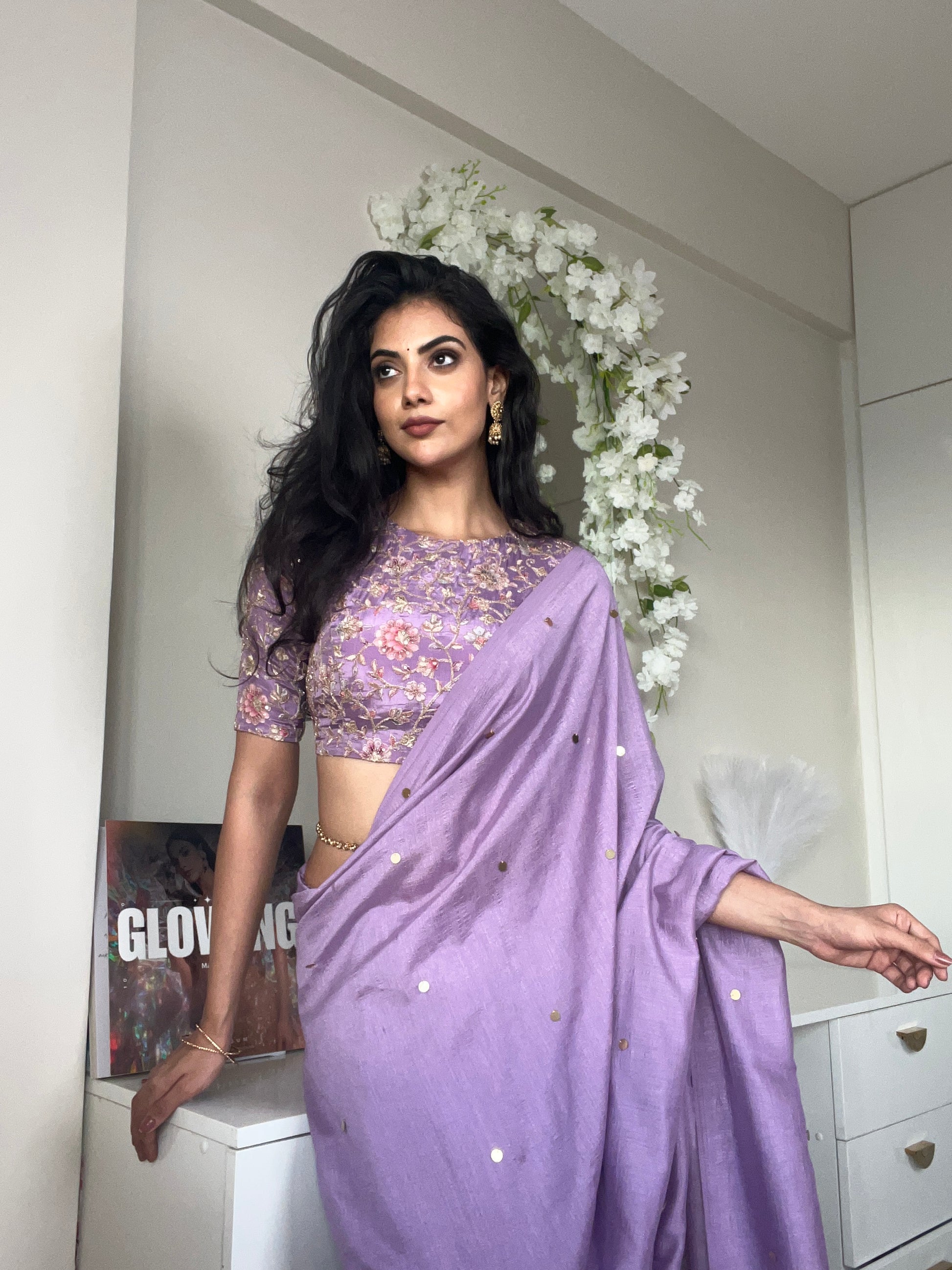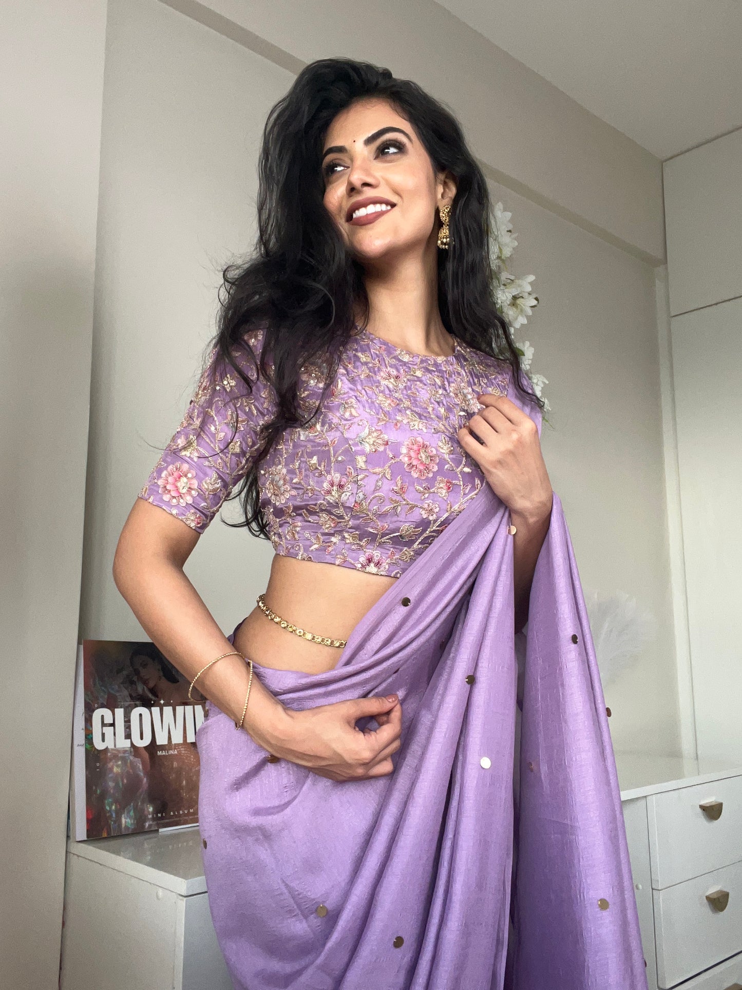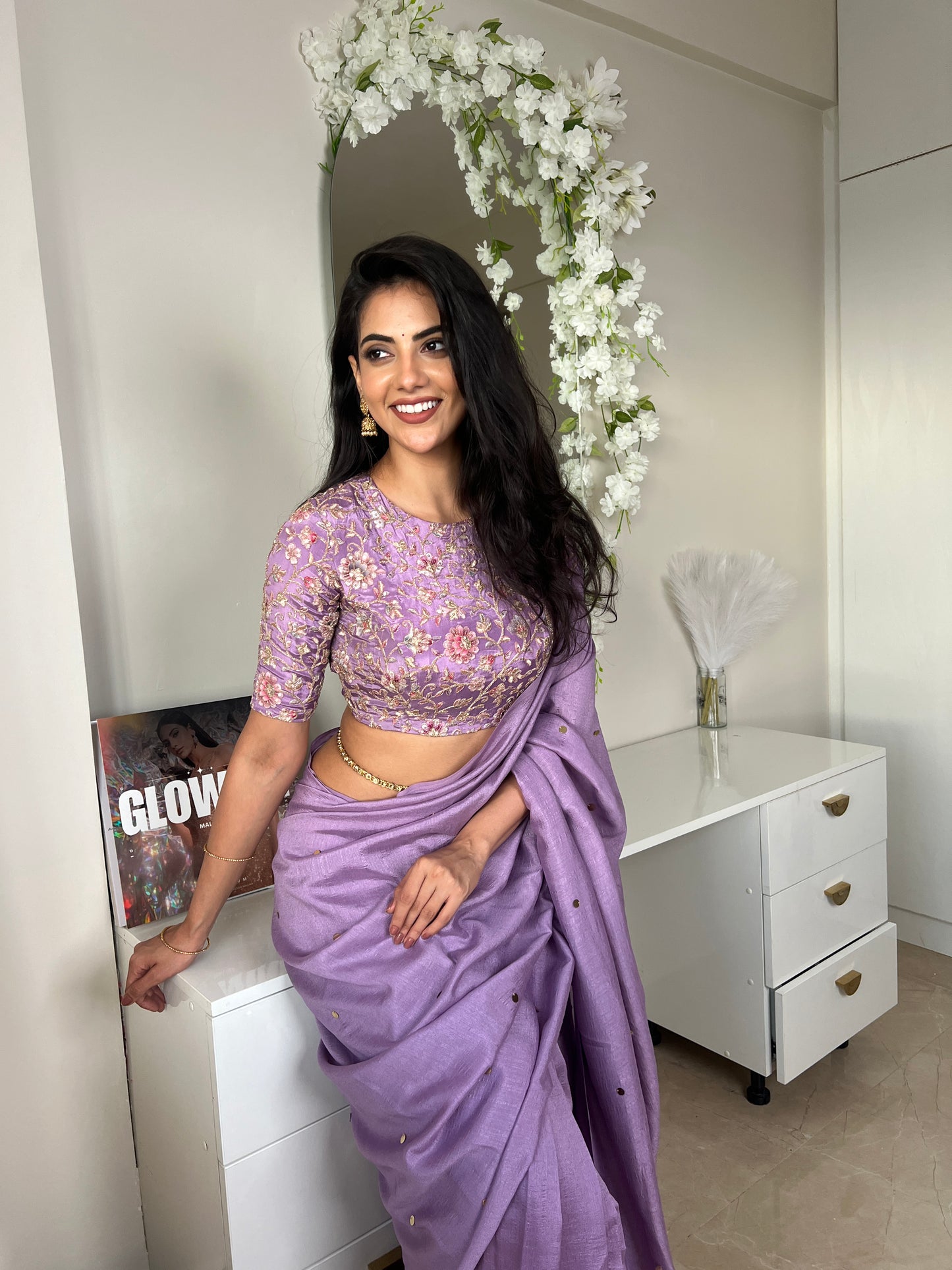 Lavender purple marble silk designer saree with tikki works all over is paired up with matching heavy embroidery worked blouse.