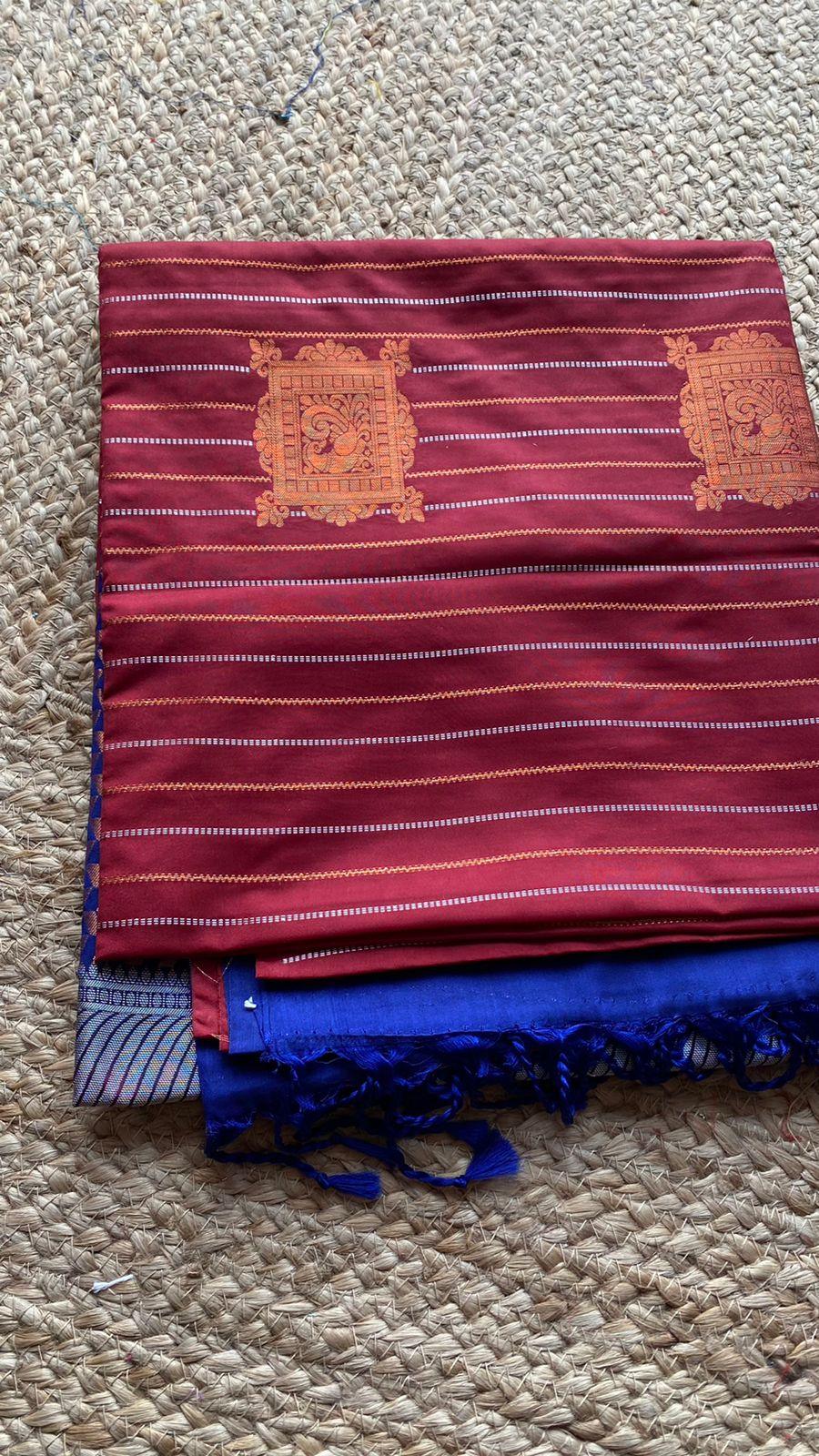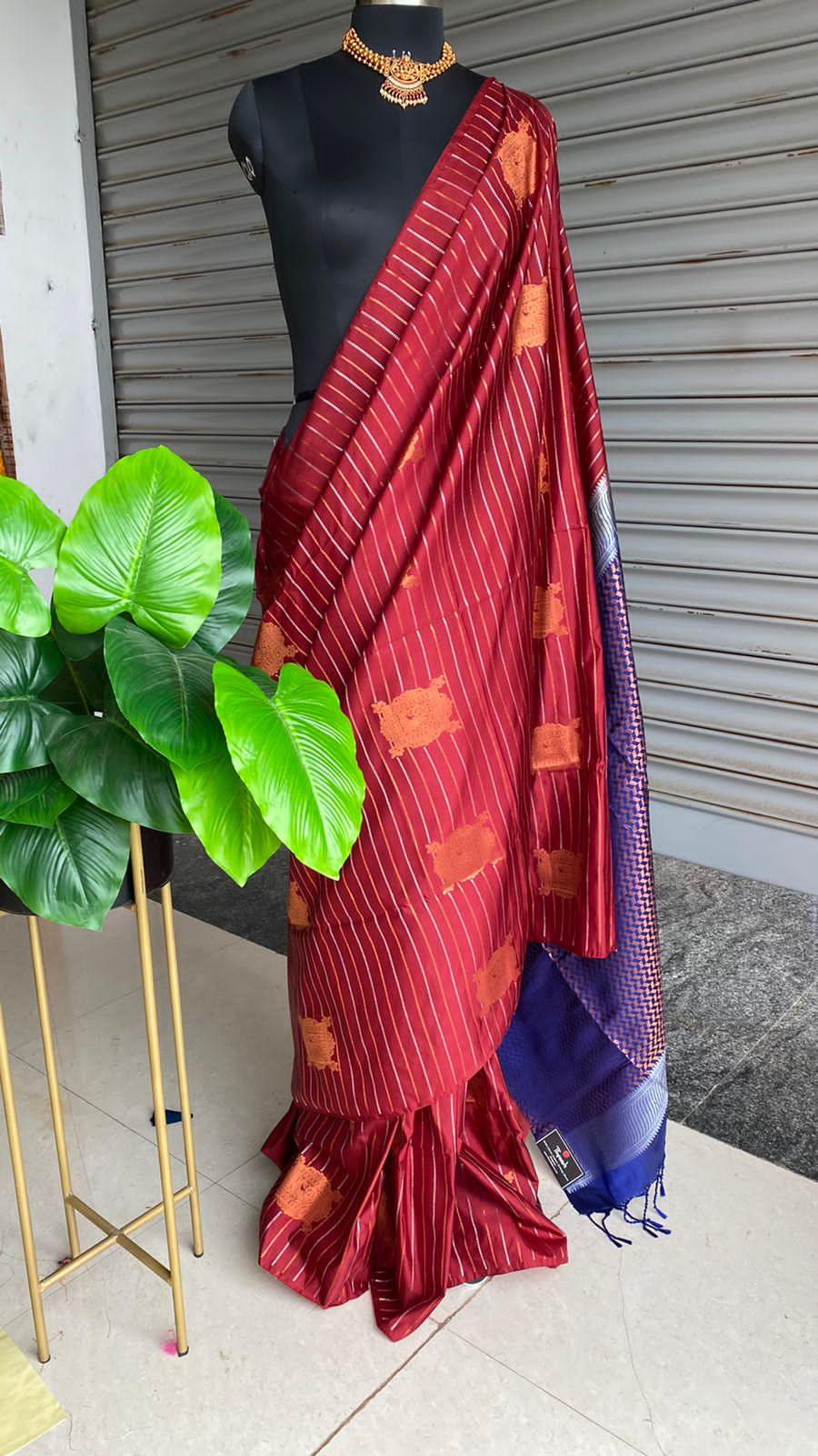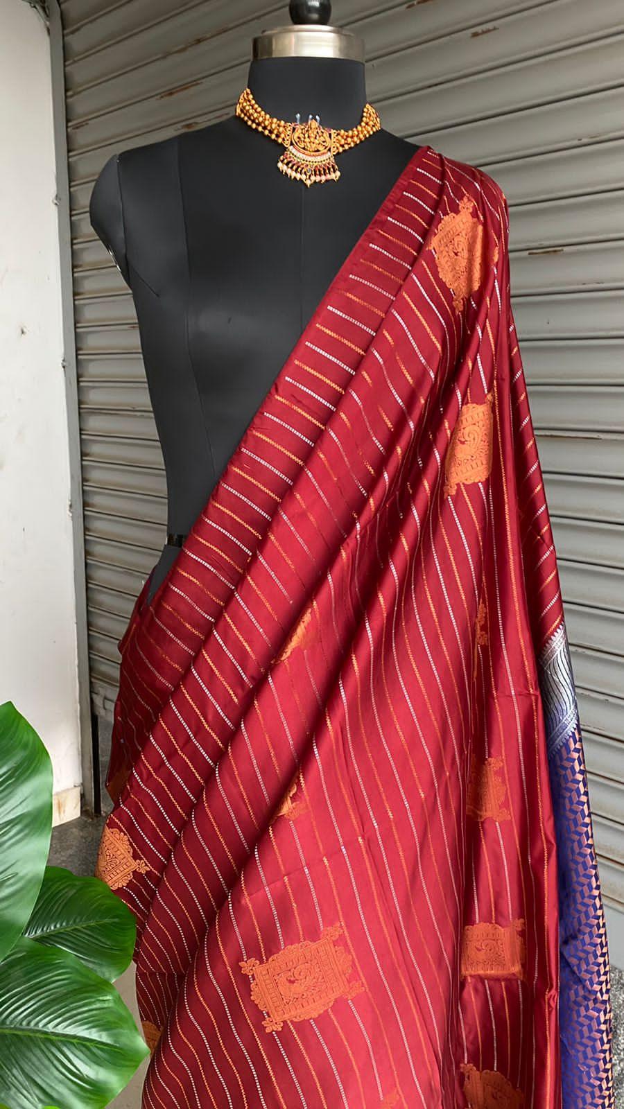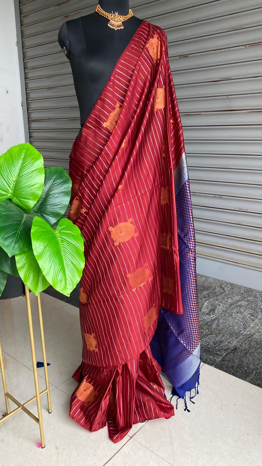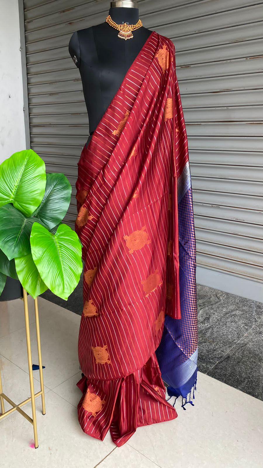 Maroon zari full weaved silk saree having golden zari motifs all over is comes with contract Blue silver golden zari pallu and matching running blouse.