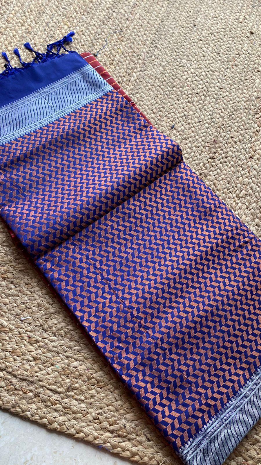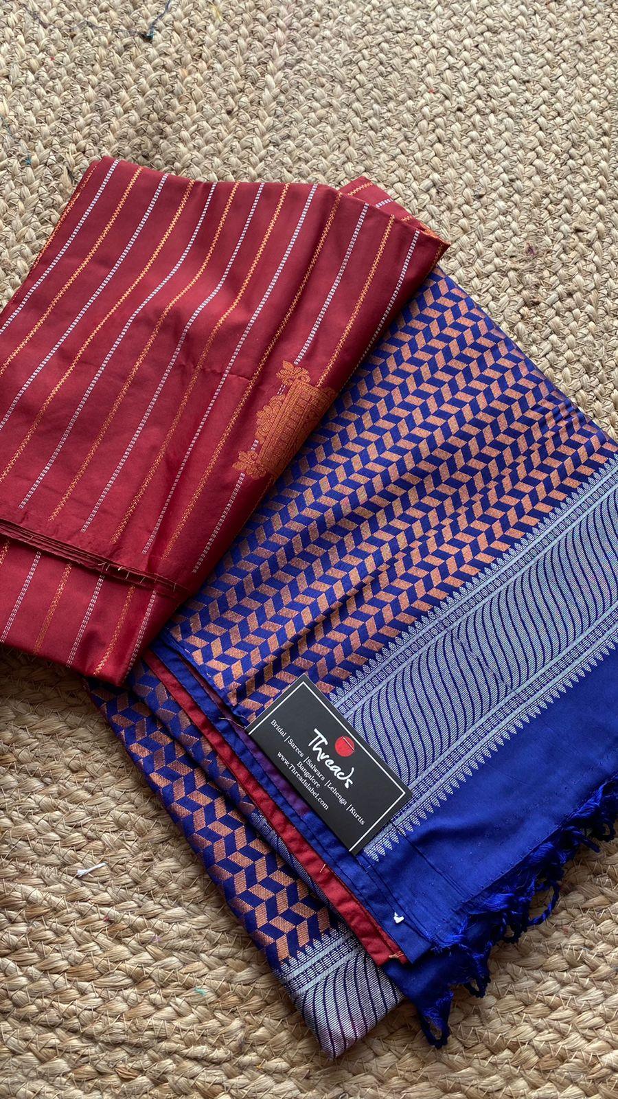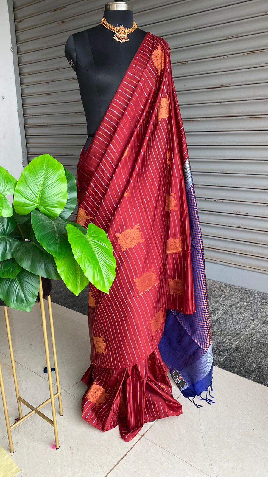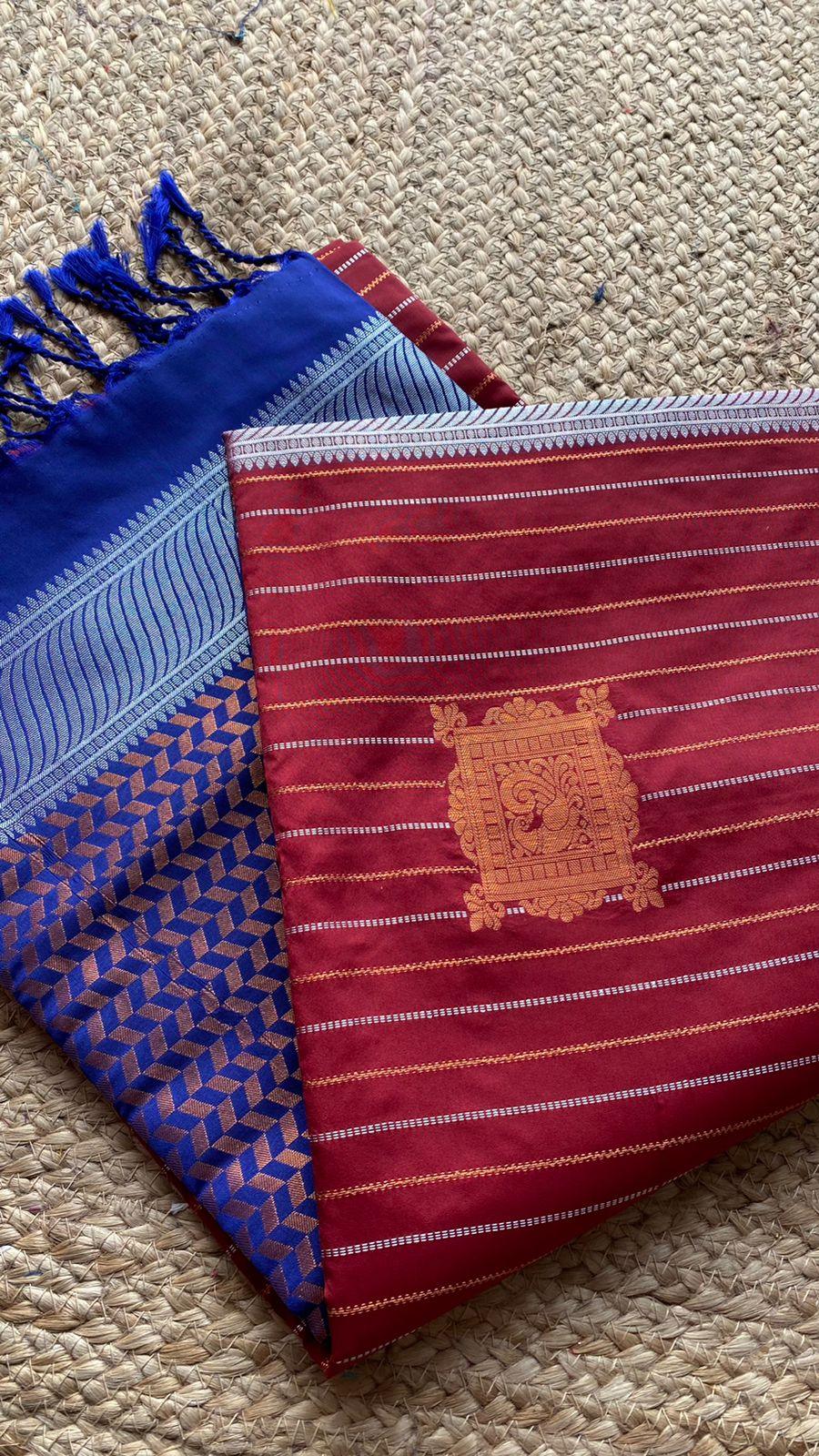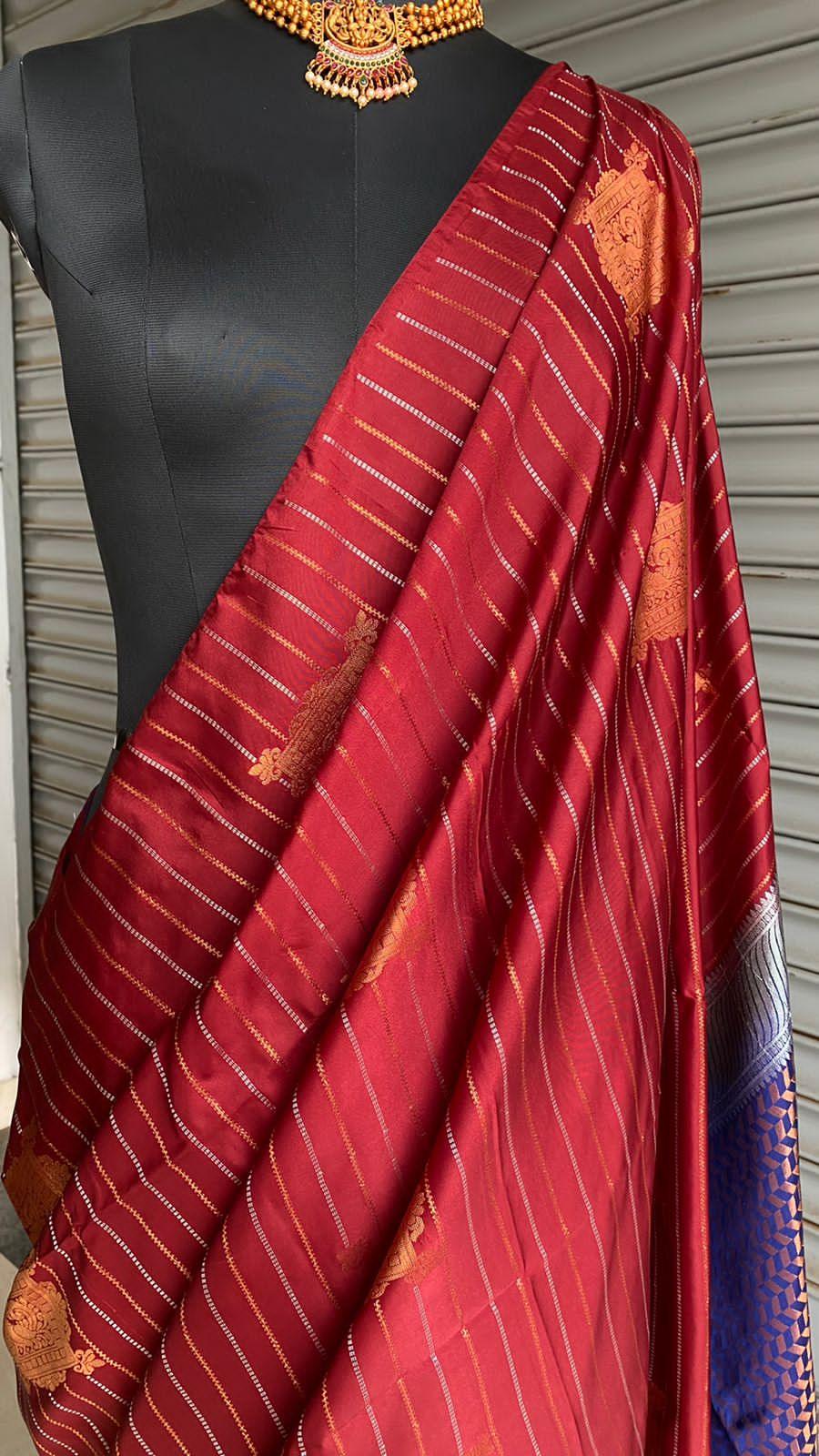 Maroon zari full weaved silk saree having golden zari motifs all over is comes with contract Blue silver golden zari pallu and matching running blouse.