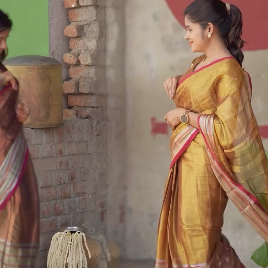 Copper soft tissue saree with silver liquid border and pallu works is paired up with matching tissue patterned blouse having highlighted hand works for front & sleeves as shown.