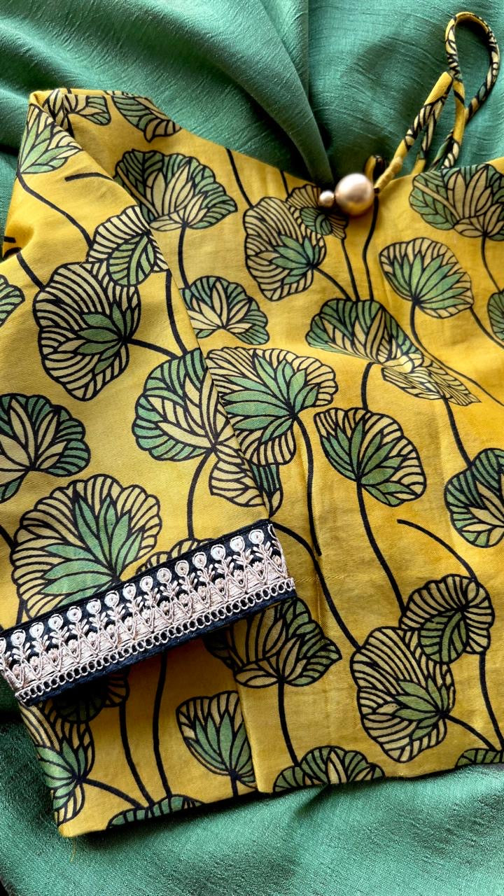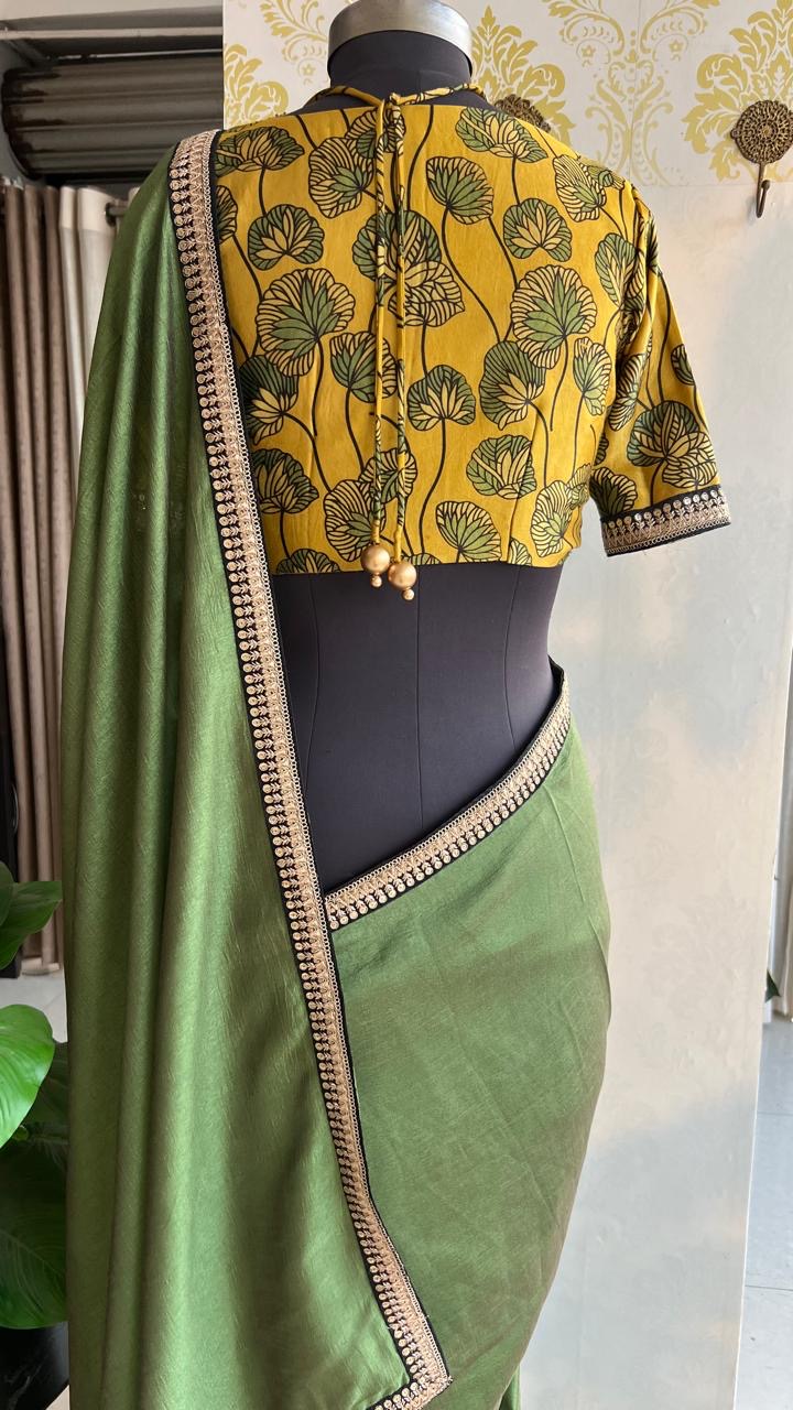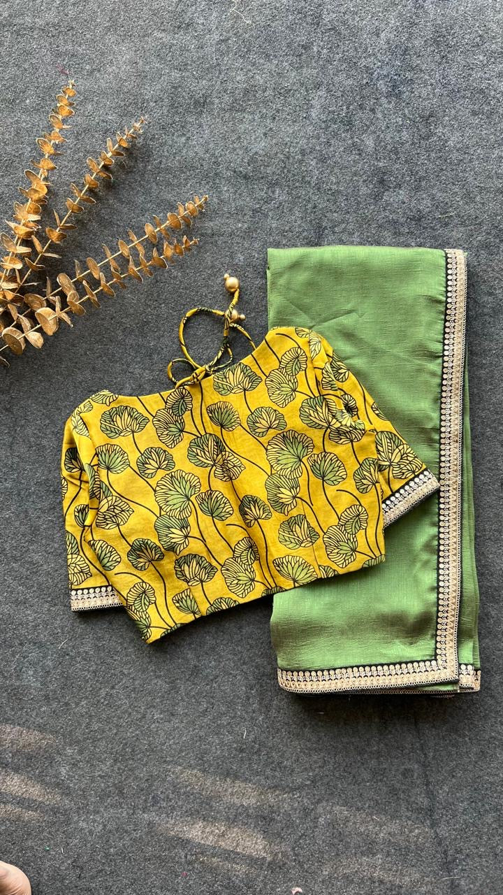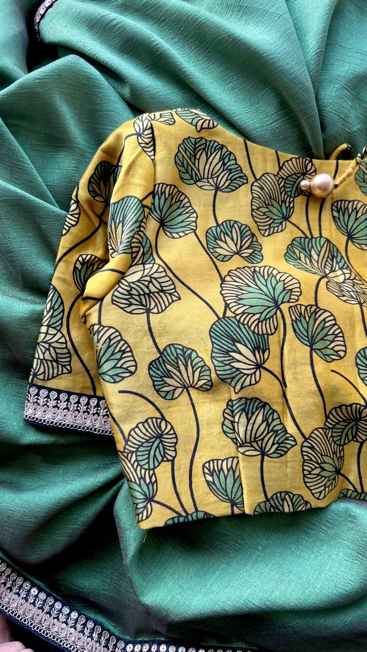 Green marble silk saree with embroidery border works is paired up with mustard yellow pure silk floral printed blouse having embroidery works for sleeves.