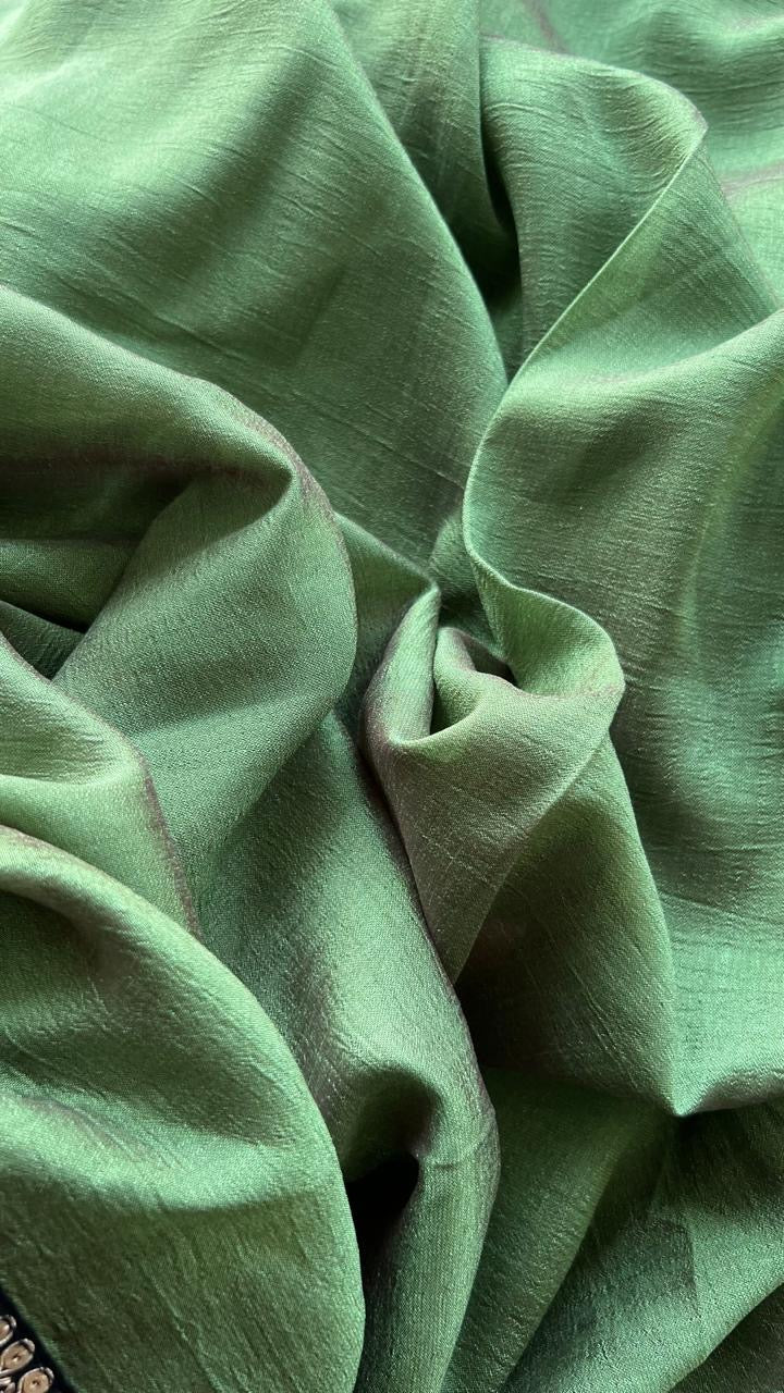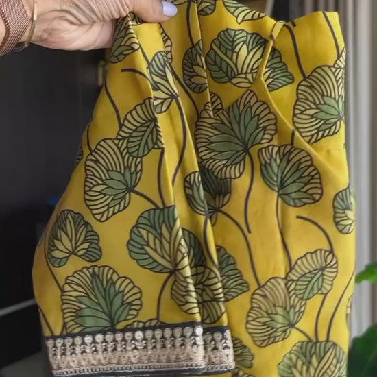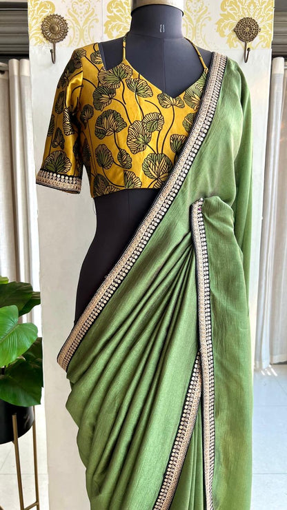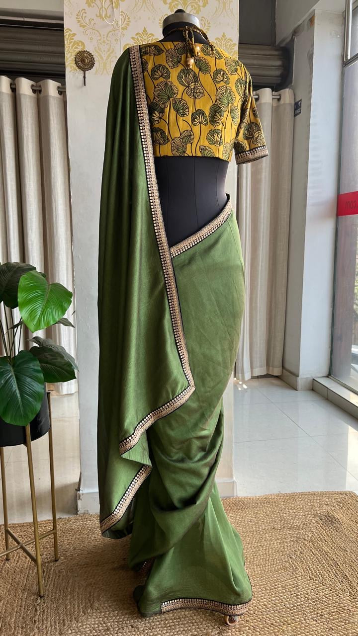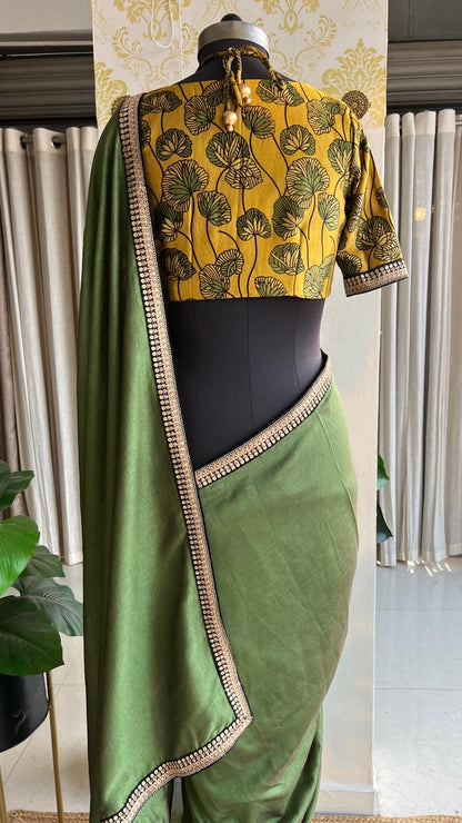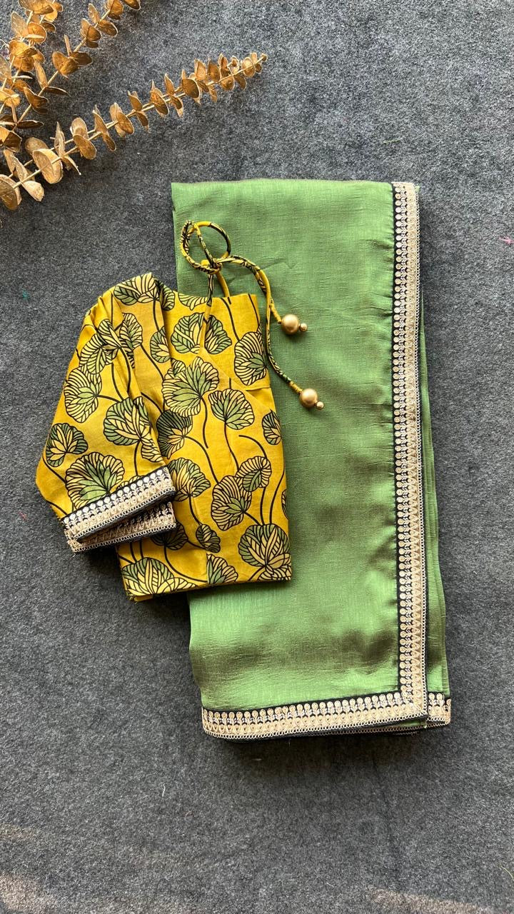 Green marble silk saree with embroidery border works is paired up with mustard yellow pure silk floral printed blouse having embroidery works for sleeves.