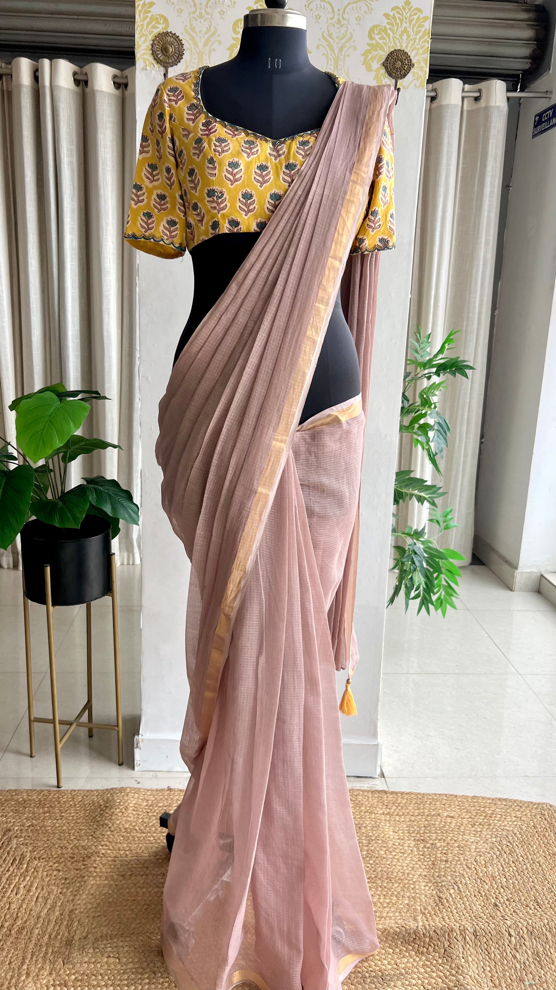 Light peach mul kota saree with yellow hand work blouse