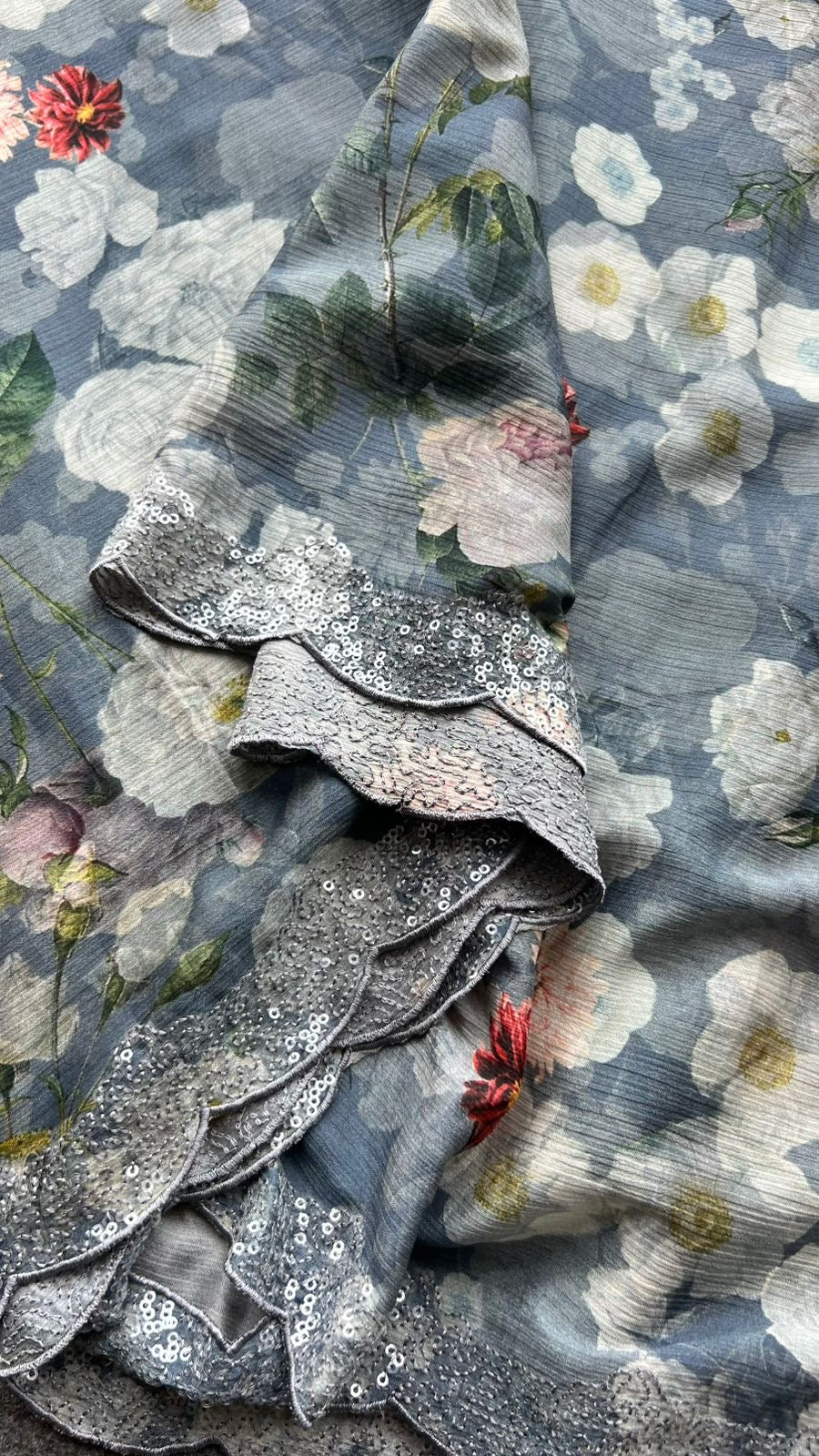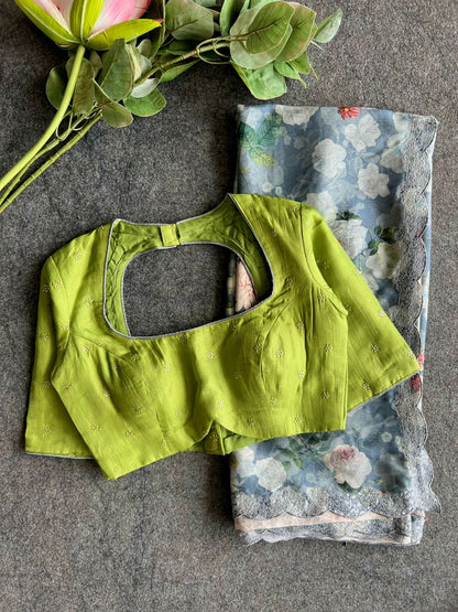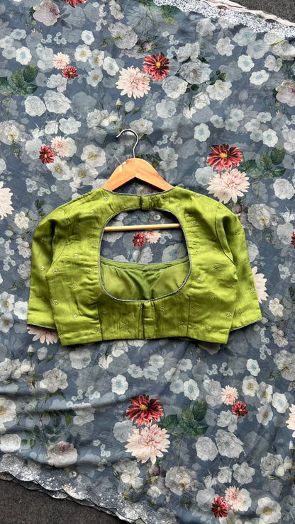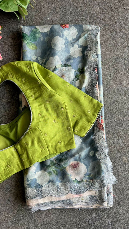 Grey floral printed pure chiffon saree with embroidery border works is paired up with green soft jute embroidery work blouse as shown