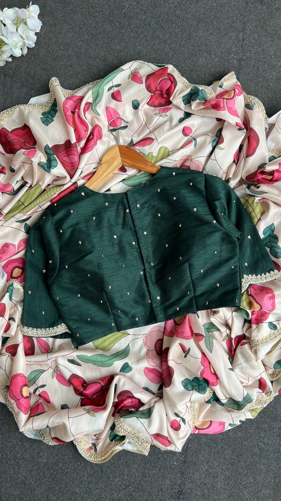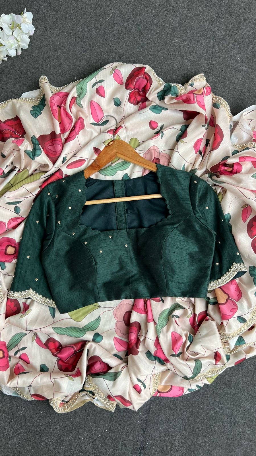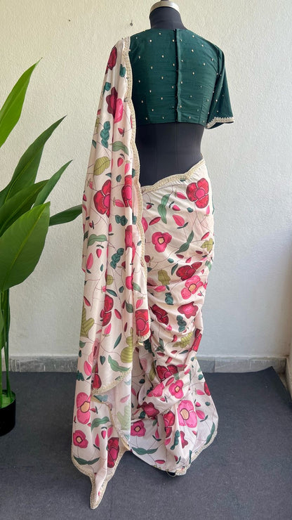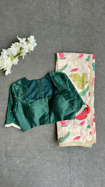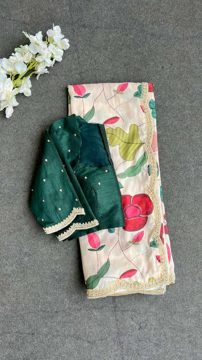 Half white floral printed soft kossa silk designer saree with heavy scalloped pearl border works is paired up with bottle green silk patterned blouse having hand works for sleeves.