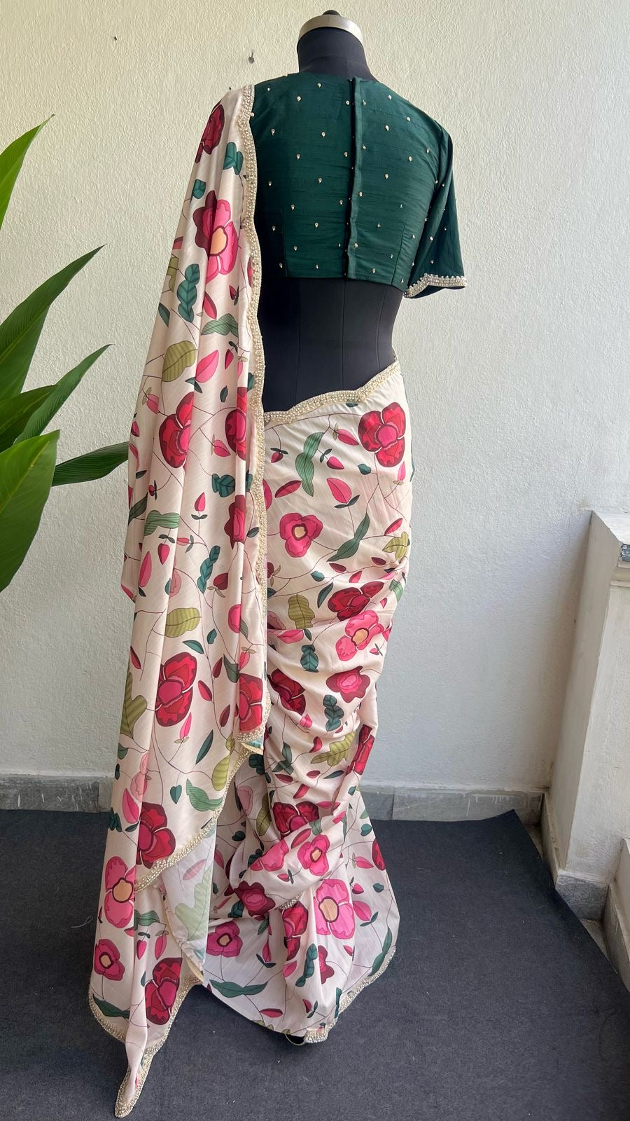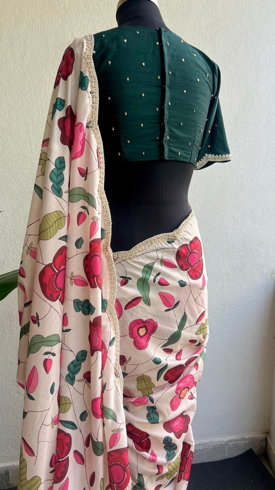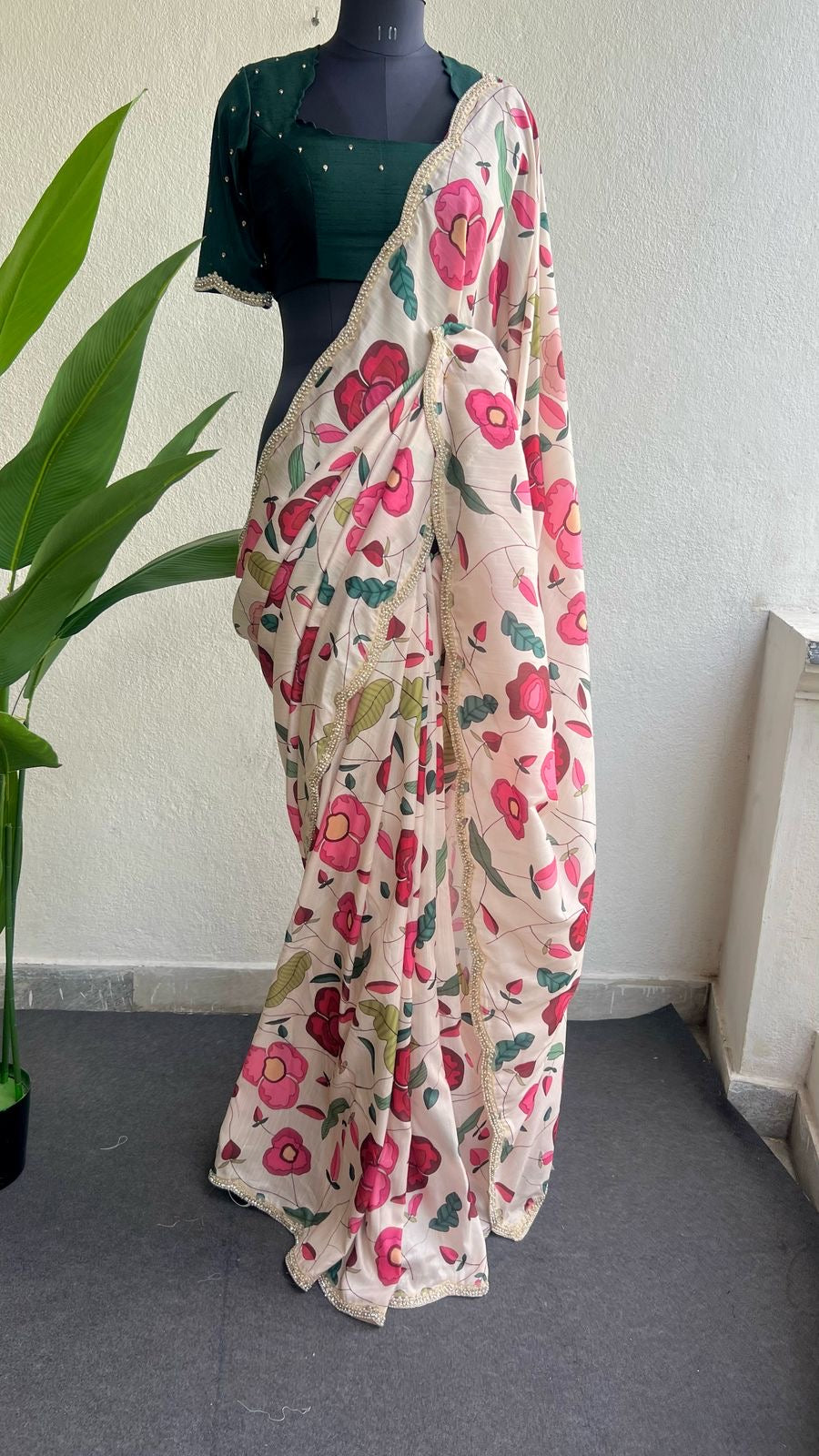 * Works : Floral prints all over the saree & Heavy scalloped embroidery pearl border works