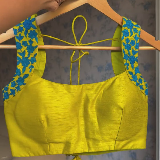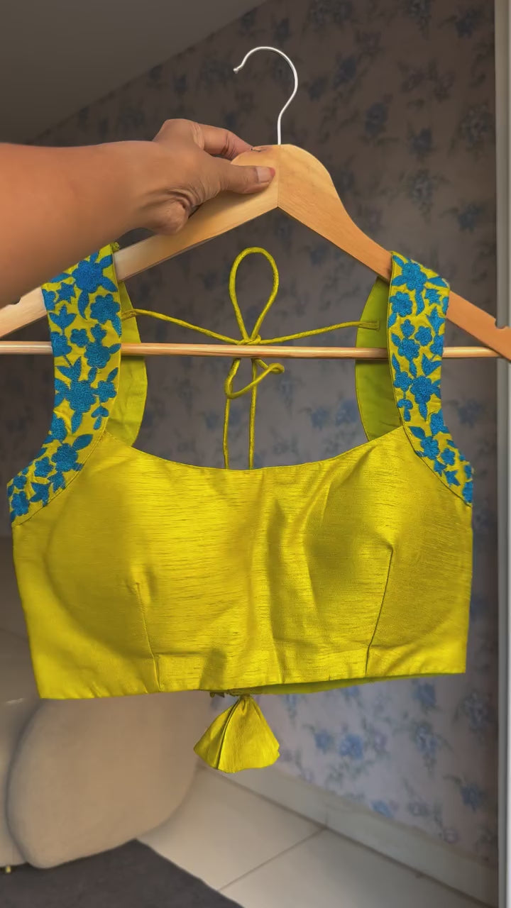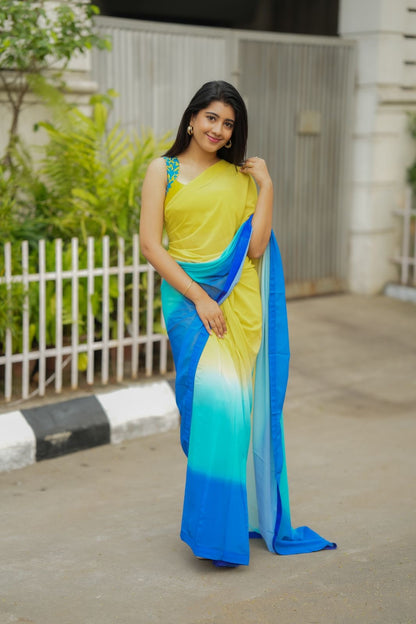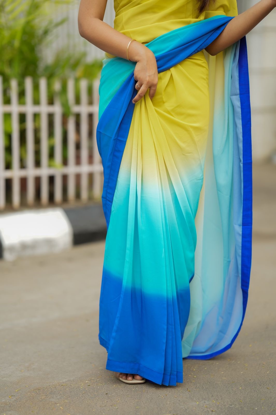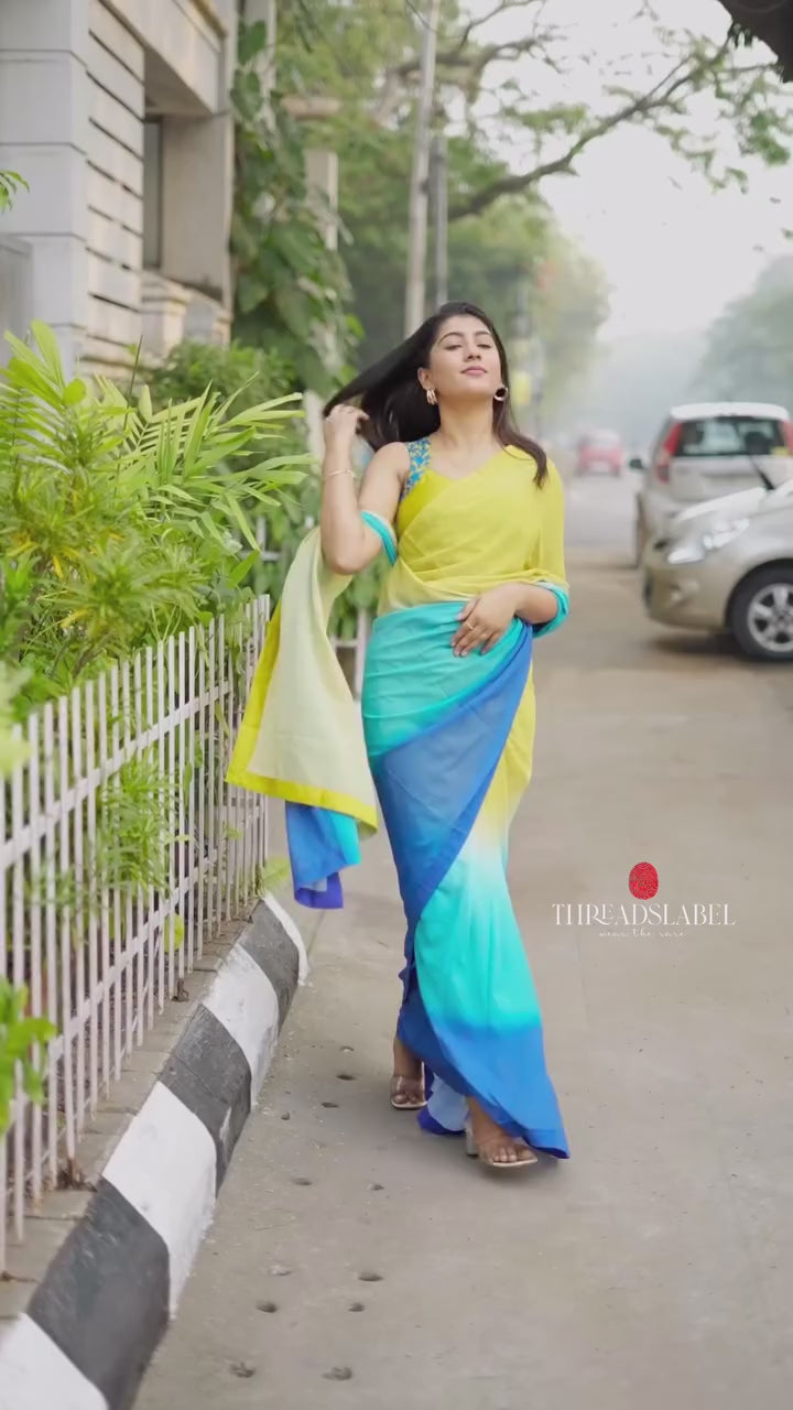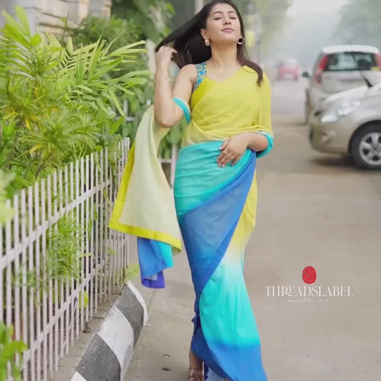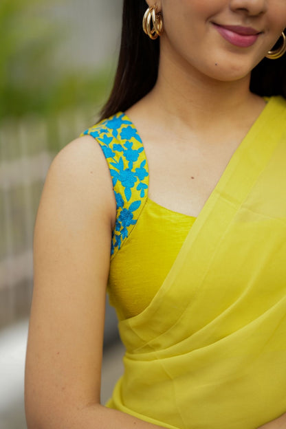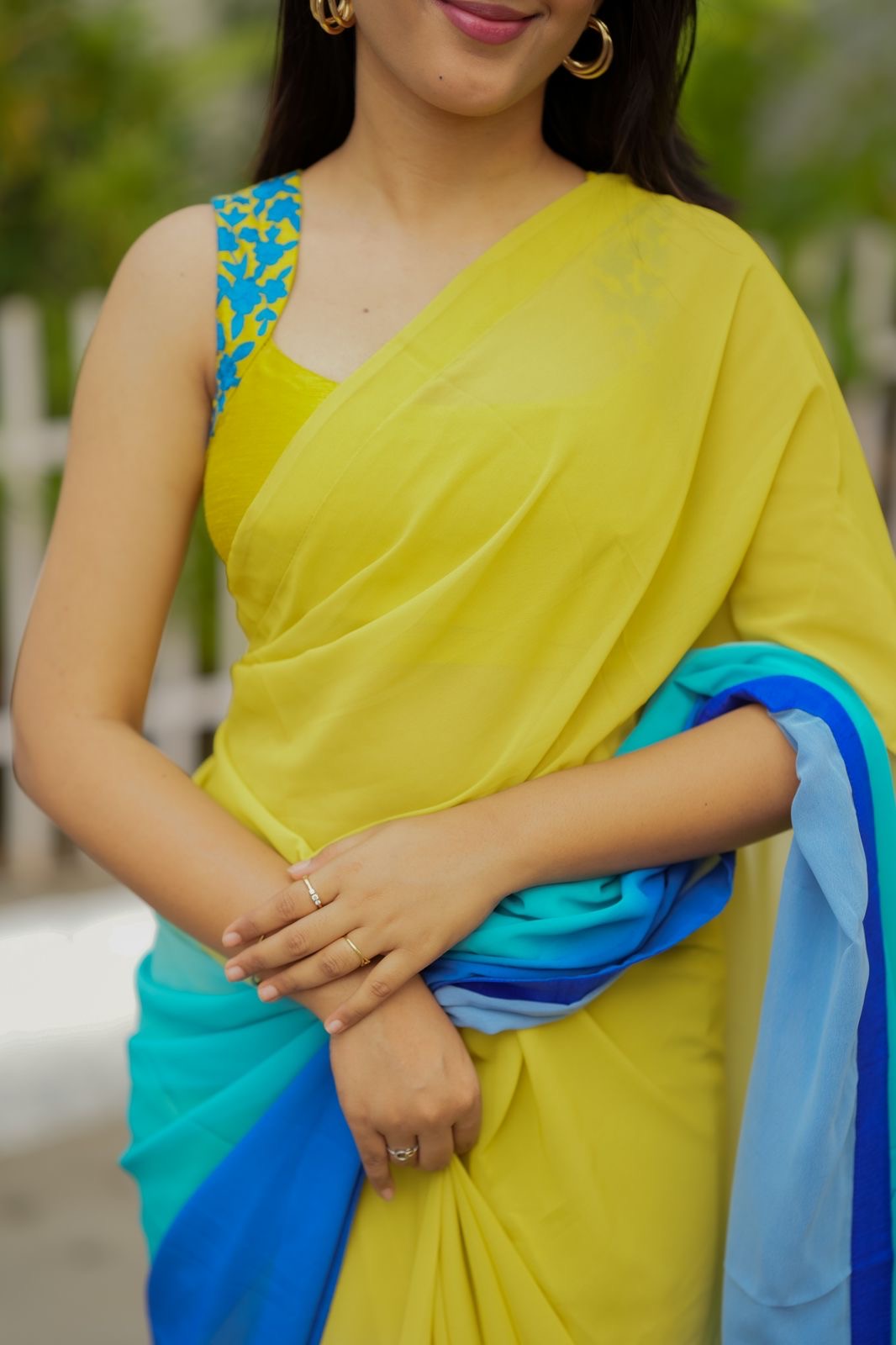 Multi colour georgette  designer saree with matching liquid patti border works is paired up with lime yellow silk hand embroidery worked blouse as shown