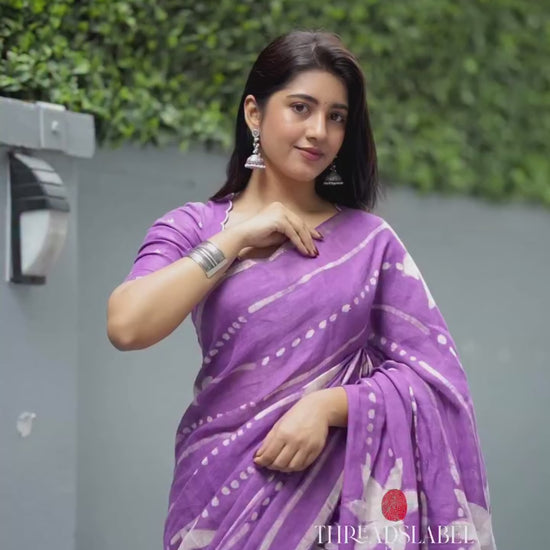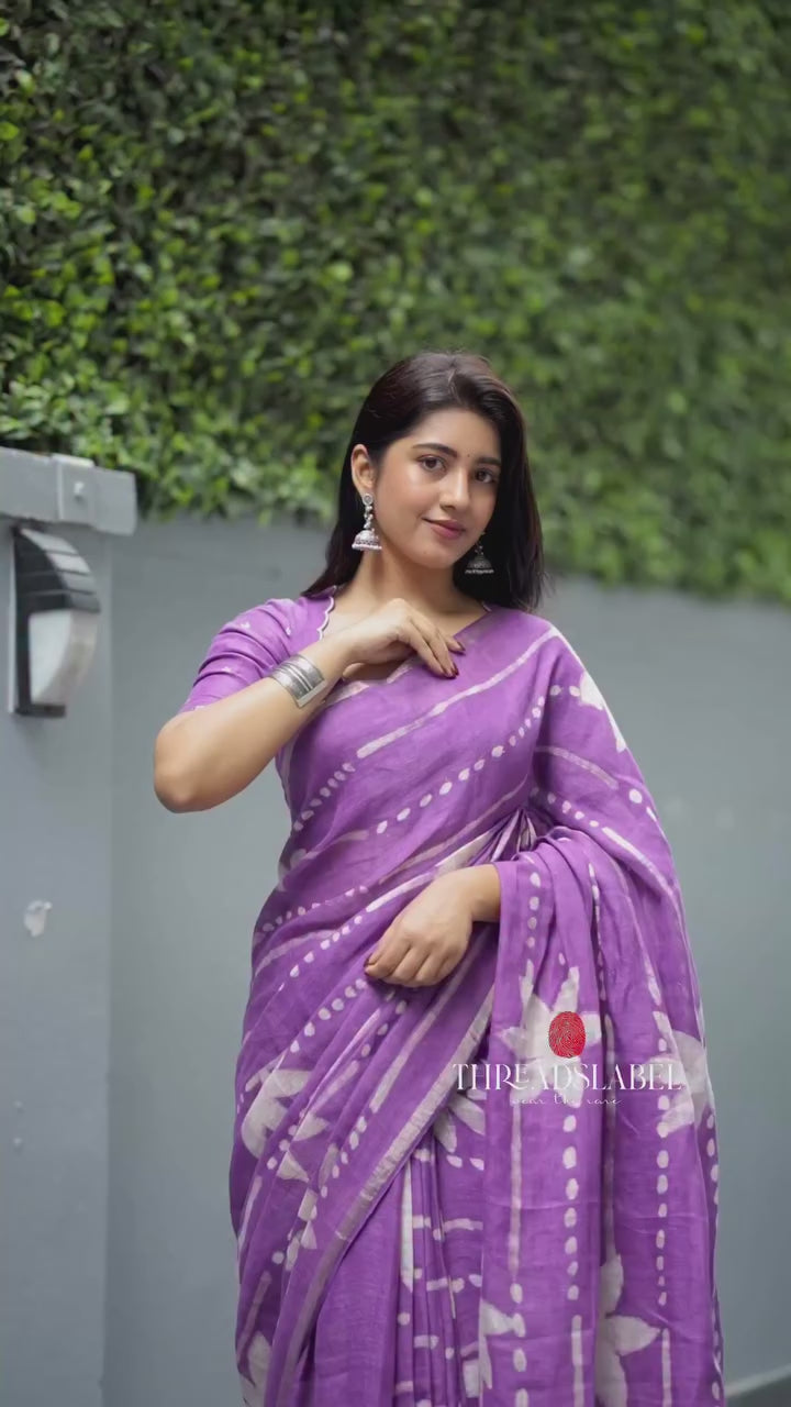 This sophisticated purple linen saree features delicate stripes and floral prints with a zari woven border. It includes a matching blouse adorned with detailed hand embroidery and scalloped designs on the neck and back.