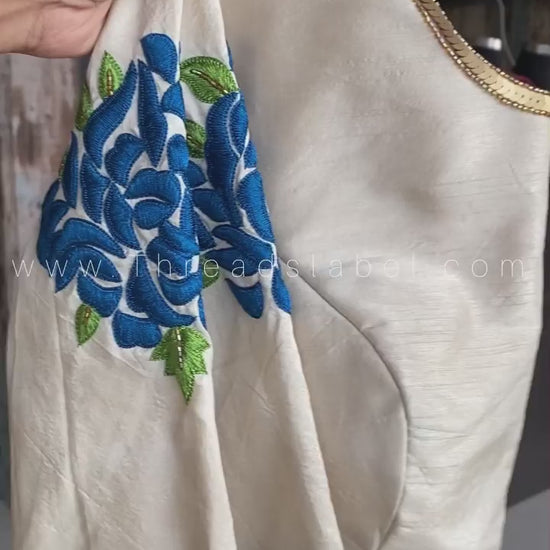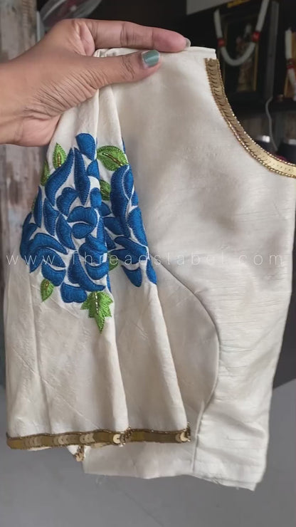 Half white silk blouse that includes intricate threaded embroidery works on sleeves and highlighted hand works for neck front & back of blouse..!!