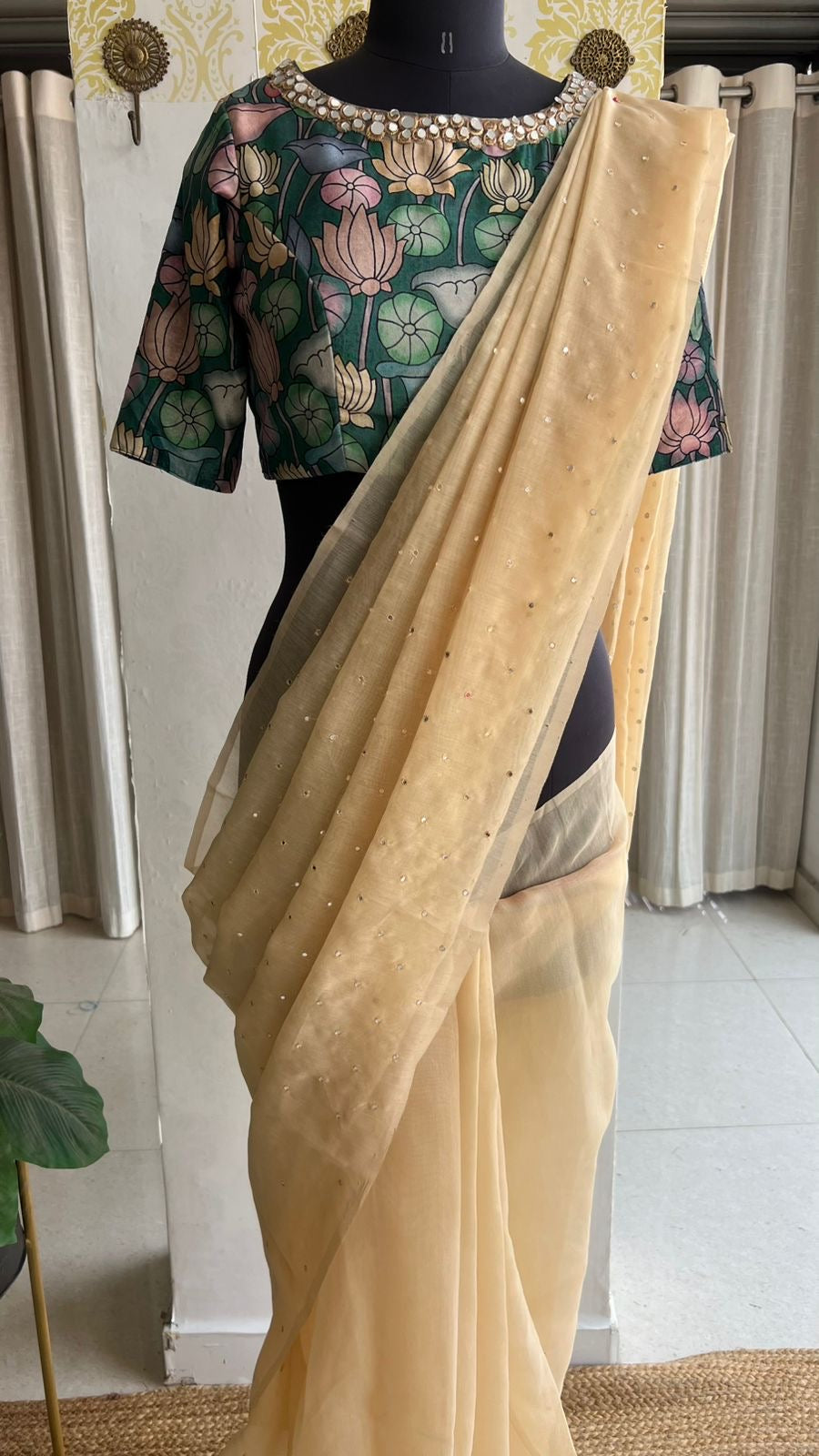 Banana yellow chanderi cotton tissue designer saree with mirror embroidery works all over the saree is paired up with green floral velvet blouse having highlighted mirror embroidery for neck as shown.