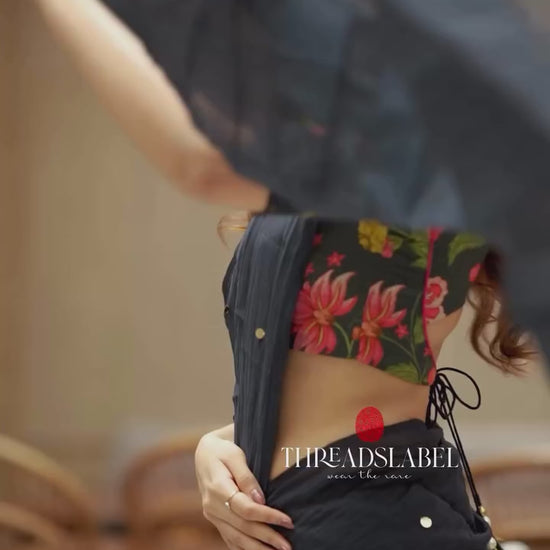 Black chanderi cotton floral print blouse (only blouse)