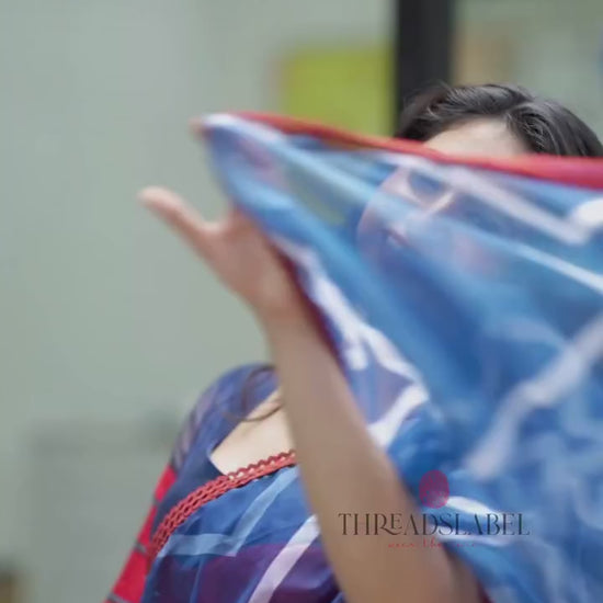 Blue & maroon printed pure organza designer saree with maroon crochet lace border works is paired up with maroon & blue silk netted , patterned blouse as shown.