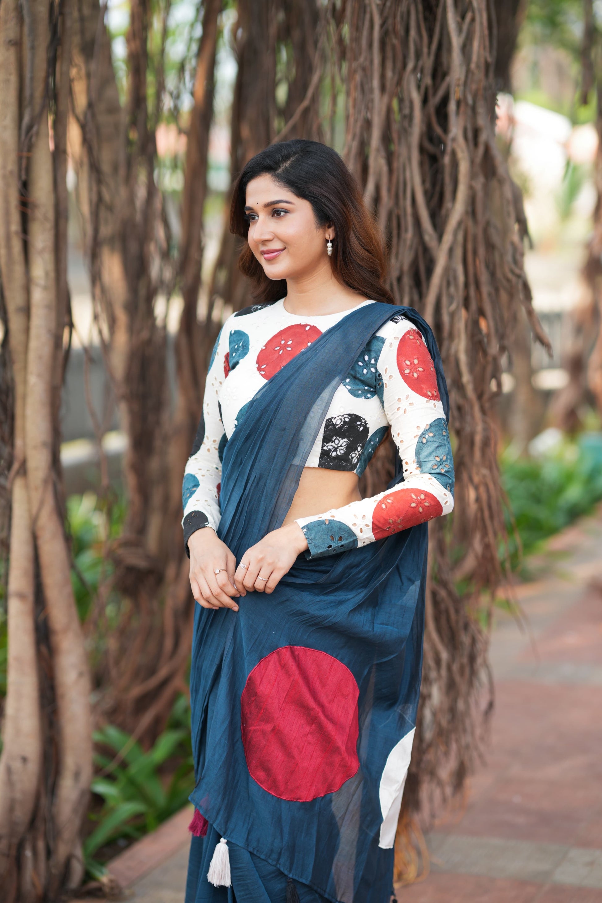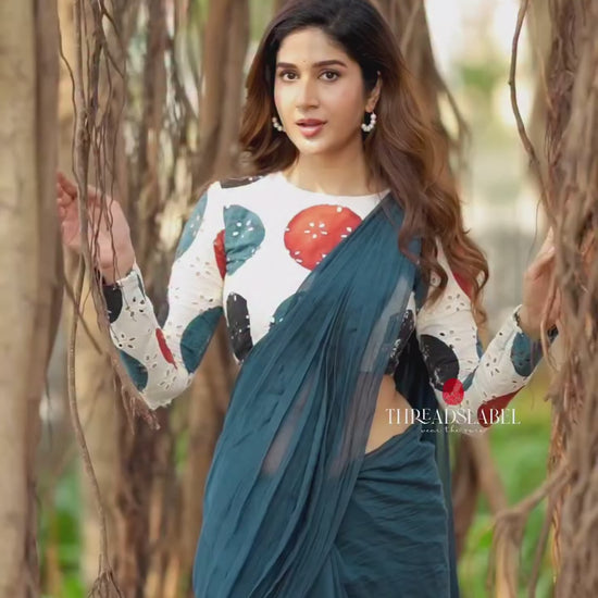 Blue mul chanderi cotton designer saree with polka dot embroidery worked pallu is paired up with cream hakoba cotton embroidered ajrak hand block printed blouse as shown.
