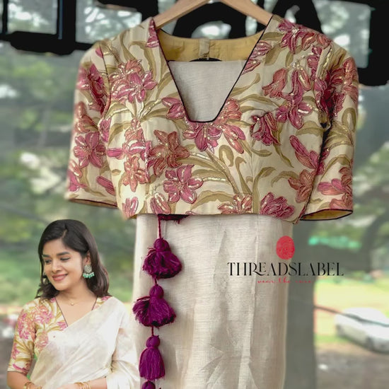 Cream soft tissue saree with black liquid zari border and pallu works is paired up with matching silk floral embroidery worked blouse as shown.