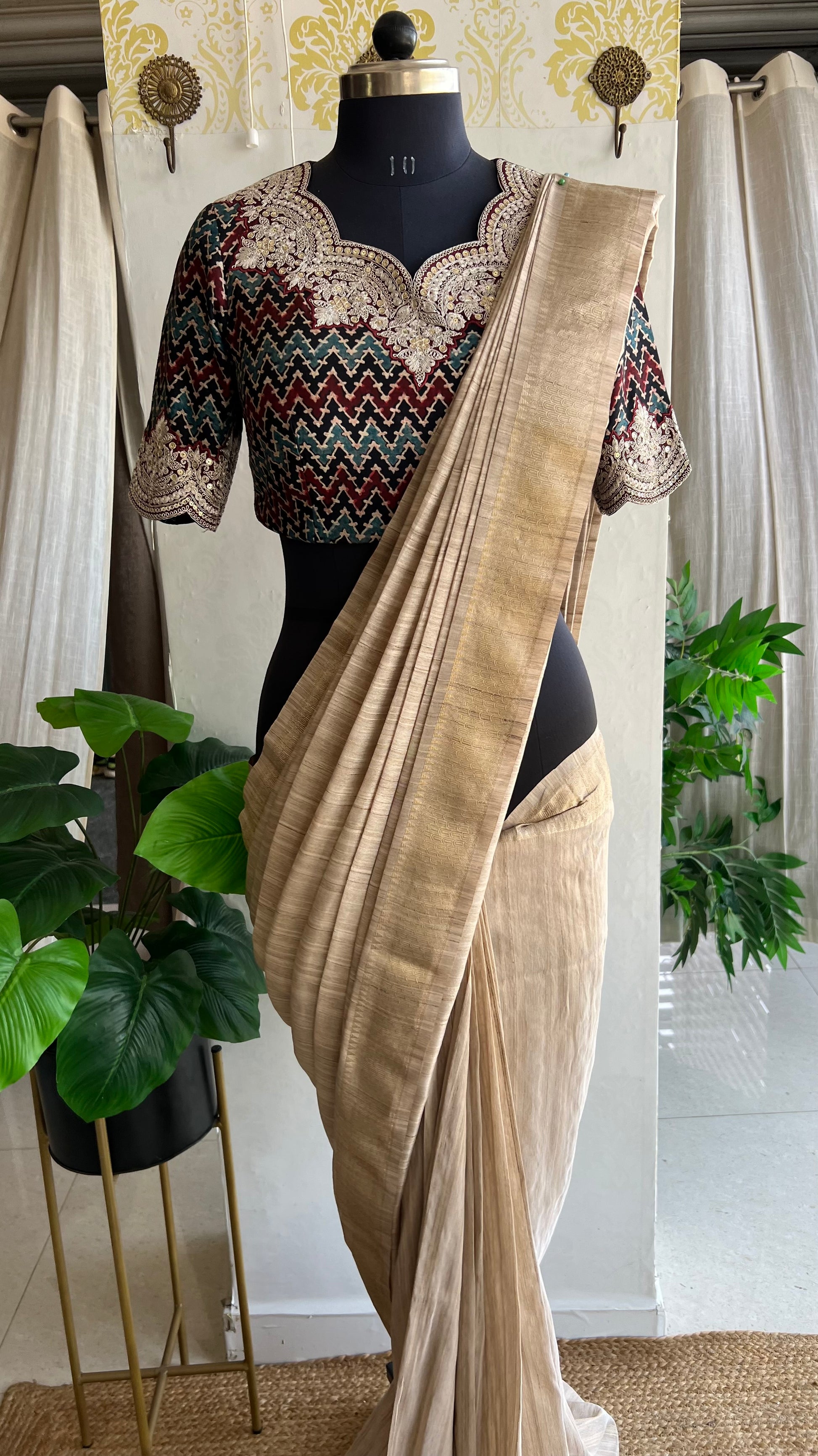 Golden cream tissue saree with ajrak embroidery blouse