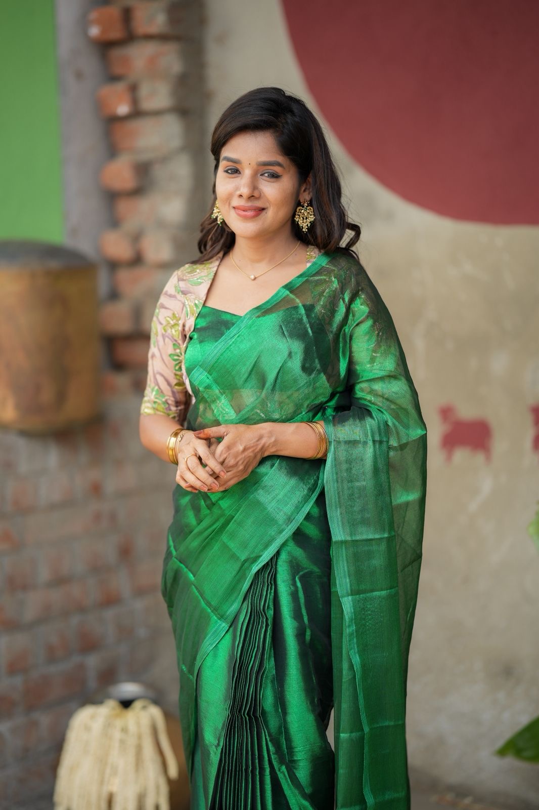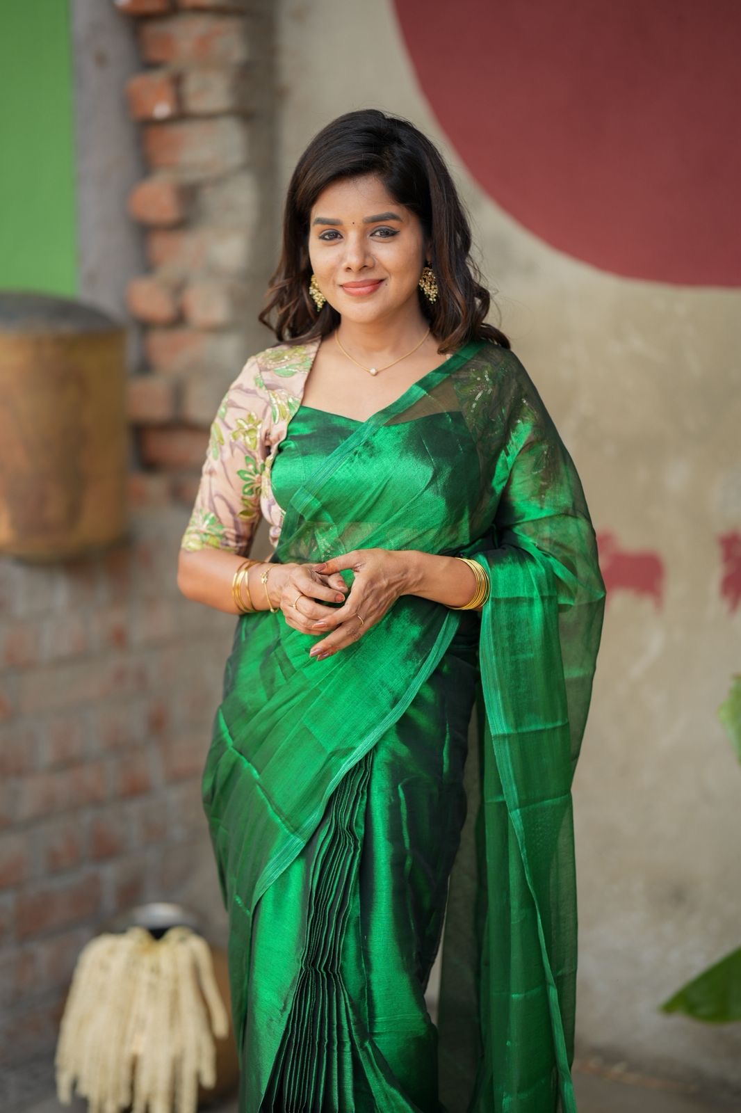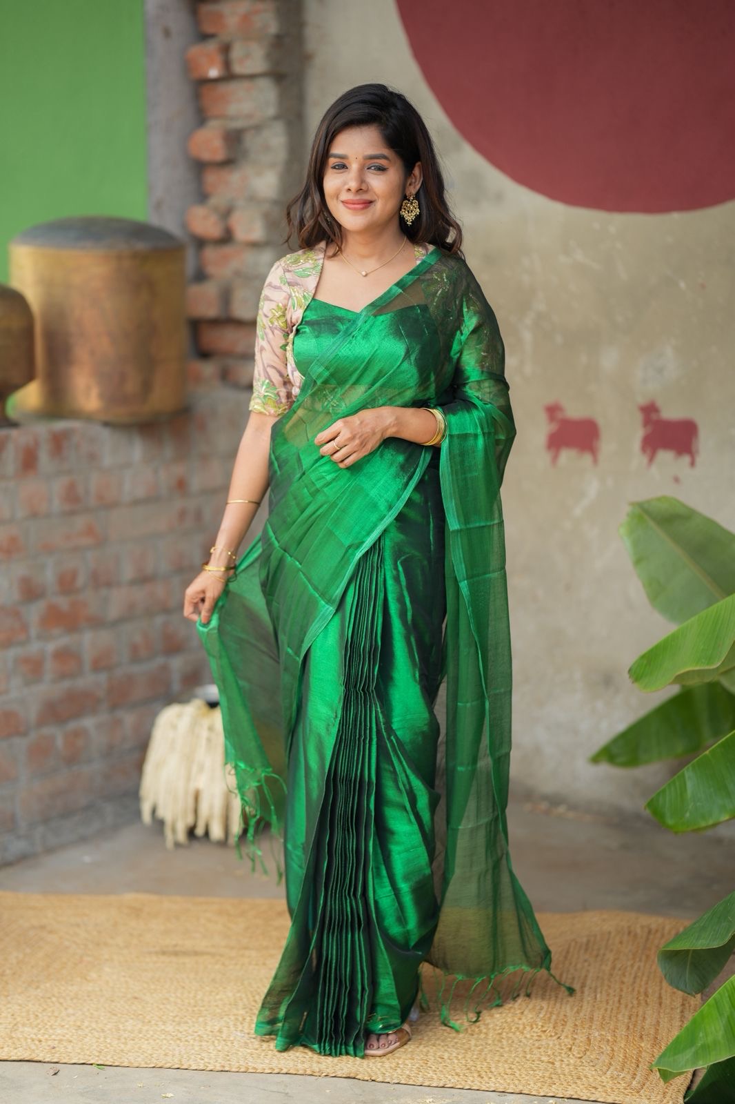 Green soft tissue saree with liquid zari border and pallu works is paired up with matching cream silk floral embroidery worked blouse as shown.