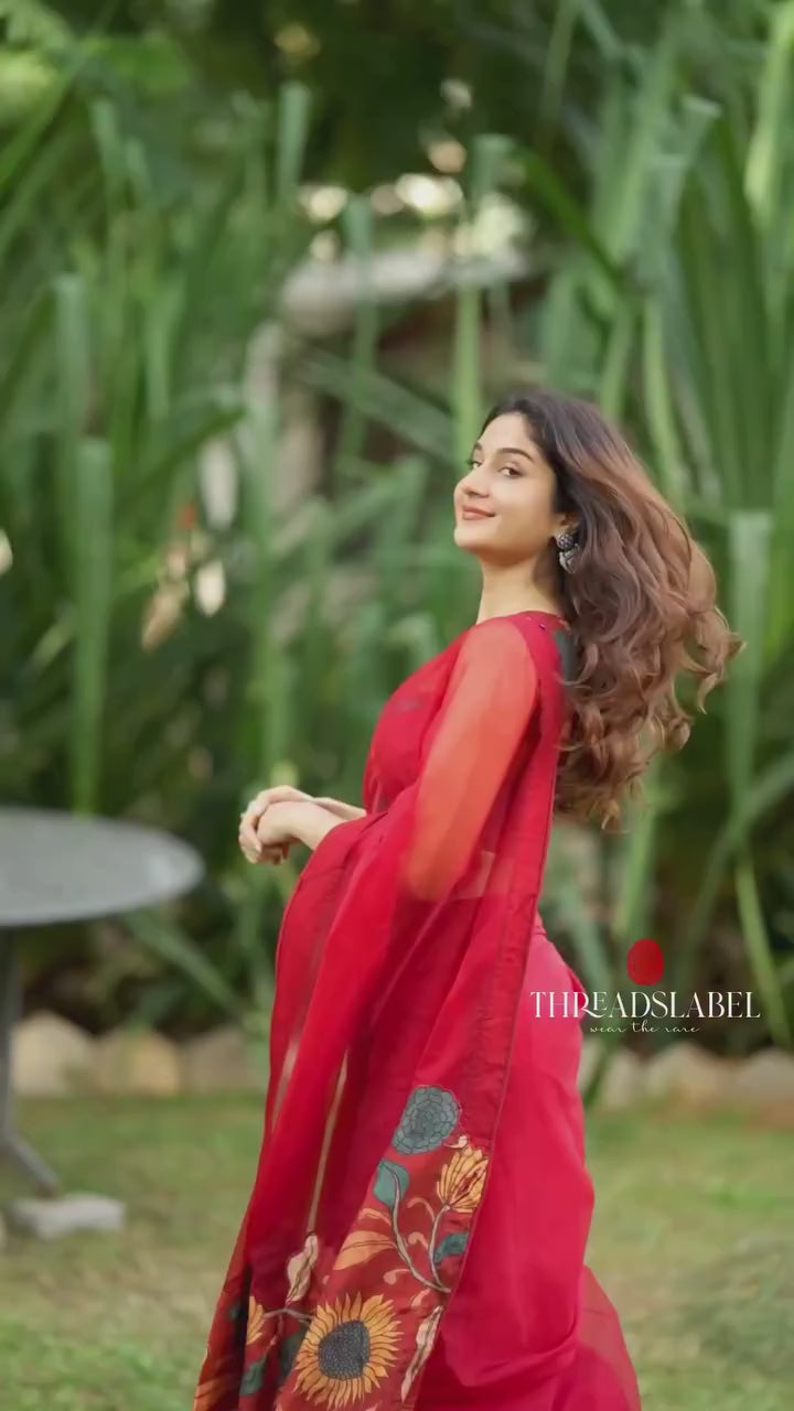 Maroon soft organza saree with kalamkari blouse