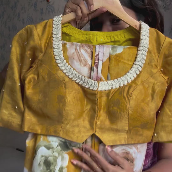 Mustard yellow marble saree with pearl work blouse