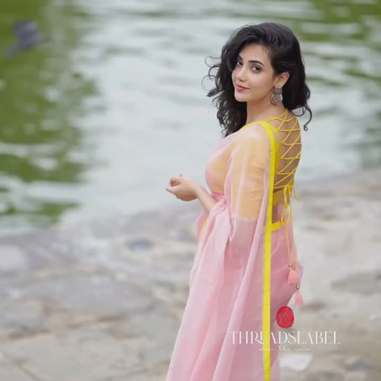 Peach organza saree with yellow hand work blouse