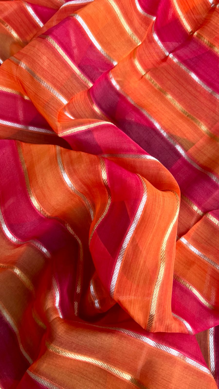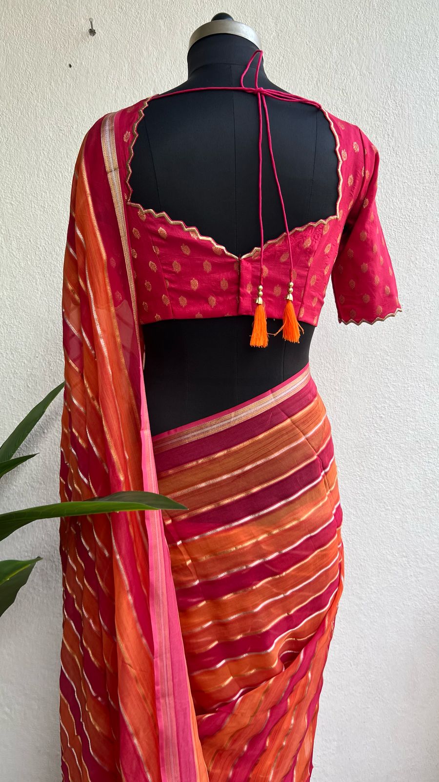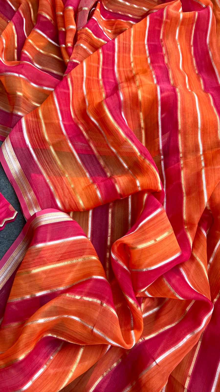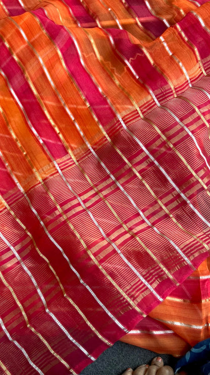Pink & orange stripped soft organza saree with banarasi hand work blouse