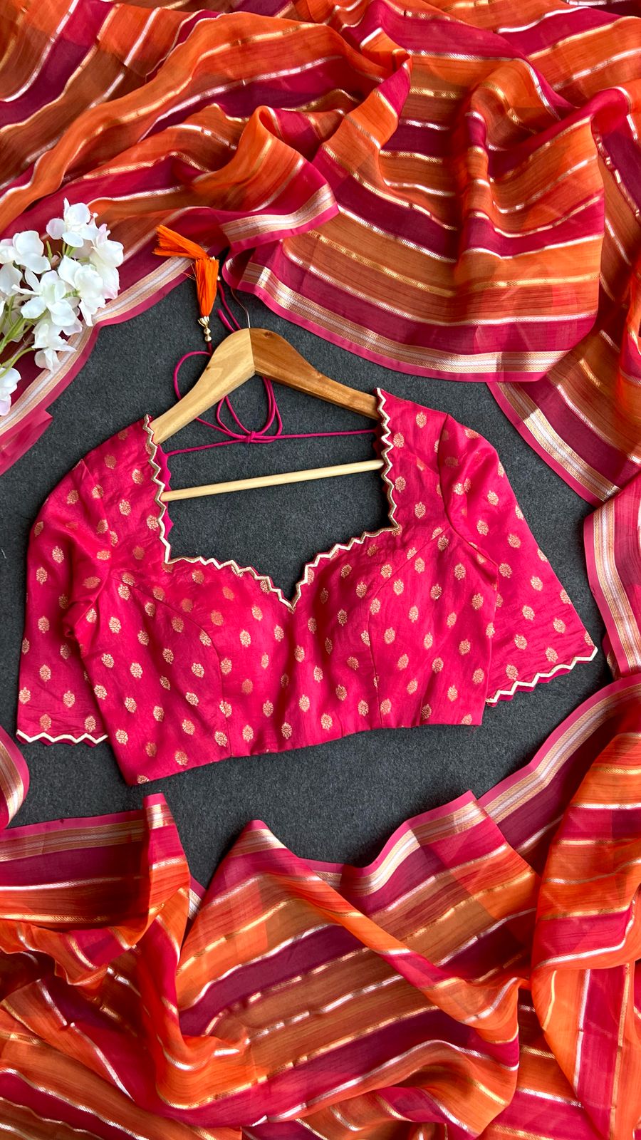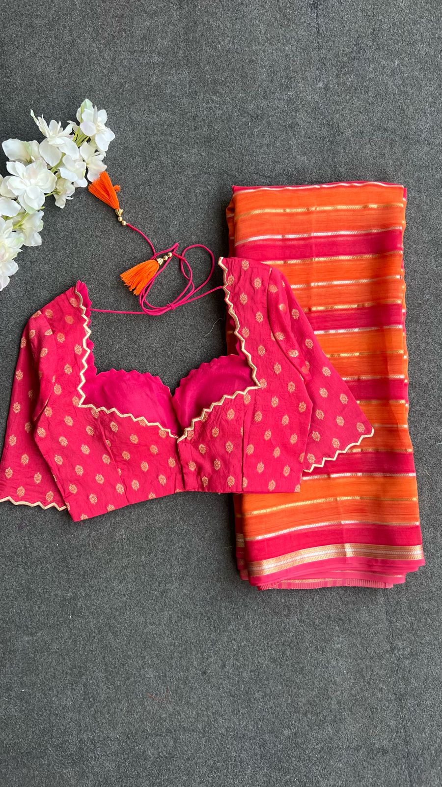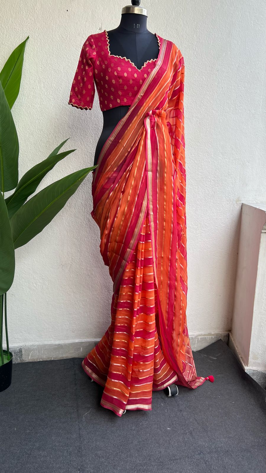 Pink & orange stripped soft organza saree with banarasi hand work blouse