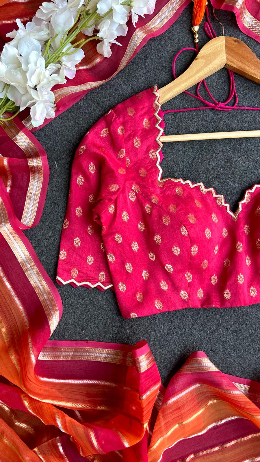 This pink & orange soft organza saree features a sequence print and is adorned with zari stripes throughout. It also includes a zari rich border and pallu. Paired with it is a deep pink banarasi silk blouse embellished with handiwork for the neck and sleeves in a scalloped pattern.
