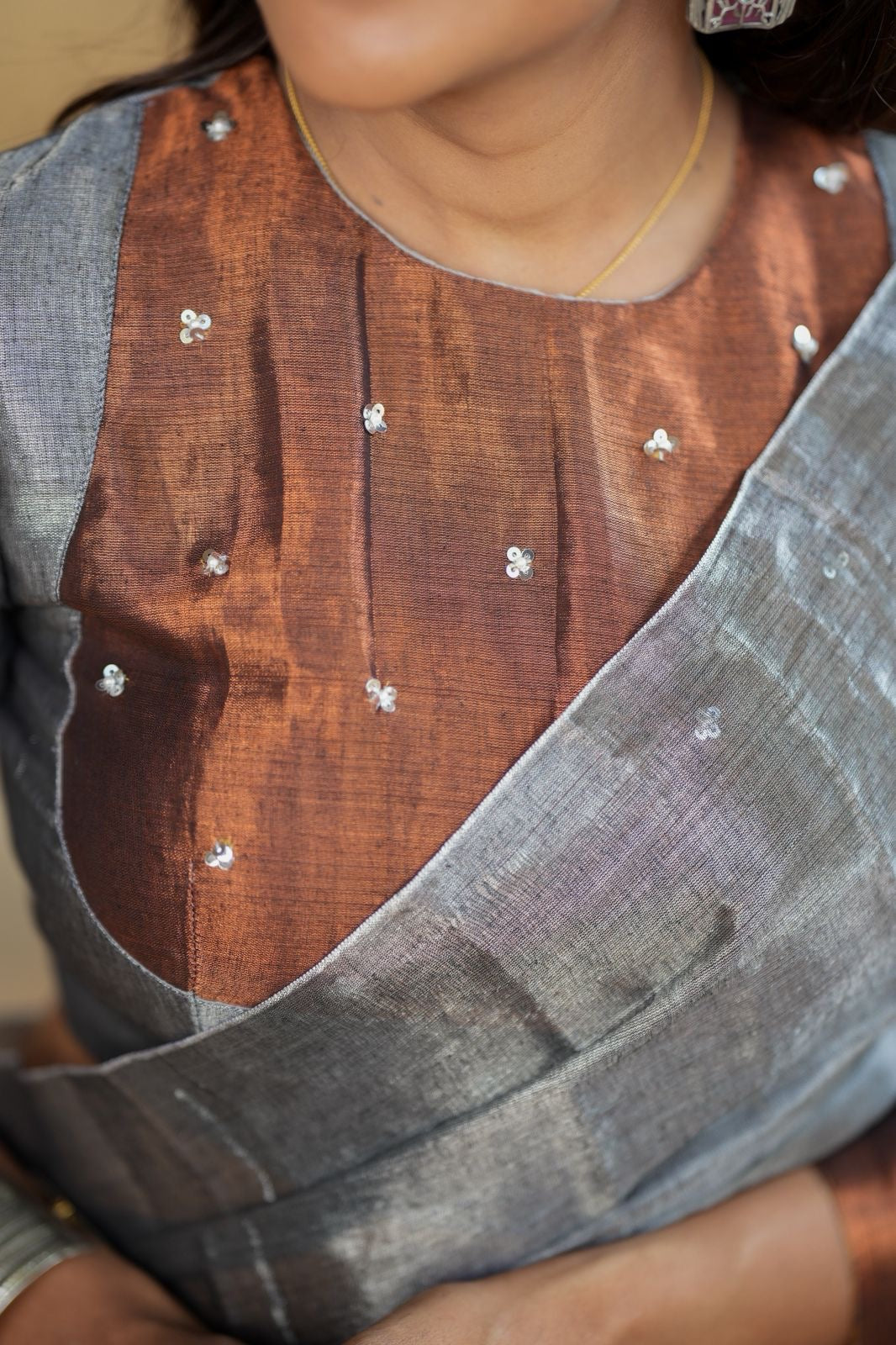 Silver grey soft tissue saree with brown liquidi border and pallu works is paired up with matching tissue patterned blouse having highlighted hand works for front as shown